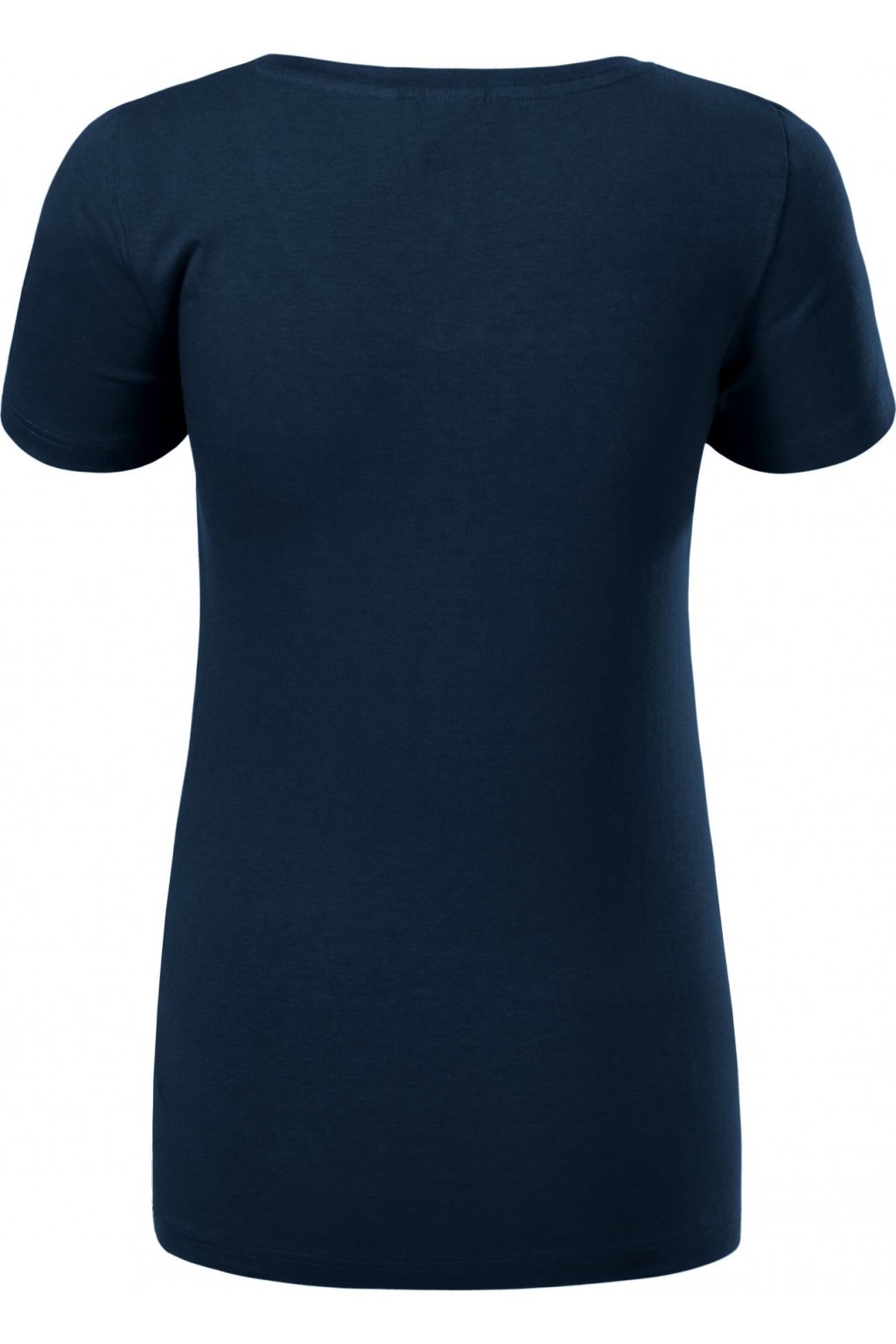 strečový materiál udržující stálost tvaru, přiléhavý střih s bočními švy, hlubší výstřih ve tvaru V, úzký lem průkrčníku z žebrového úpletu 1:1 s 5 % elastanu, vnitřní část průkrčníku začištěna kontrastní páskou, zpevnění ramenních švů páskou, krátké přiléhavé rukávy