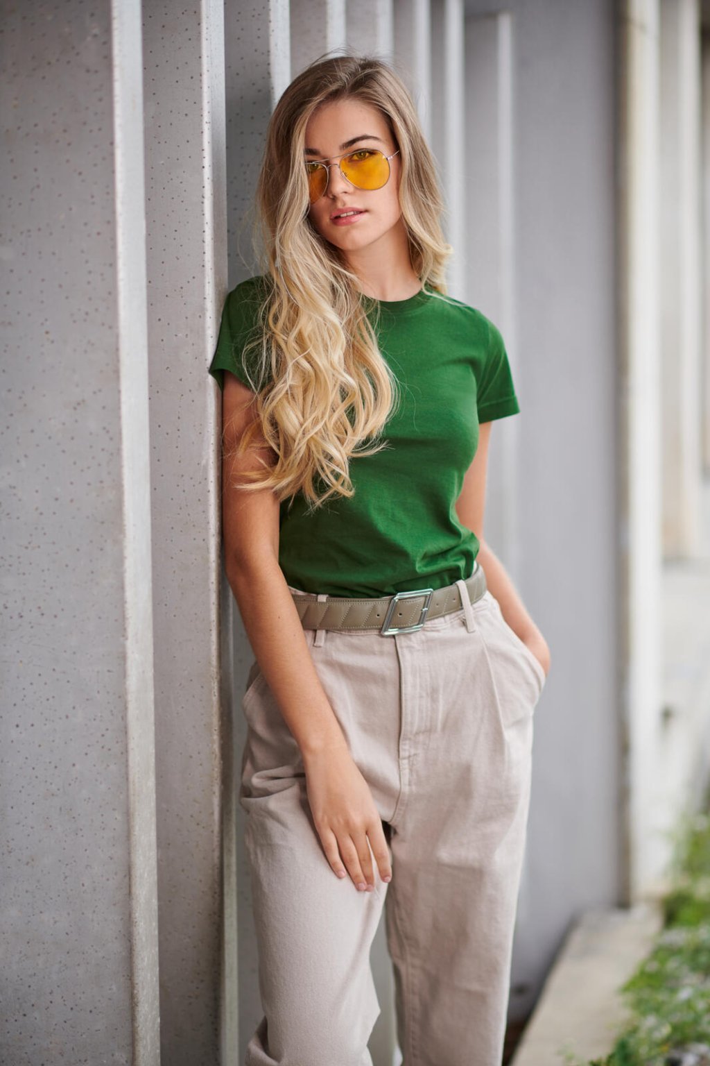lehce vypasovaný střih s bočními švy, úzký lem průkrčníku z žebrového úpletu 1:1, vnitřní část průkrčníku začištěna páskou z vrchového materiálu, zpevnění ramenních švů páskou