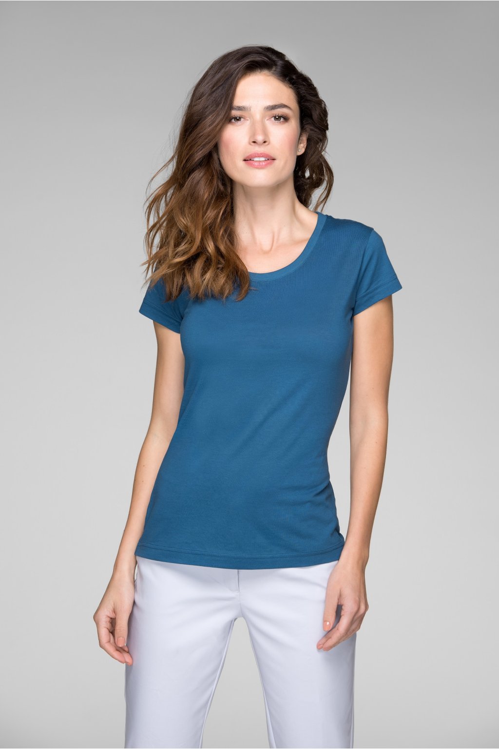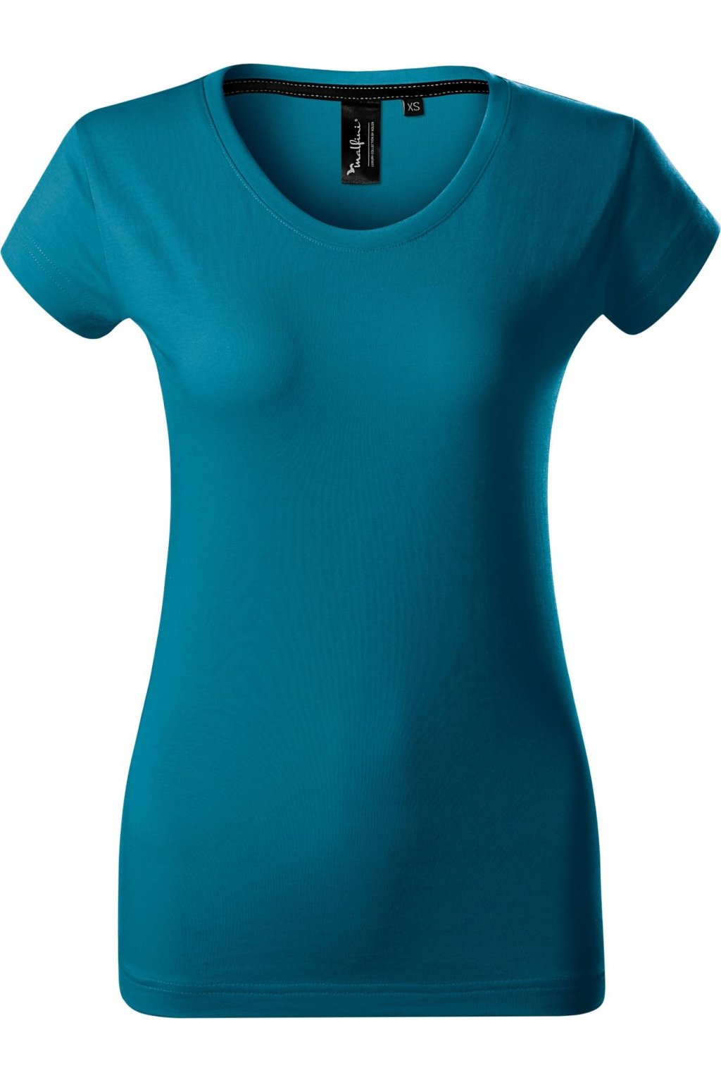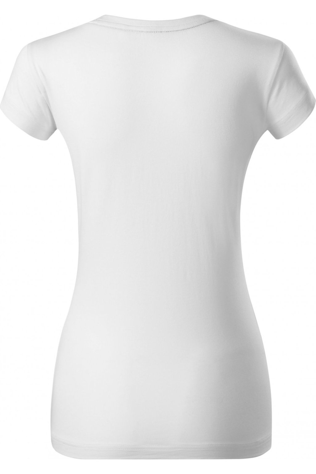 Tričko má přiléhavý dámský střih s bočními švy, hlubší kulatý výstřih a úzký lem průkrčníku z žebrového úpletu 1:1 s elastanem, což zajišťuje perfektní padnutí. Vnitřní část průkrčníku je navíc začištěna saténovou páskou, která podtrhuje prémiový charakter trička a zvyšuje komfort při nošení.