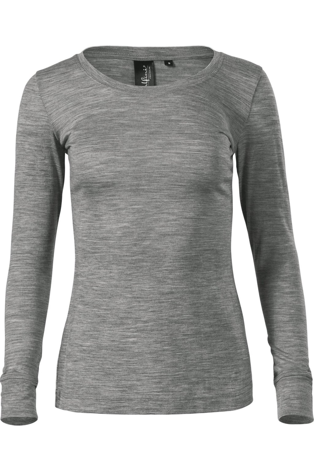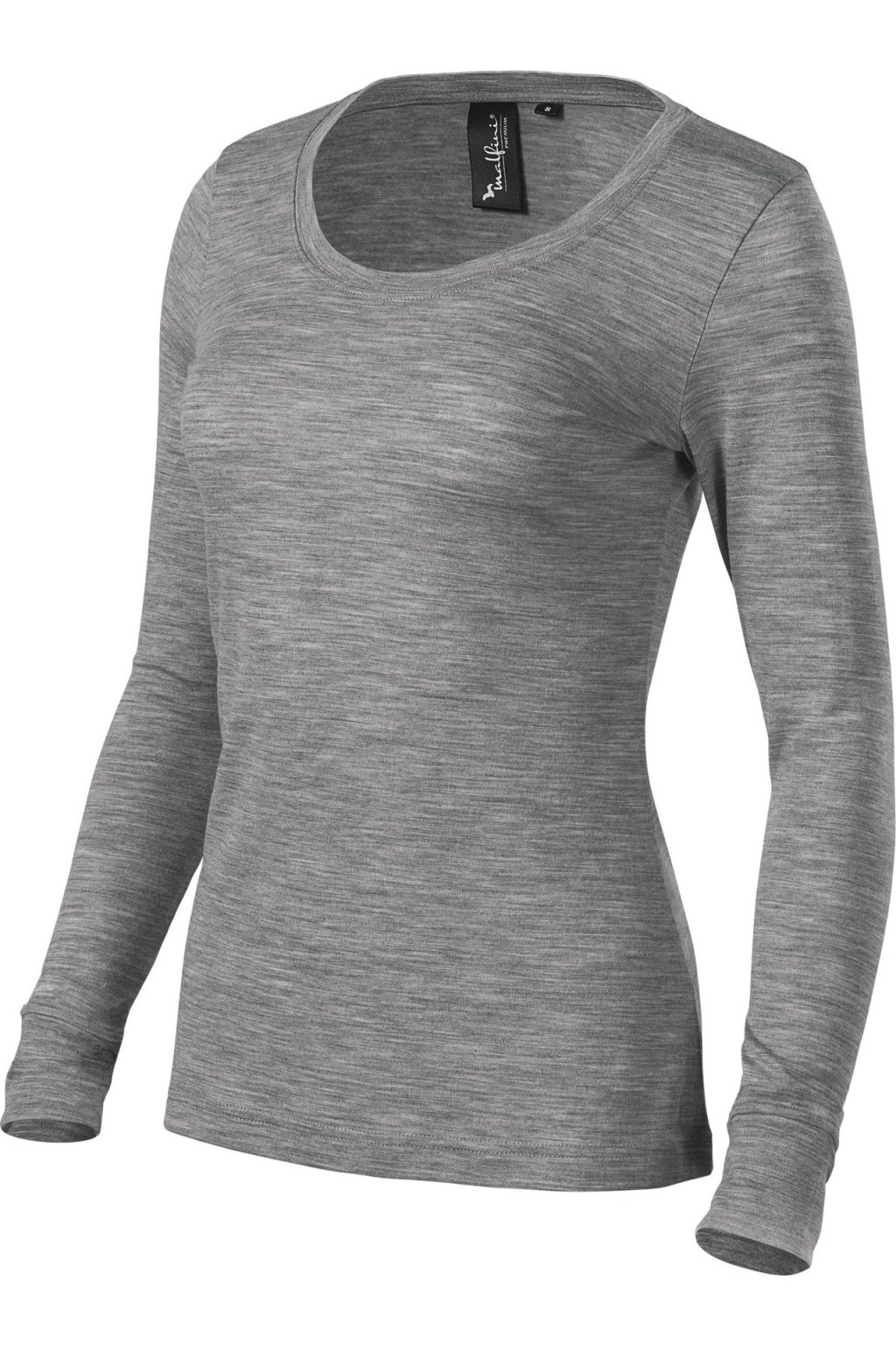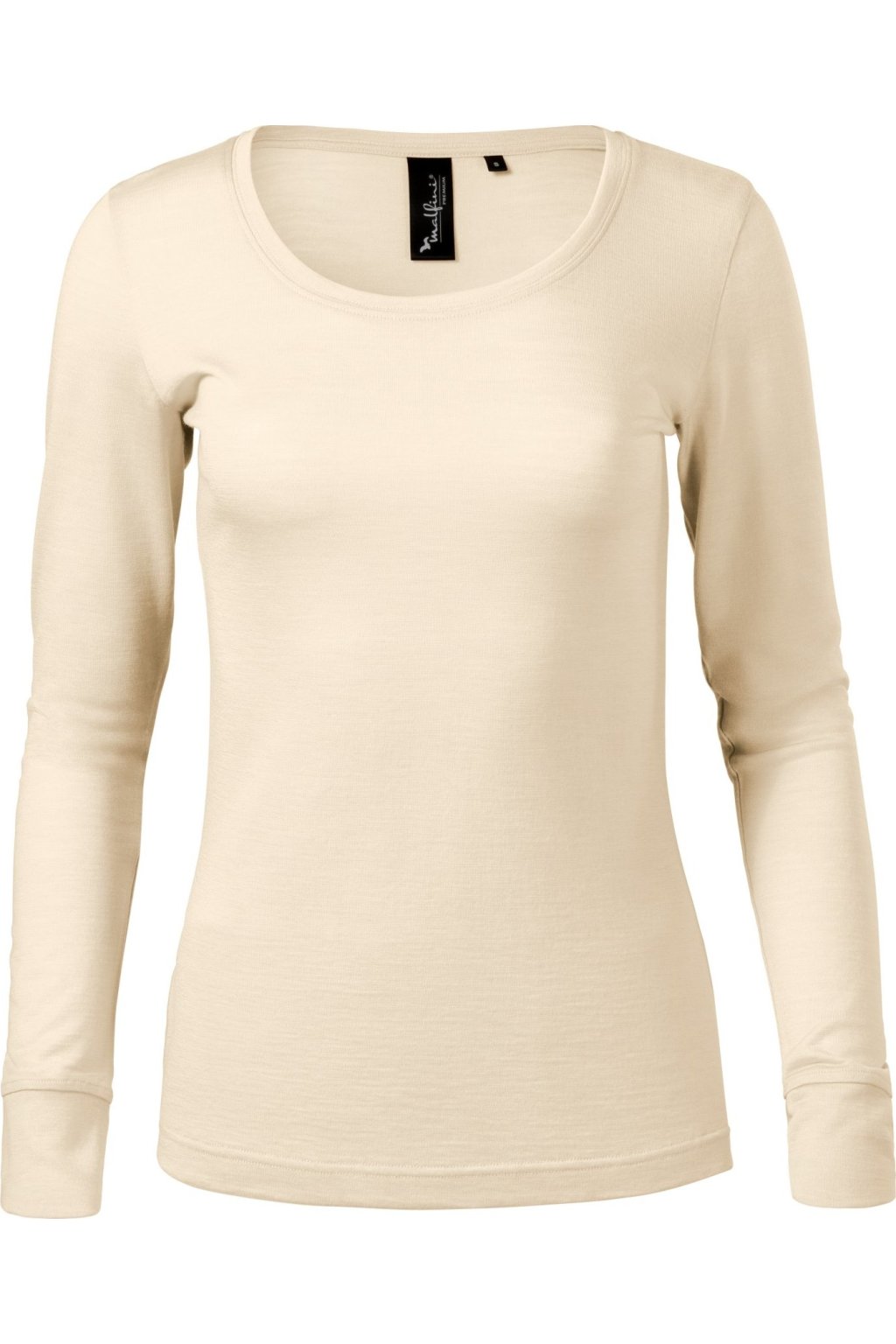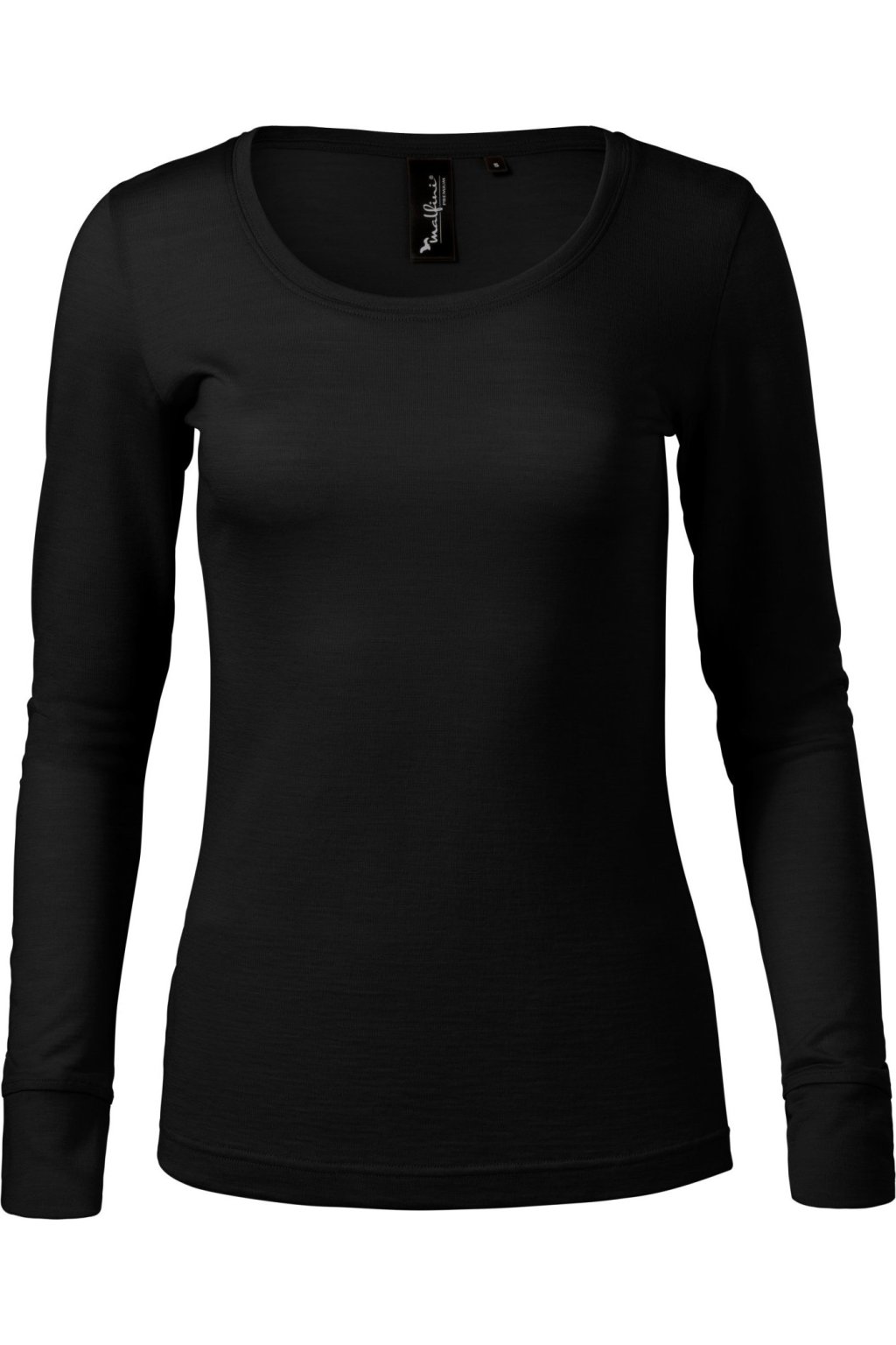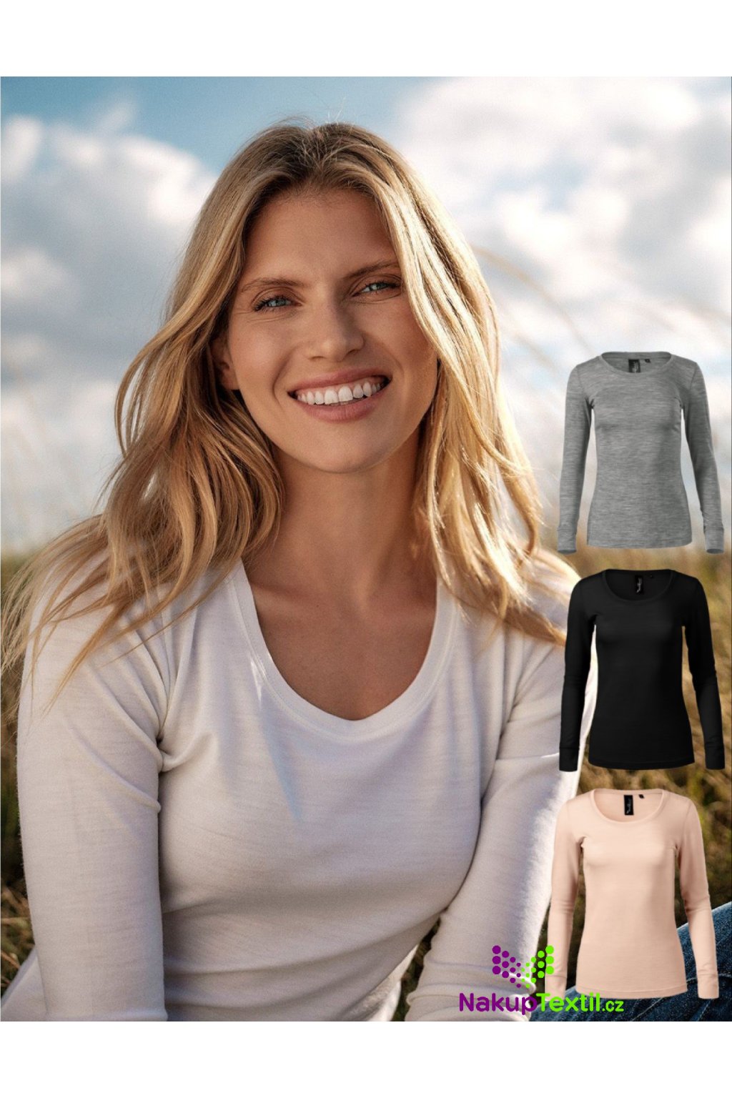 extra jemná merino vlna, nemačkavý a vysoce prodyšný materiál, termoregulační a antibakteriální vlastnosti, schopnost odvodu vlhkosti a absorpce zápachu, přiléhavý střih s bočními švy, hlubší kulatý výstřih, úzký lem průkrčníku z vrchového materiálu, vnitřní část průkrčníku začištěna páskou z vrchového materiálu, zpevnění ramenních švů páskou, dlouhé rukávy s manžetou, doporučeno sušit ve vodorovné poloze