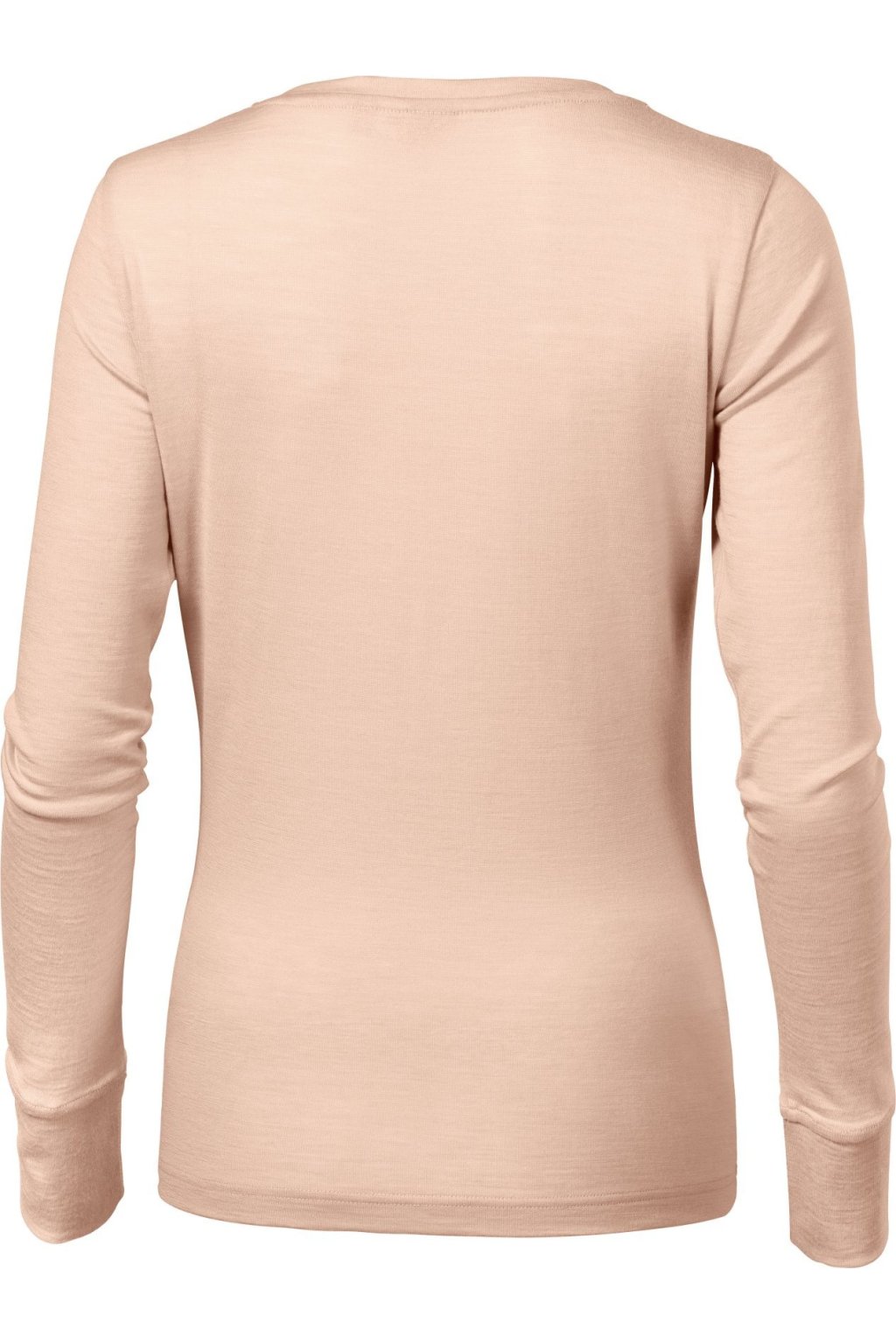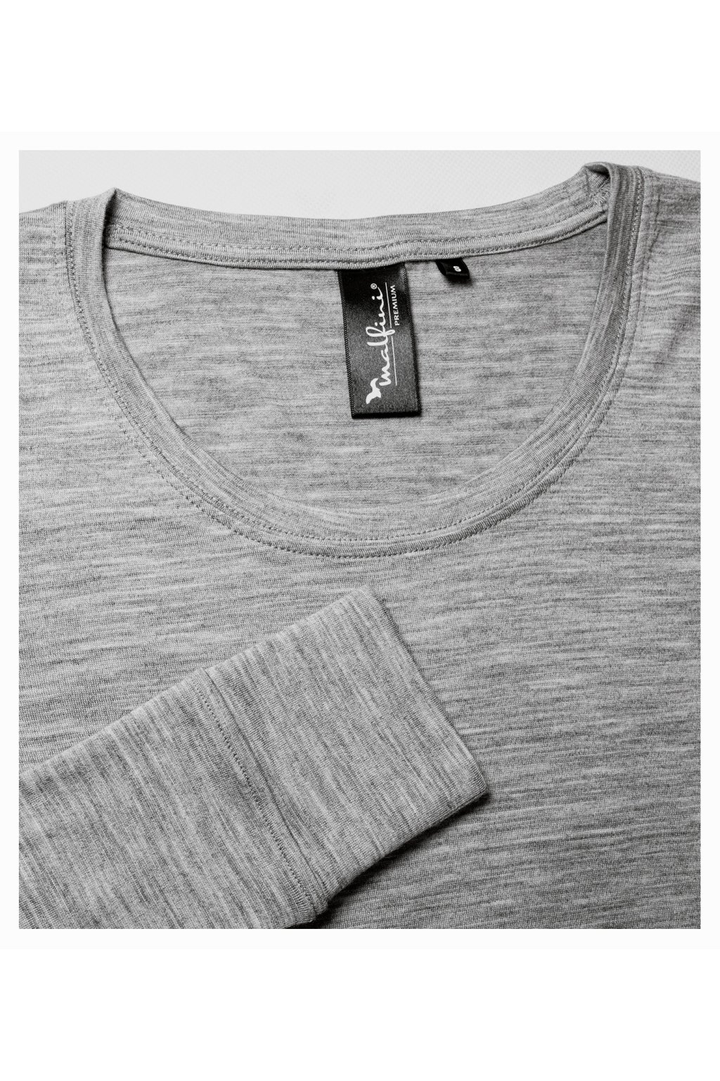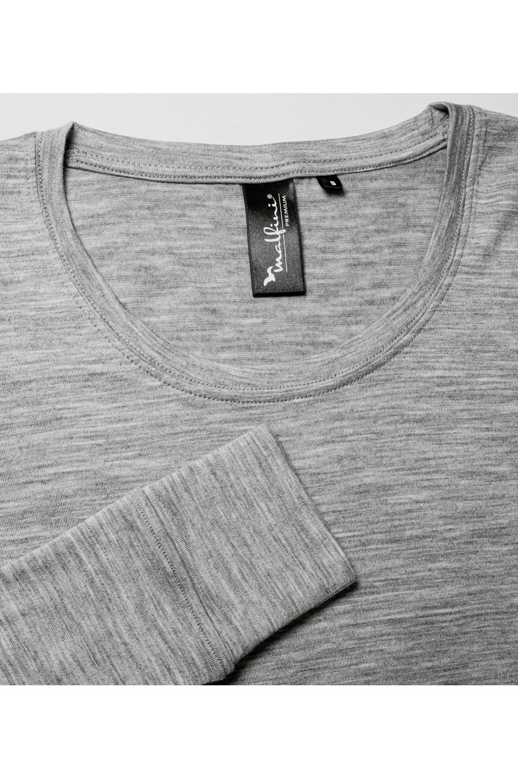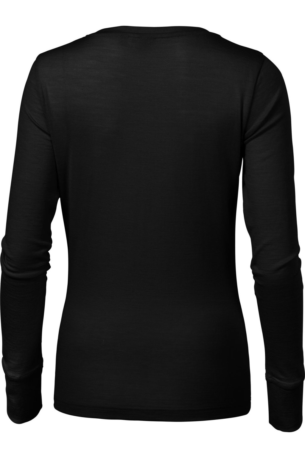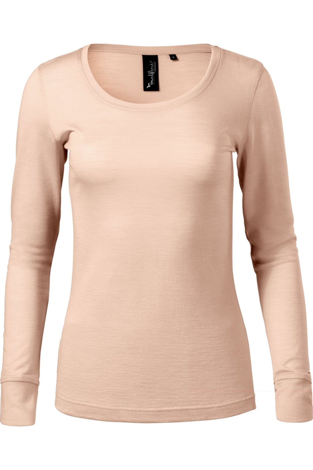 extra jemná merino vlna, nemačkavý a vysoce prodyšný materiál, termoregulační a antibakteriální vlastnosti, schopnost odvodu vlhkosti a absorpce zápachu, přiléhavý střih s bočními švy, hlubší kulatý výstřih, úzký lem průkrčníku z vrchového materiálu, vnitřní část průkrčníku začištěna páskou z vrchového materiálu, zpevnění ramenních švů páskou, dlouhé rukávy s manžetou, doporučeno sušit ve vodorovné poloze