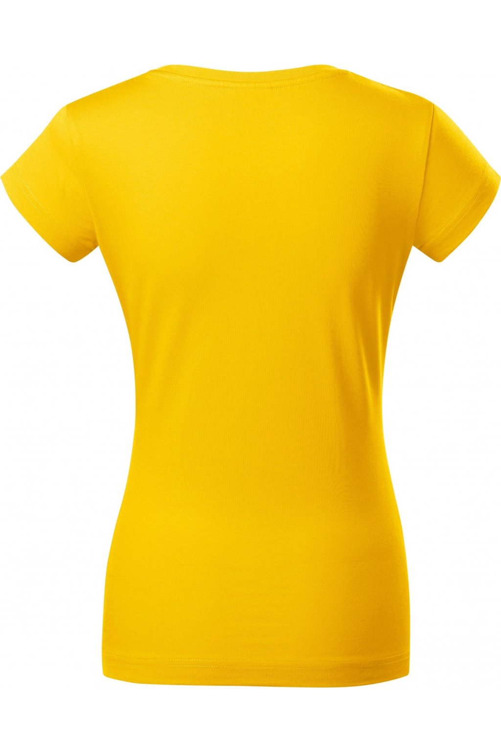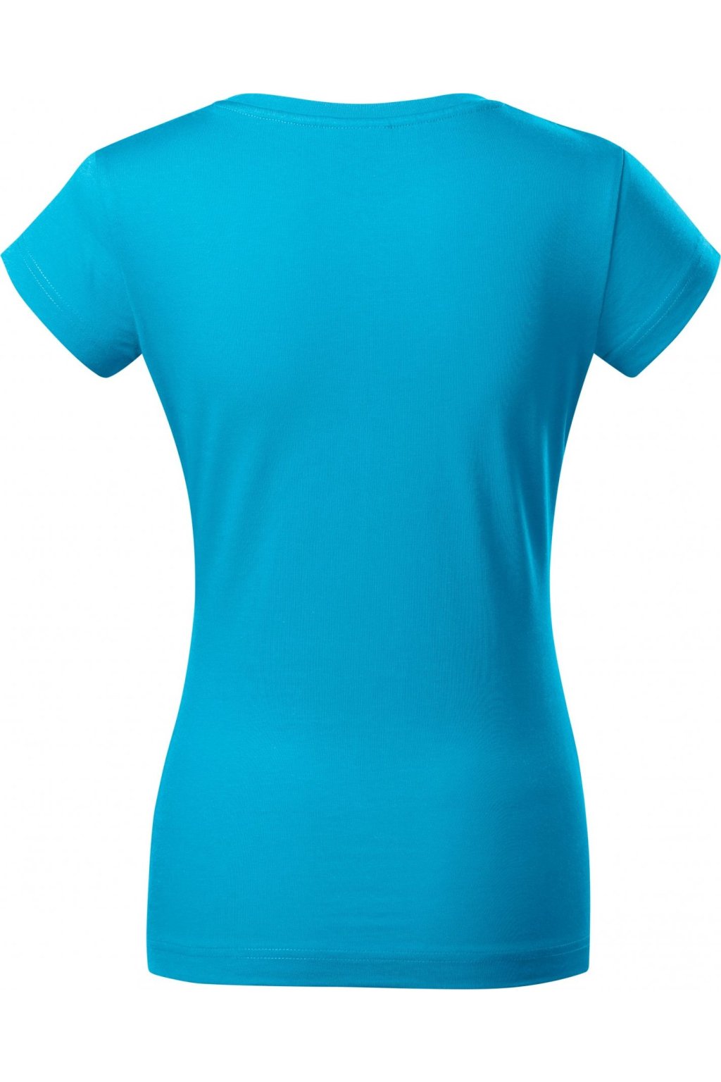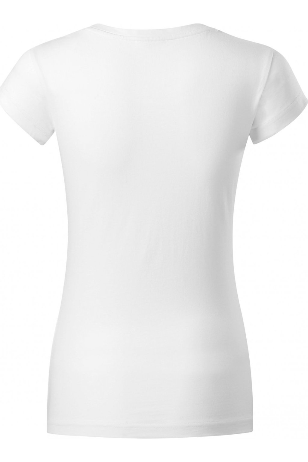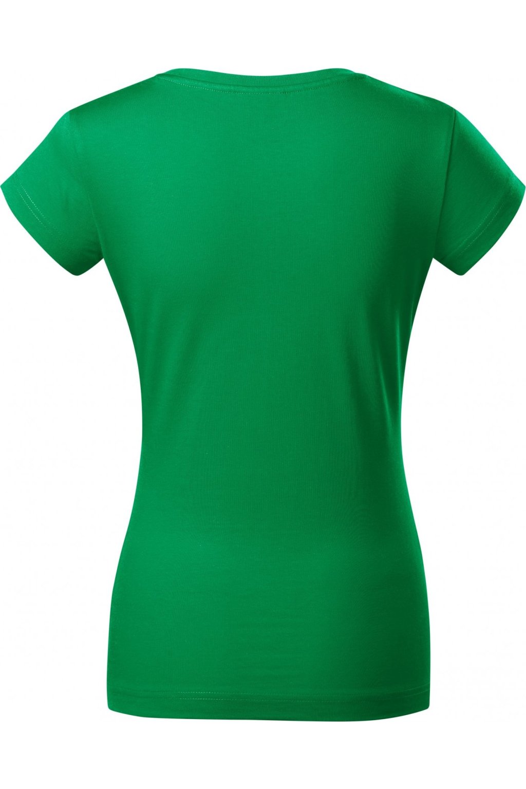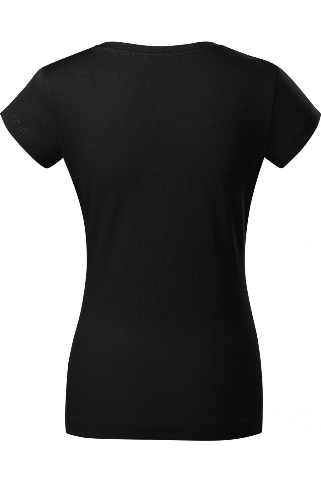lehce vypasovaný střih s bočními švy, hlubší kulatý výstřih, úzký lem průkrčníku z vrchového materiálu s 5 % elastanu, vnitřní část průkrčníku začištěna páskou z vrchového materiálu, zpevnění ramenních švů páskou, rukávy kratší délky, silikonová úprava