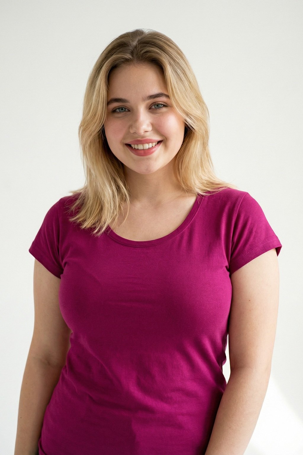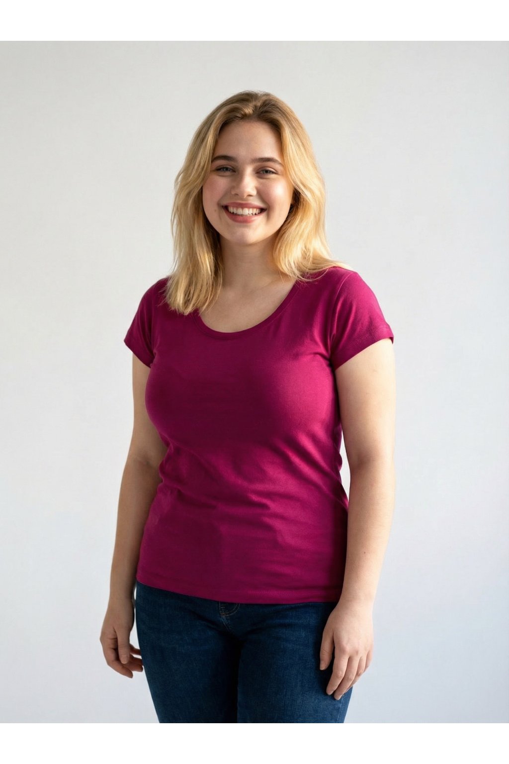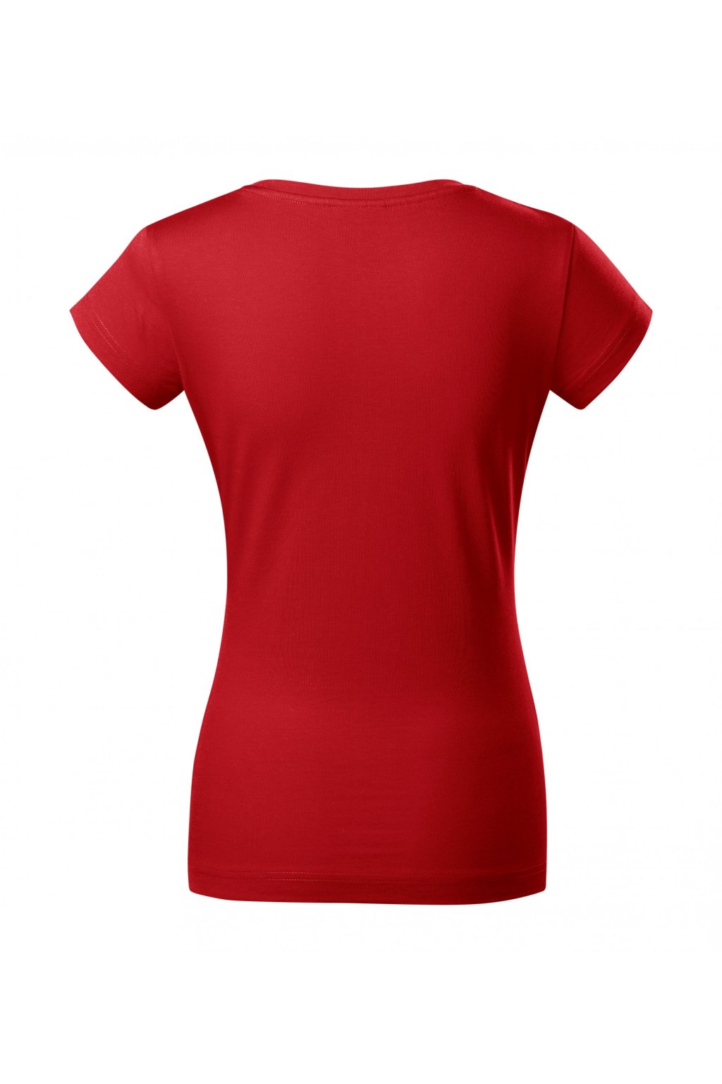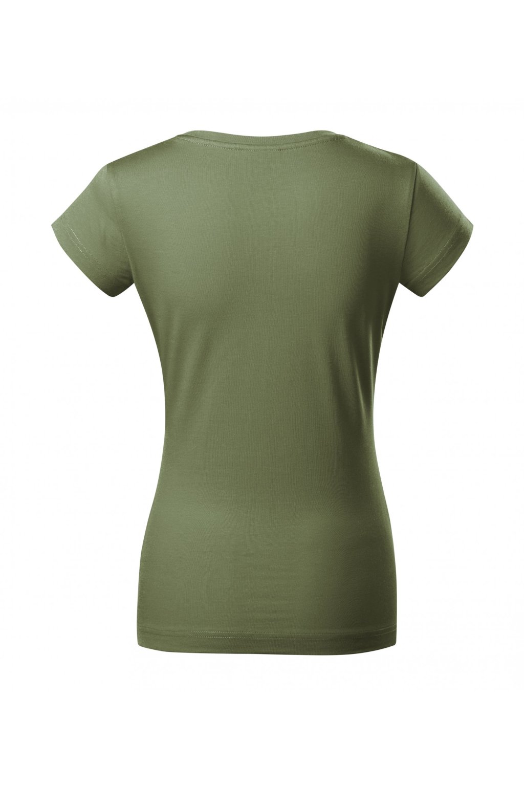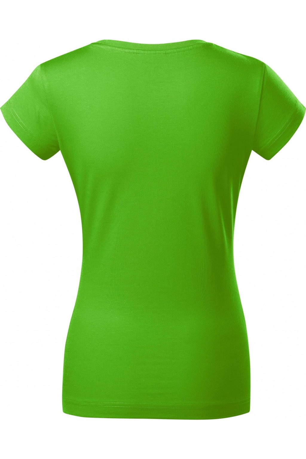 lehce vypasovaný střih s bočními švy, hlubší kulatý výstřih, úzký lem průkrčníku z vrchového materiálu s 5 % elastanu, vnitřní část průkrčníku začištěna páskou z vrchového materiálu, zpevnění ramenních švů páskou, rukávy kratší délky, silikonová úprava