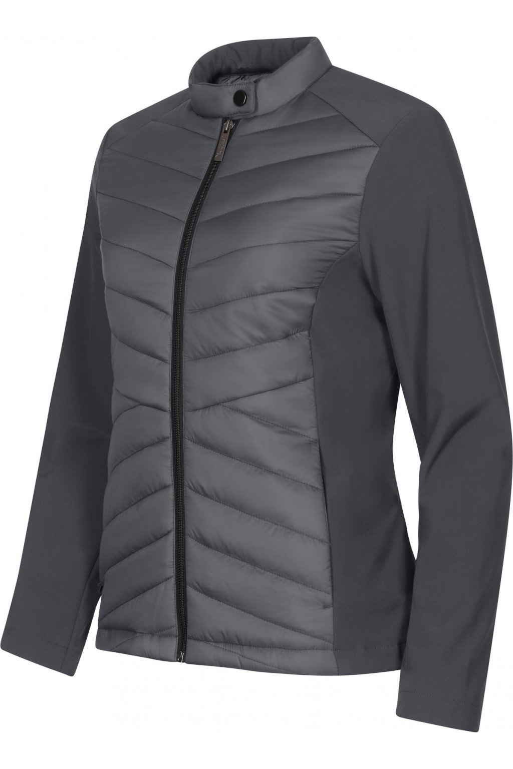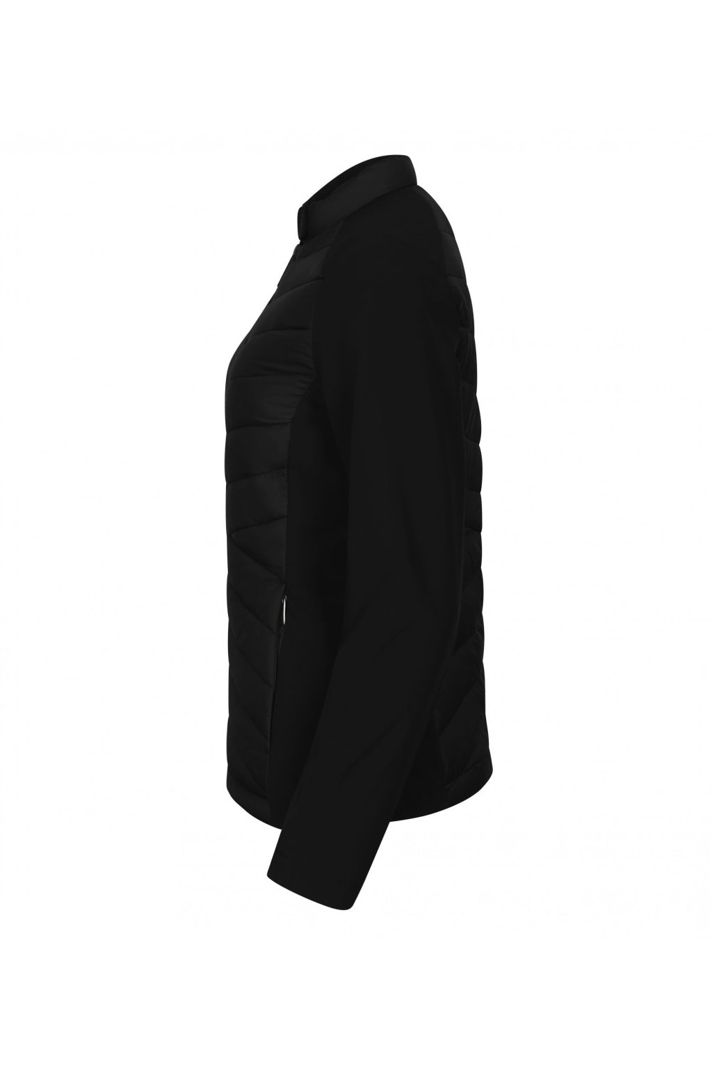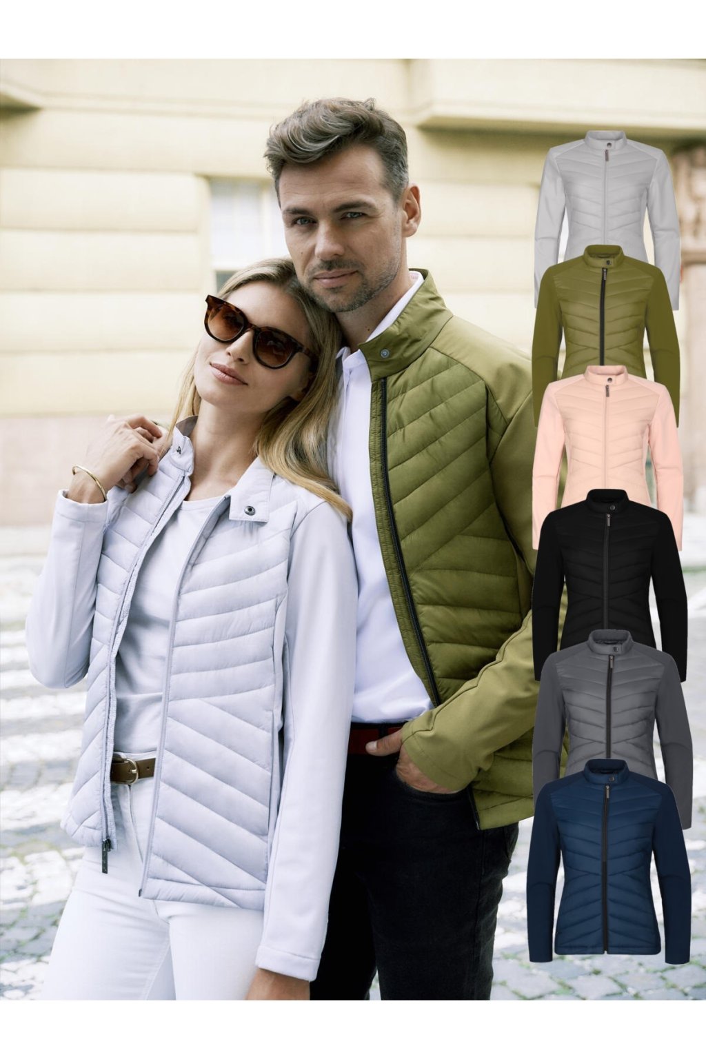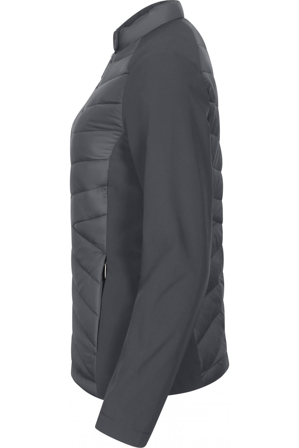 kombinace prošívaného a softshellového materiálu, střih tvarovaný bočními díly, stojáček na druk, celopropínací spirálový zip, boční kapsy se spirálovým zipem, vnitřní náprsní kapsa na zip, vstup pro branding v podšívce zadního dílu