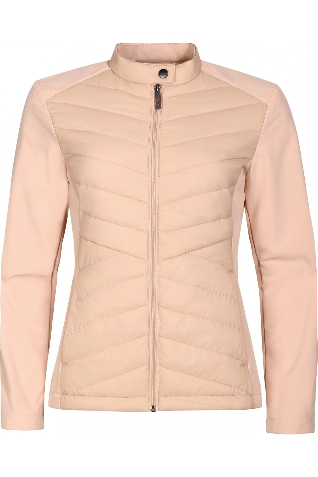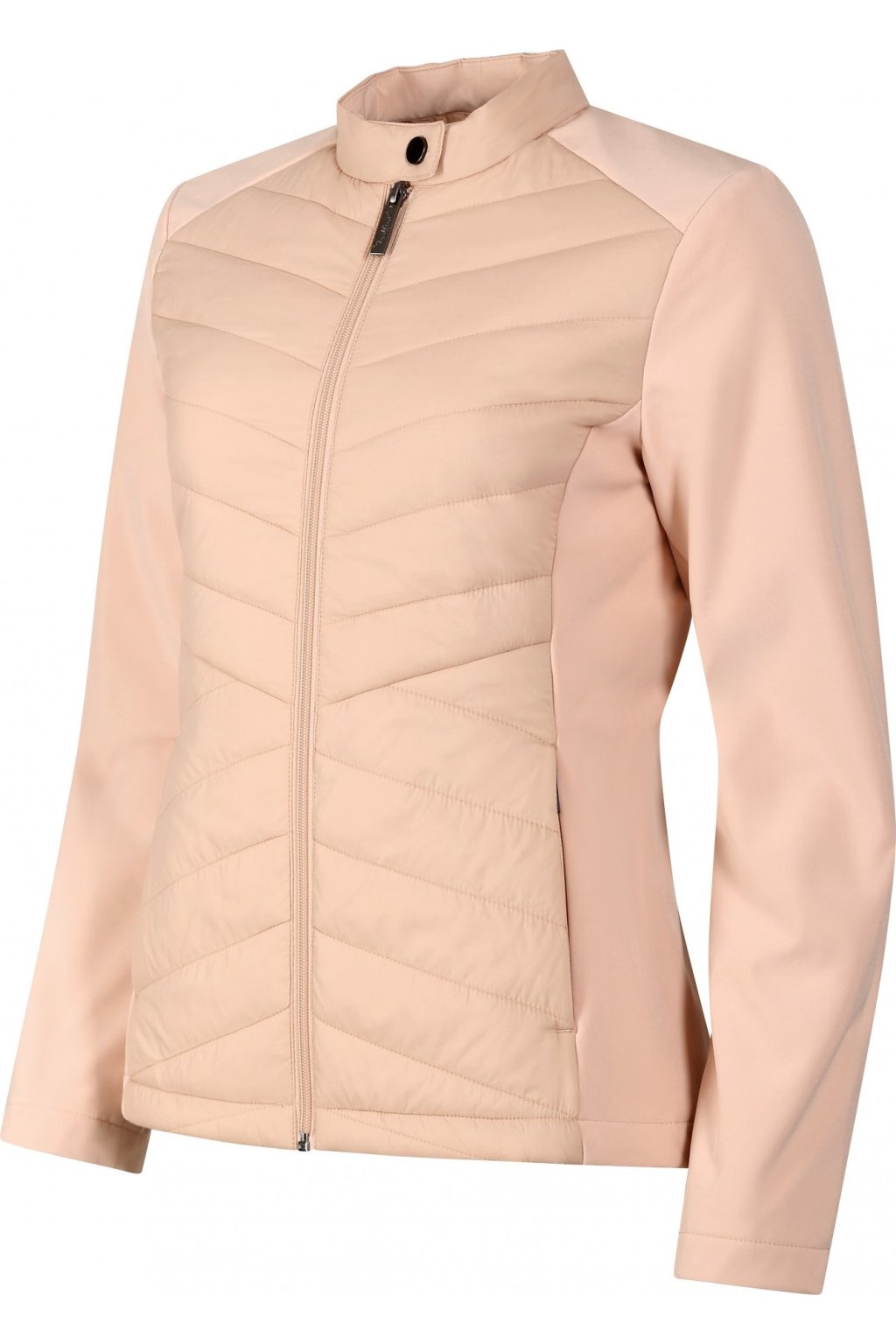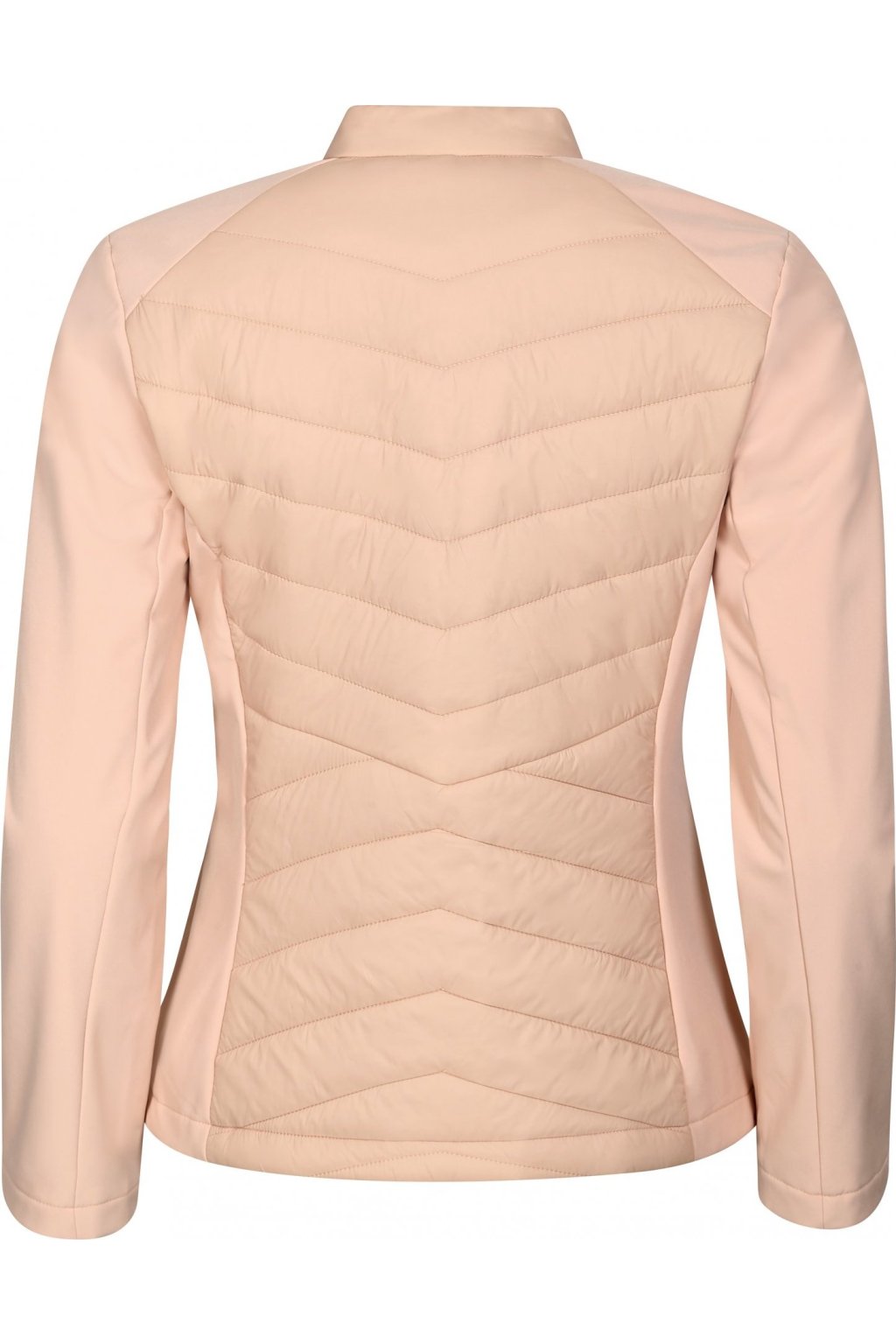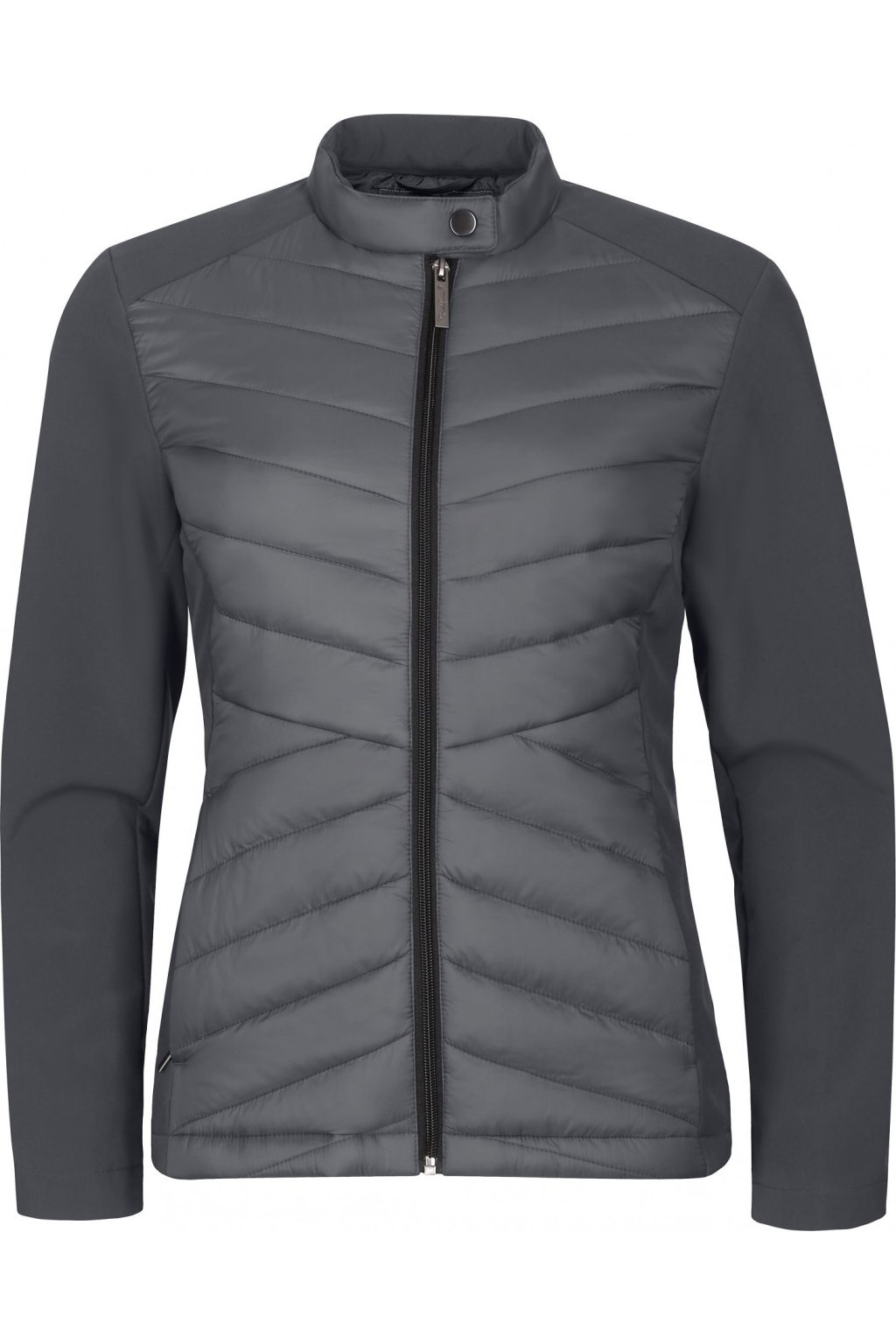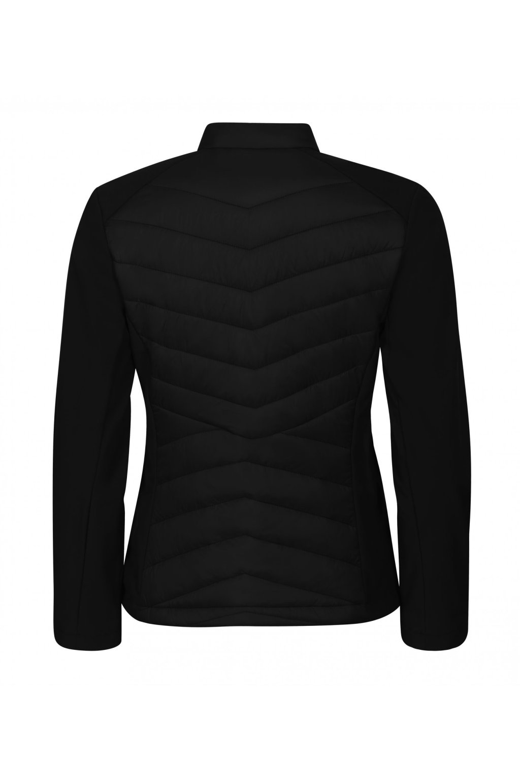 kombinace prošívaného a softshellového materiálu, střih tvarovaný bočními díly, stojáček na druk, celopropínací spirálový zip, boční kapsy se spirálovým zipem, vnitřní náprsní kapsa na zip, vstup pro branding v podšívce zadního dílu