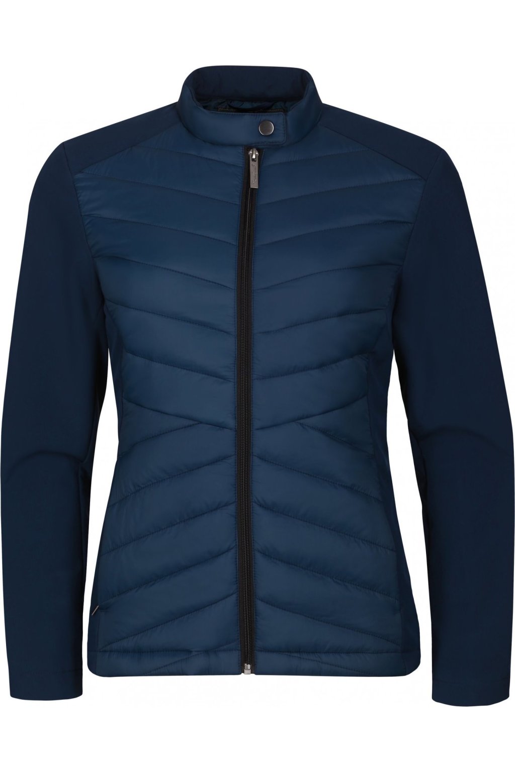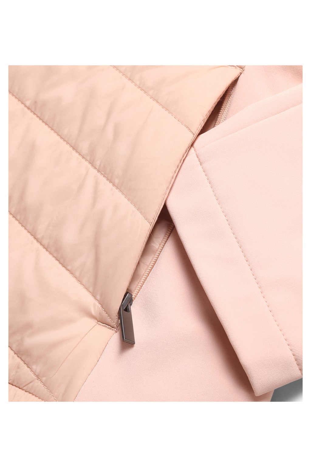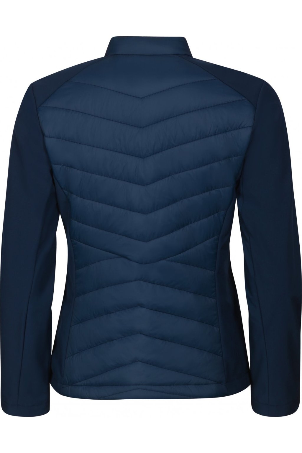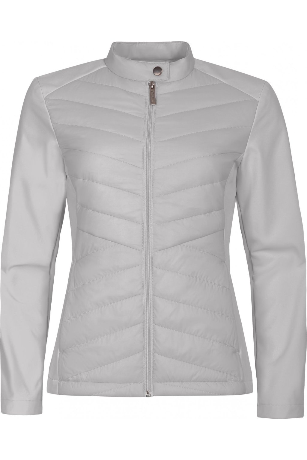 kombinace prošívaného a softshellového materiálu, střih tvarovaný bočními díly, stojáček na druk, celopropínací spirálový zip, boční kapsy se spirálovým zipem, vnitřní náprsní kapsa na zip, vstup pro branding v podšívce zadního dílu