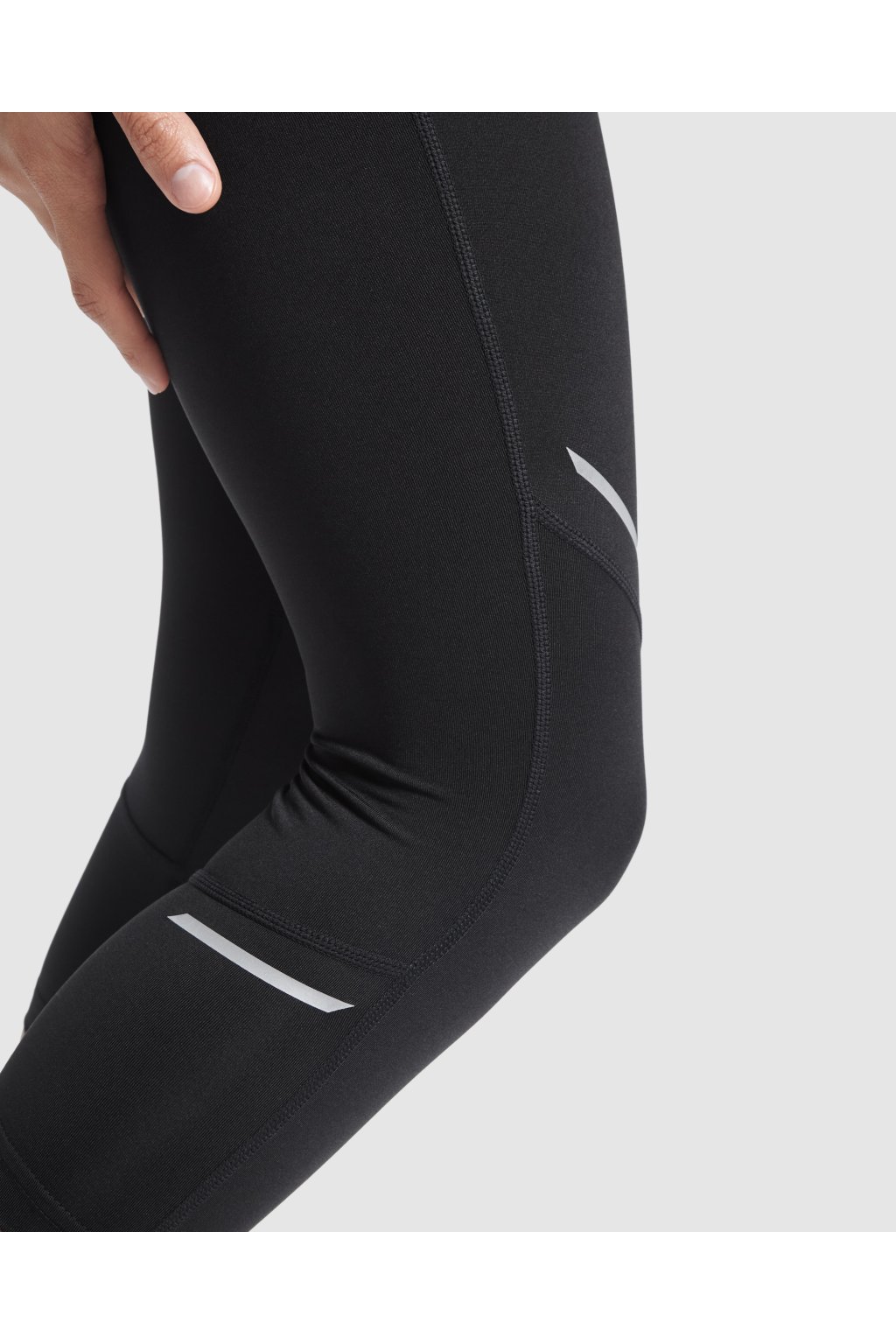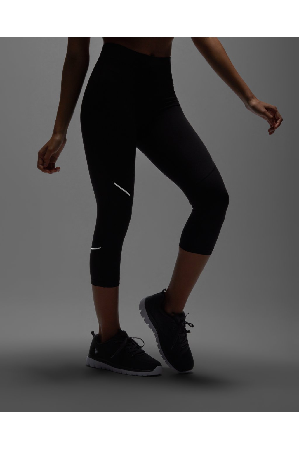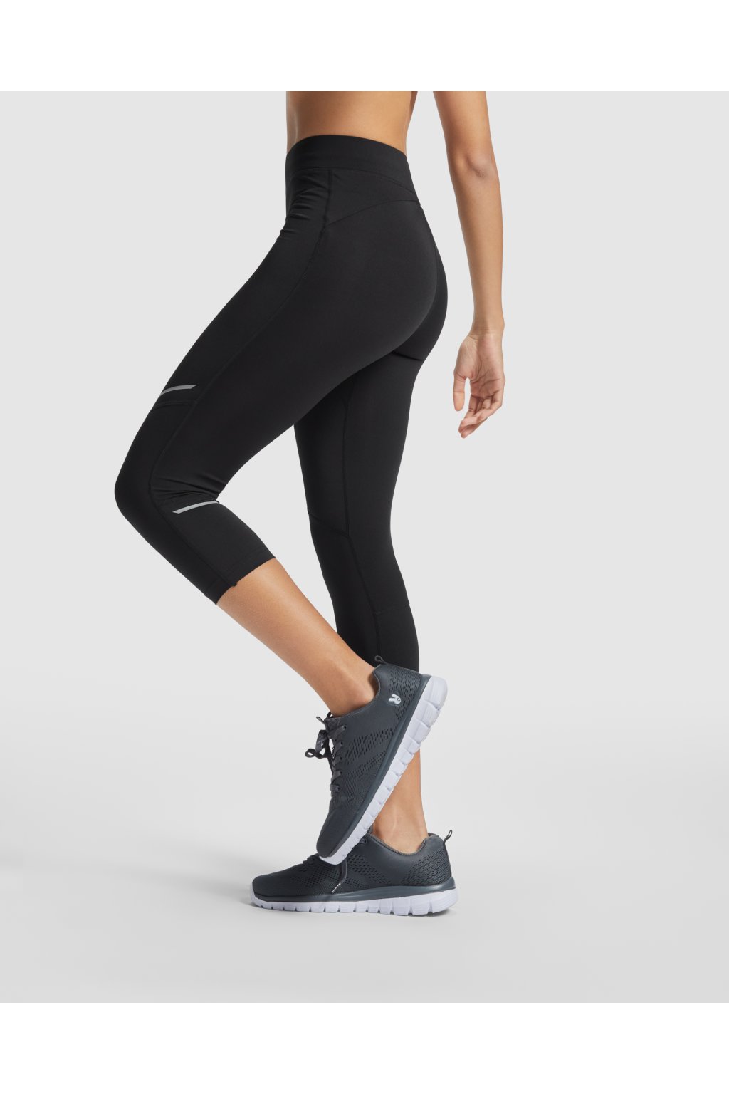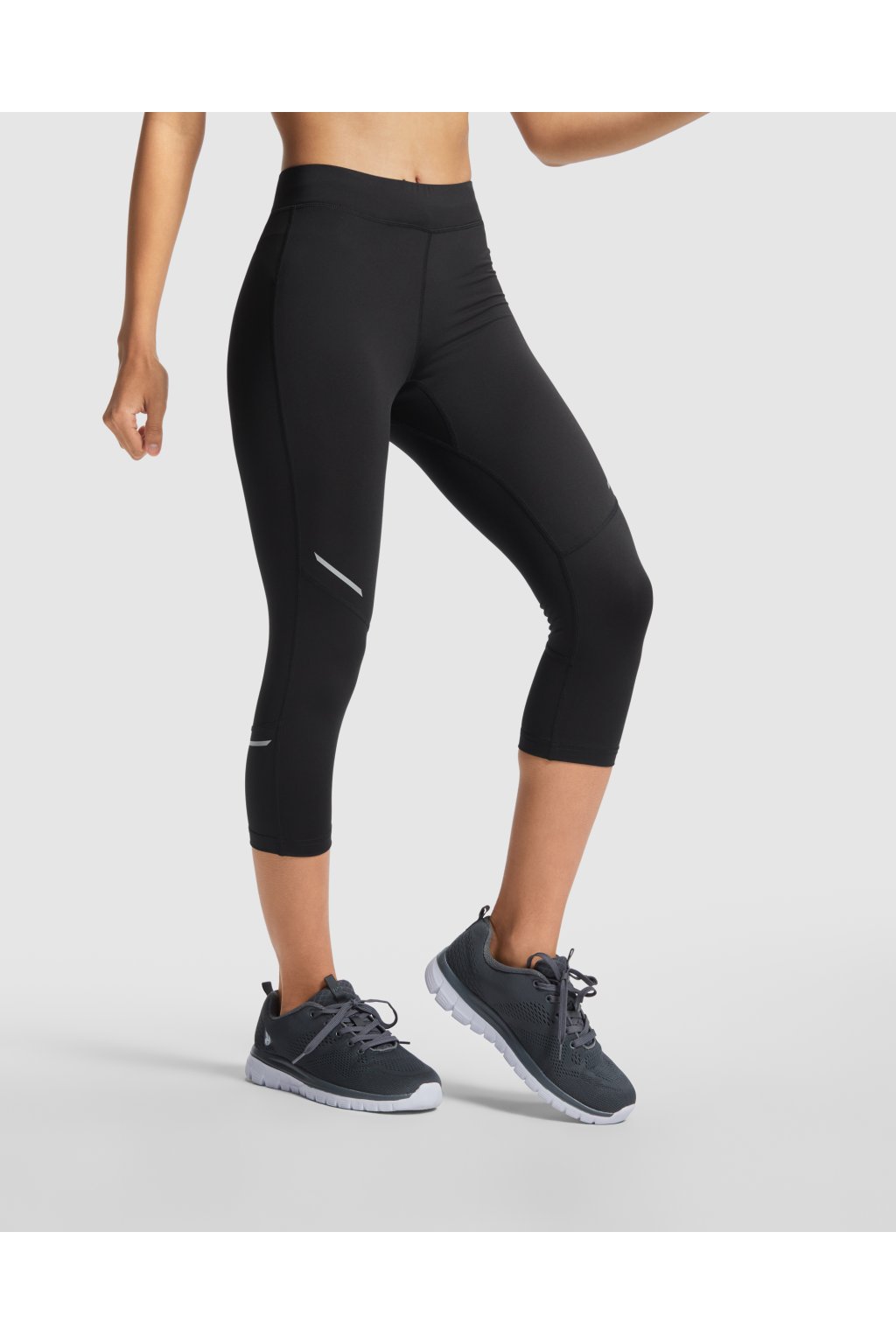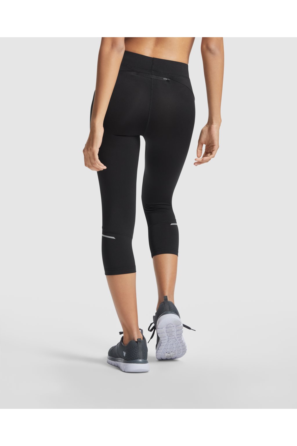 Dámské sportovní legíny do poloviny stehen. Elastický pas s vnitřní stahovací překříženou šňůrkou pro snadnější upevnění. Reflexní detaily. Vnější kapsa na zip na zadní straně.