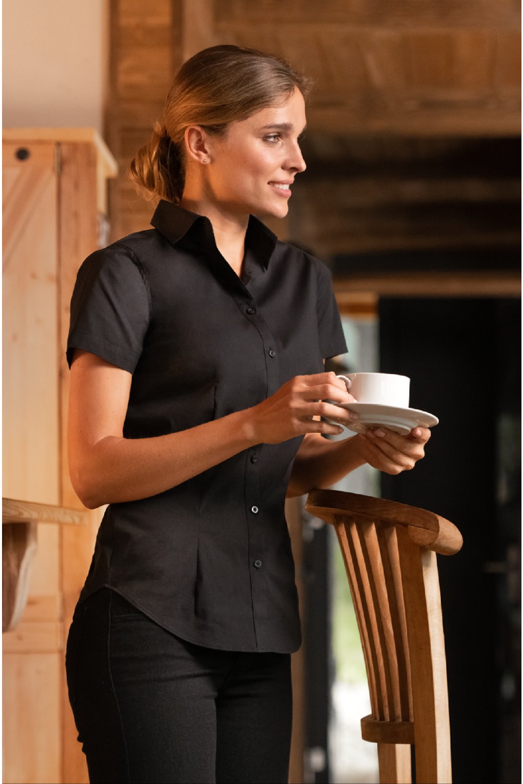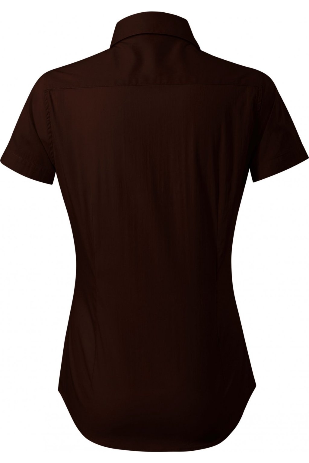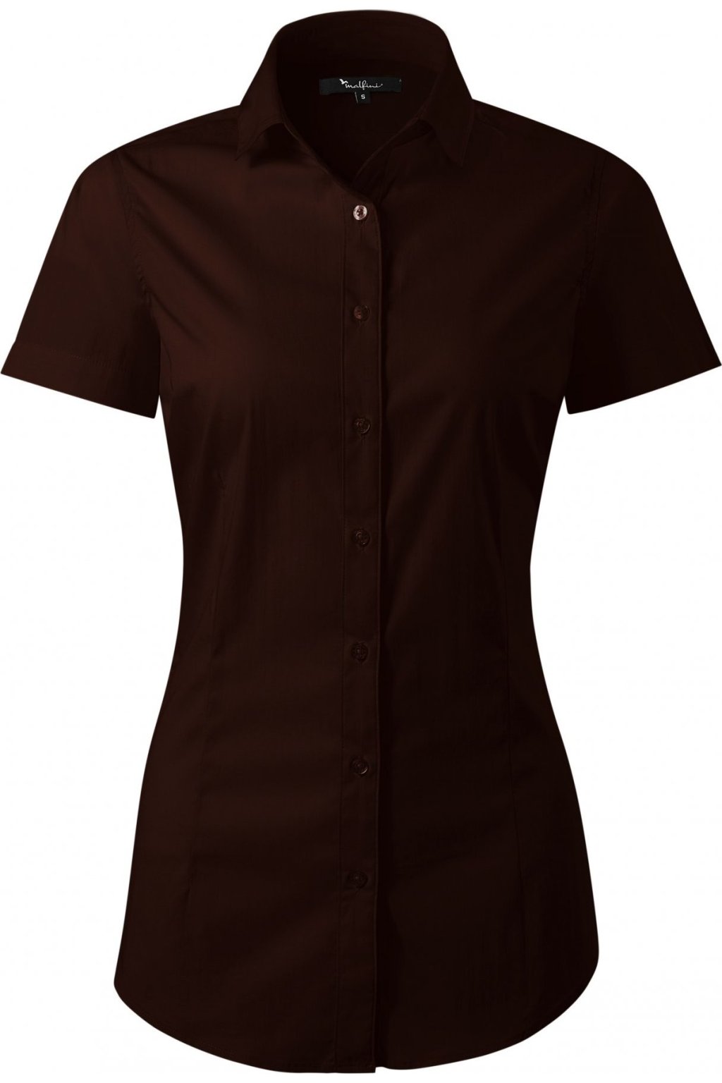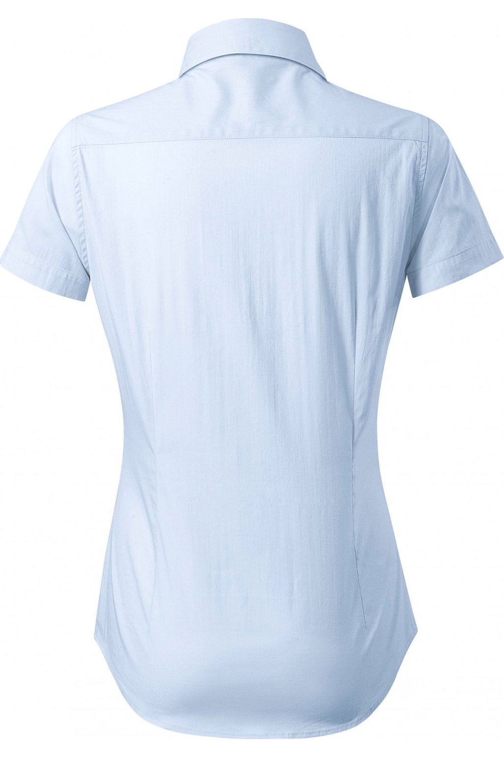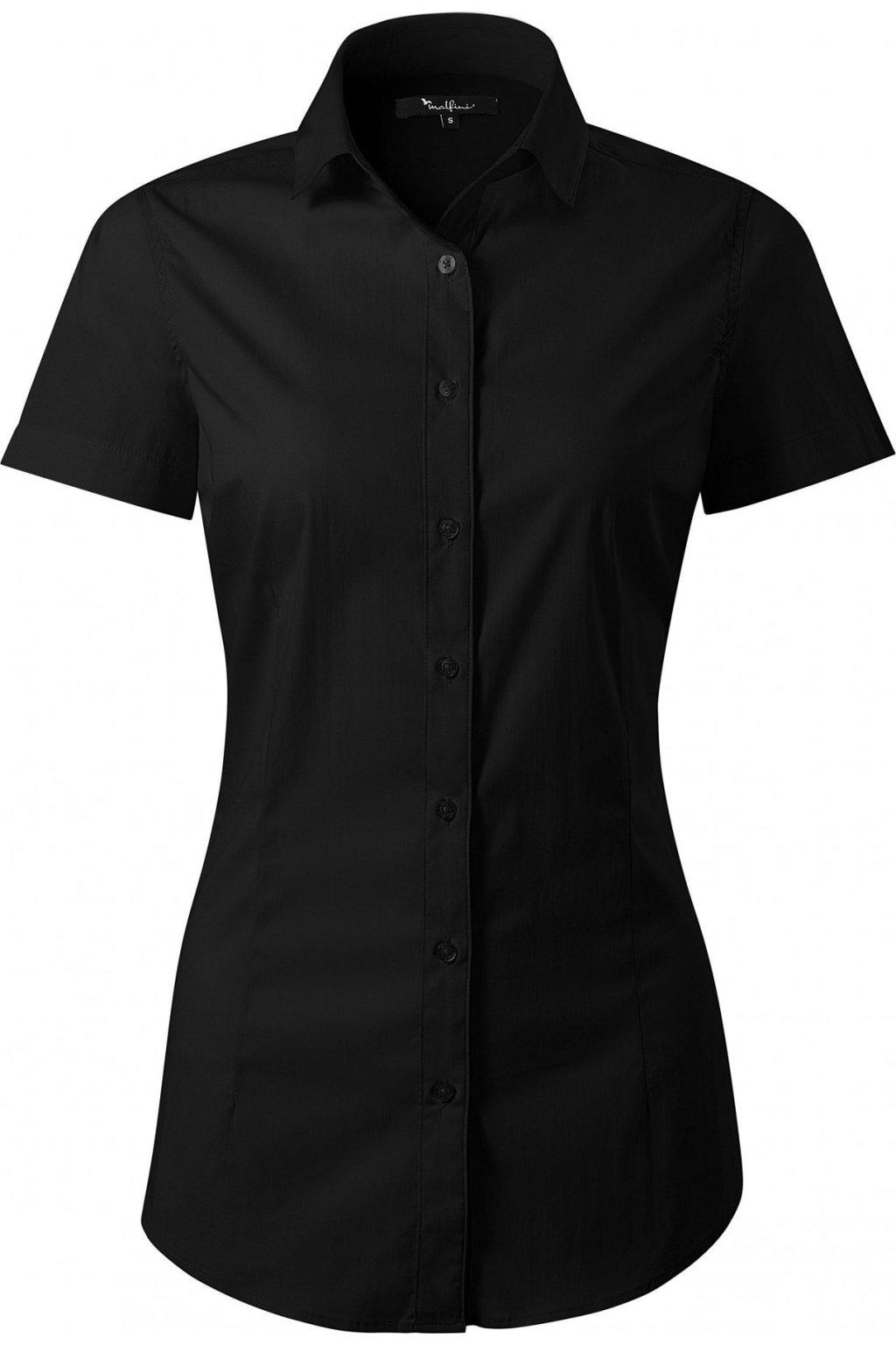 jemný strečový materiál, projmutý střih s bočními švy, dvojité sedlo na zadním dílu, pasové a prsní záševky, dvoudílný košilový límec, přední kraje začištěny légou, perleťové knoflíčky v barvě materiálu (1 náhradní navíc), tvarovaný dolní kraj