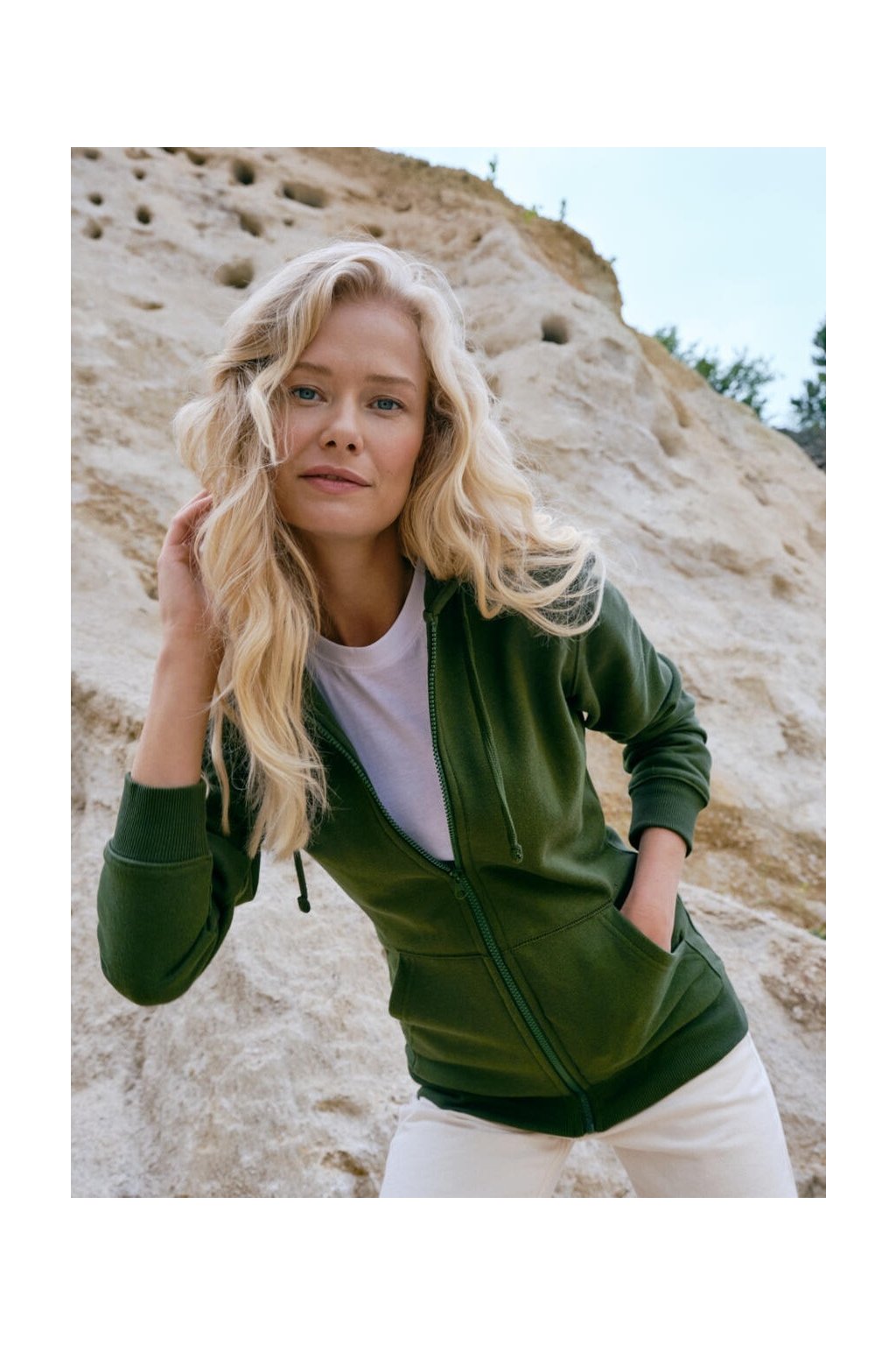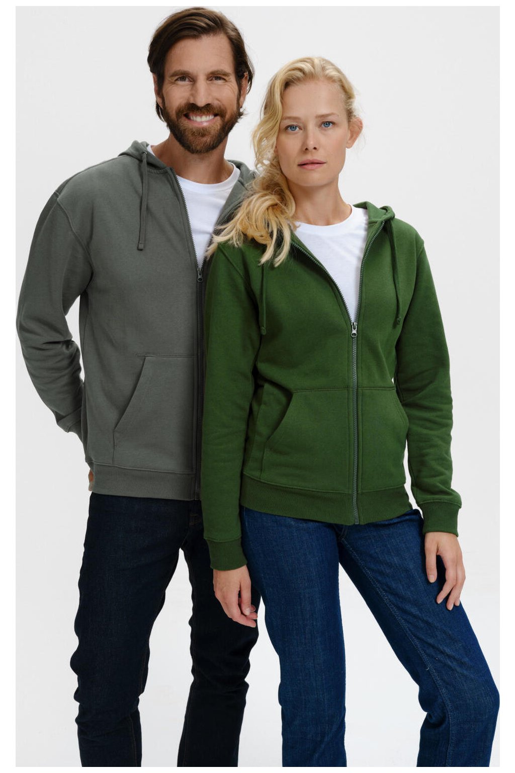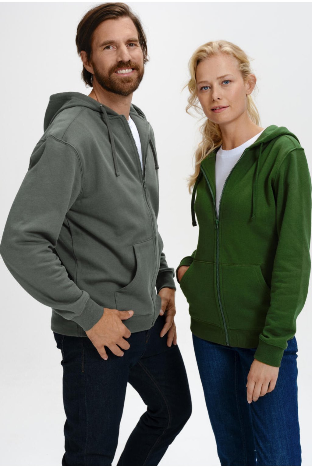 lehce vypasovaný střih s bočními švy, celopropínací kostěný zip, kapuce s podšívkou, na stažení šňůrkou, vnitřní část průkrčníku začištěna páskou v barvě vrchového materiálu, nakládané kapsy ve stylu klokanky, dolní lem a manžety rukávů z žebrového úpletu 2:2 s 5 % elastanu, vnitřní strana počesaná