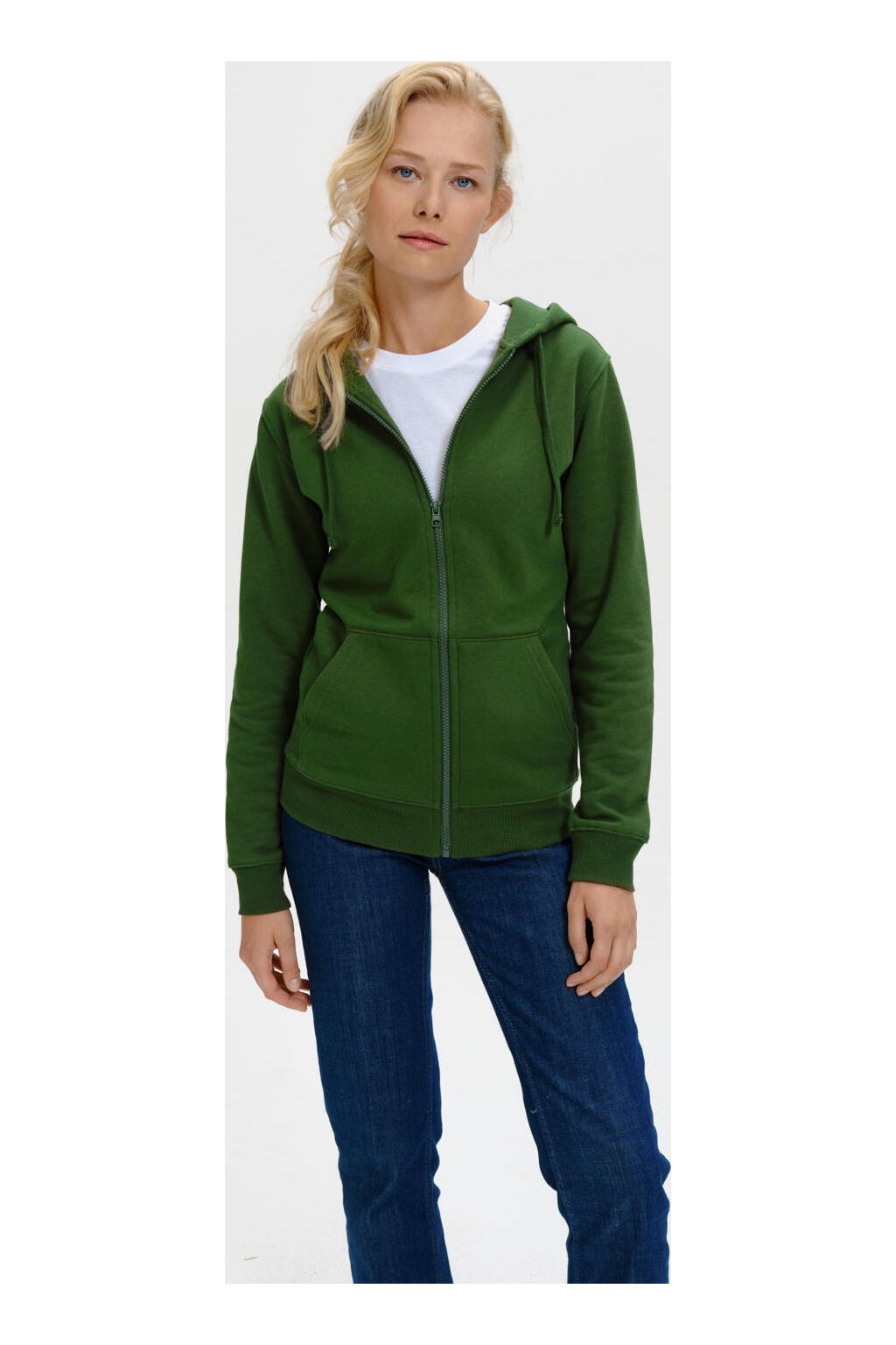 lehce vypasovaný střih s bočními švy, celopropínací kostěný zip, kapuce s podšívkou, na stažení šňůrkou, vnitřní část průkrčníku začištěna páskou v barvě vrchového materiálu, nakládané kapsy ve stylu klokanky, dolní lem a manžety rukávů z žebrového úpletu 2:2 s 5 % elastanu, vnitřní strana počesaná