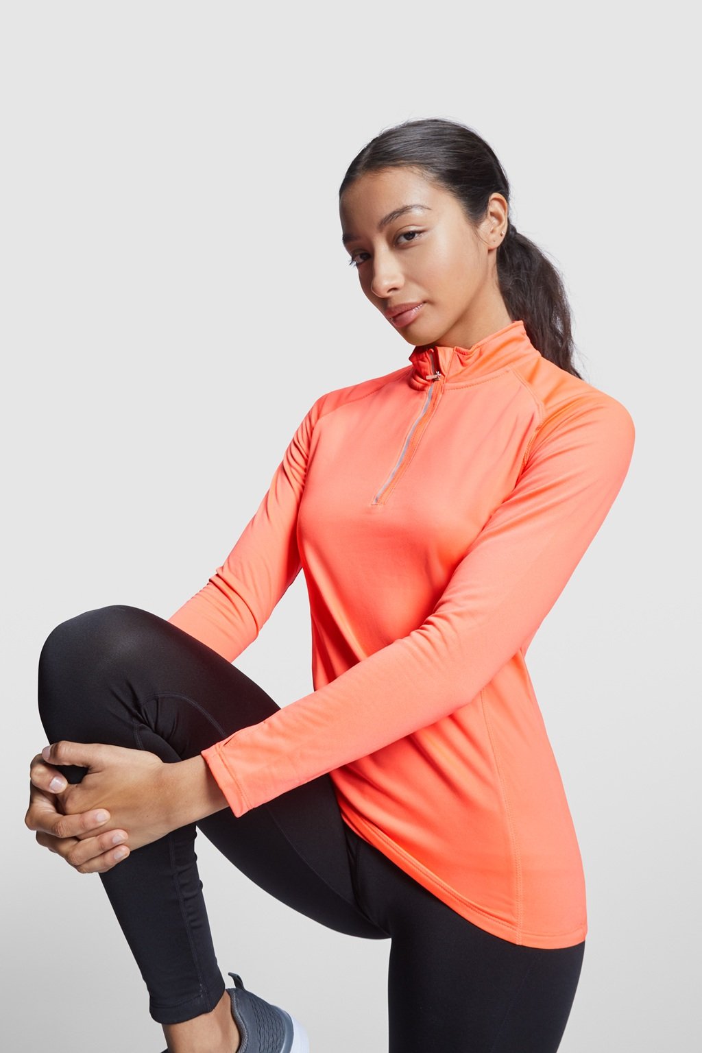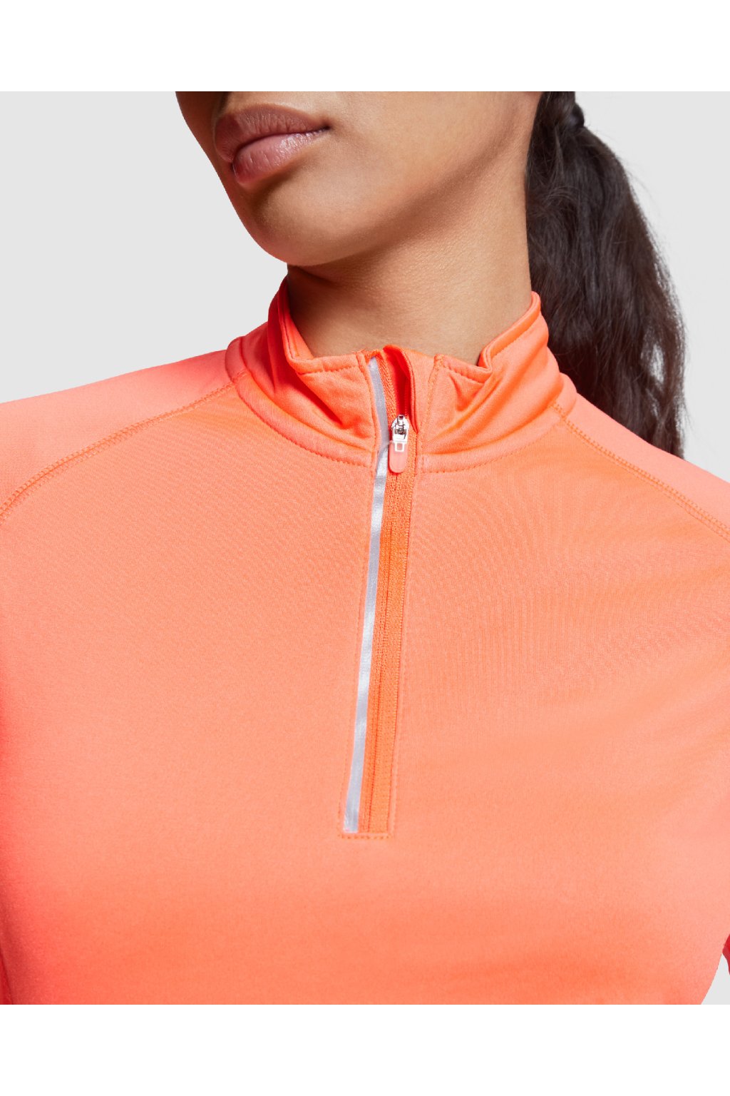 Funkční dámská mikina s dlouhým raglánovým rukávem. Zakrytí švů v kontrastním provedení slouží jako zesílení vnitřní strany výstřihu. Mikina má česanou vnitřní stranu, obrácený poloviční zip tón v tónu s reflexním detailem, manžety s otvorem na palec, zadní díl je lehce delší než přední. Mikina má reflexní detaily na zadním dílu.