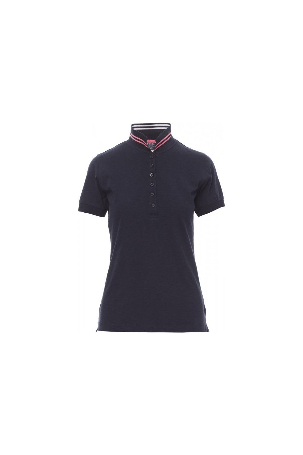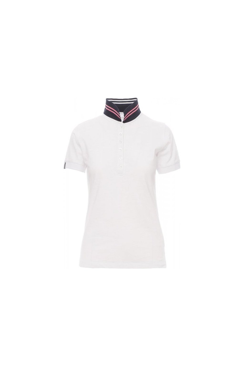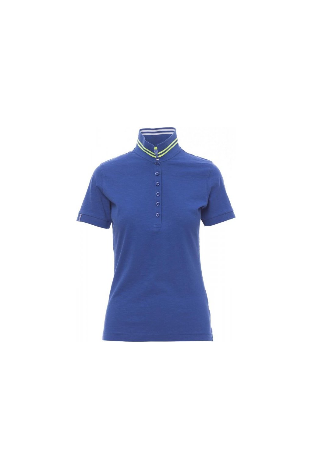 Dámská vyštíhlená polokošile s krátkým rukávem s 6 barevně sladěnými perleťovými knoflíky, límeček na jedné straně s kontrastními pruhy a na druhé straně s fluorescentními pruhy, které jsou vidět pouze při zvednutí, žebrovaný límeček a lemy rukávů, tenká vsadka na pravé straně, postranní rozparky a prošití límečku s fluo páskou, nažehlovací etiketa.