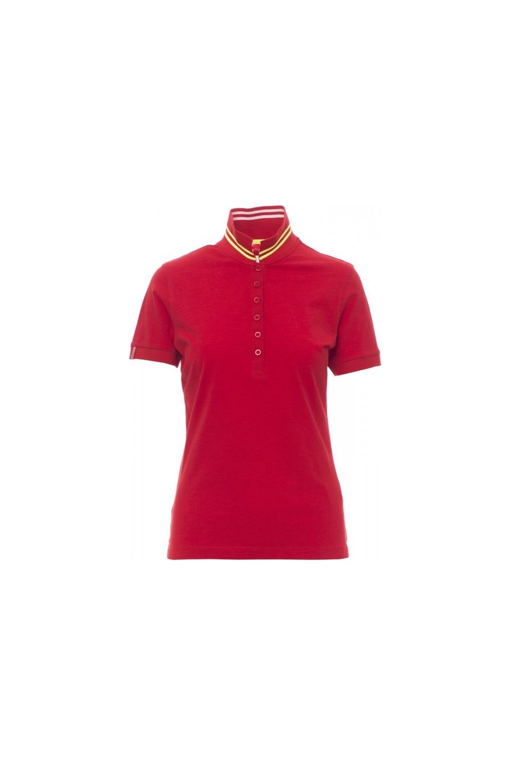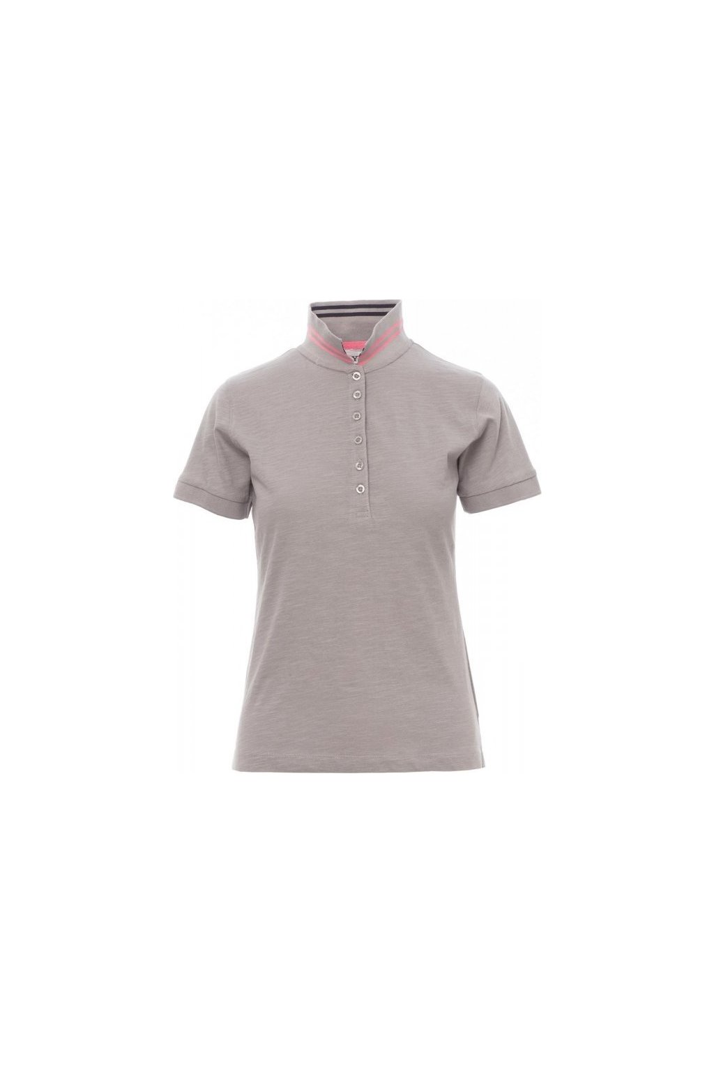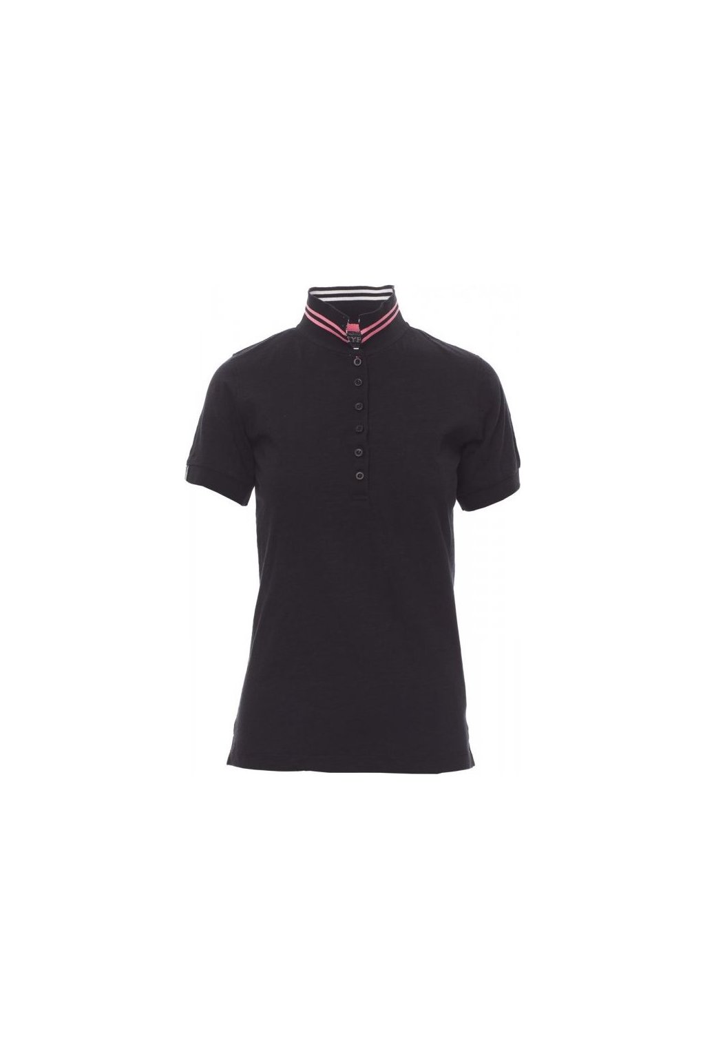 Dámská vyštíhlená polokošile s krátkým rukávem s 6 barevně sladěnými perleťovými knoflíky, límeček na jedné straně s kontrastními pruhy a na druhé straně s fluorescentními pruhy, které jsou vidět pouze při zvednutí, žebrovaný límeček a lemy rukávů, tenká vsadka na pravé straně, postranní rozparky a prošití límečku s fluo páskou, nažehlovací etiketa.
