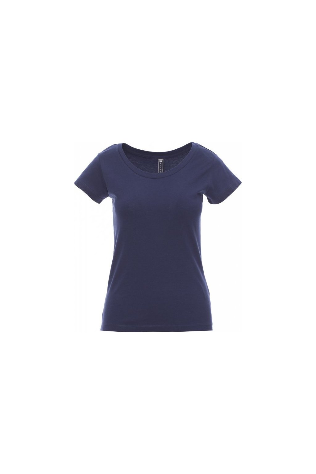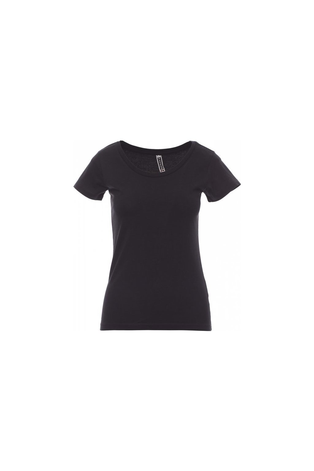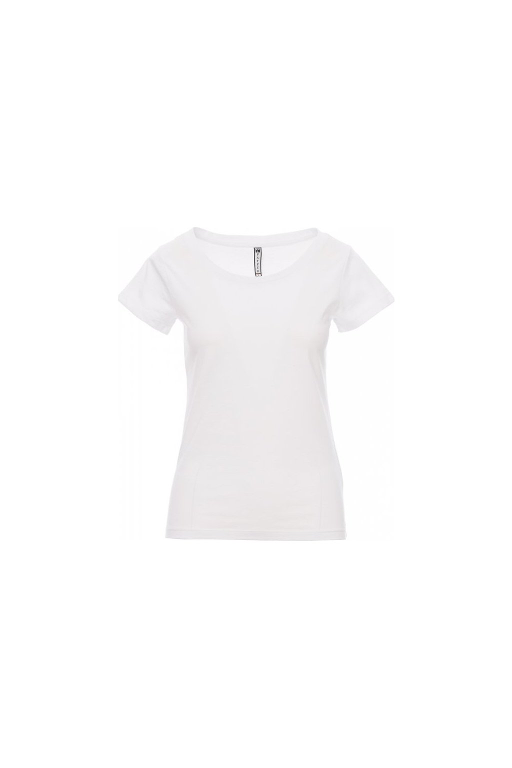 Dámské vyštíhlené tričko s hlubokým kulatým výstřihem, pružný žebrovaný lem 1,2 cm ze směsi spandex ve spodní části, krátké přiléhavé rukávy a postranní šev pro pohodlnější nošení, dvojjehlové prošití na ramenou, bavlněná spodní část límečku a pásky.