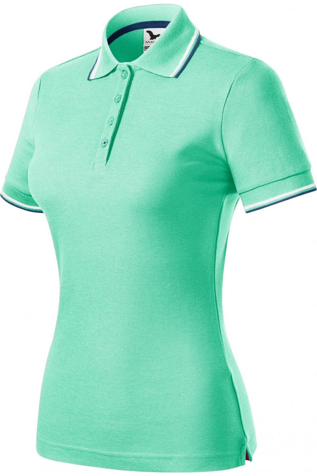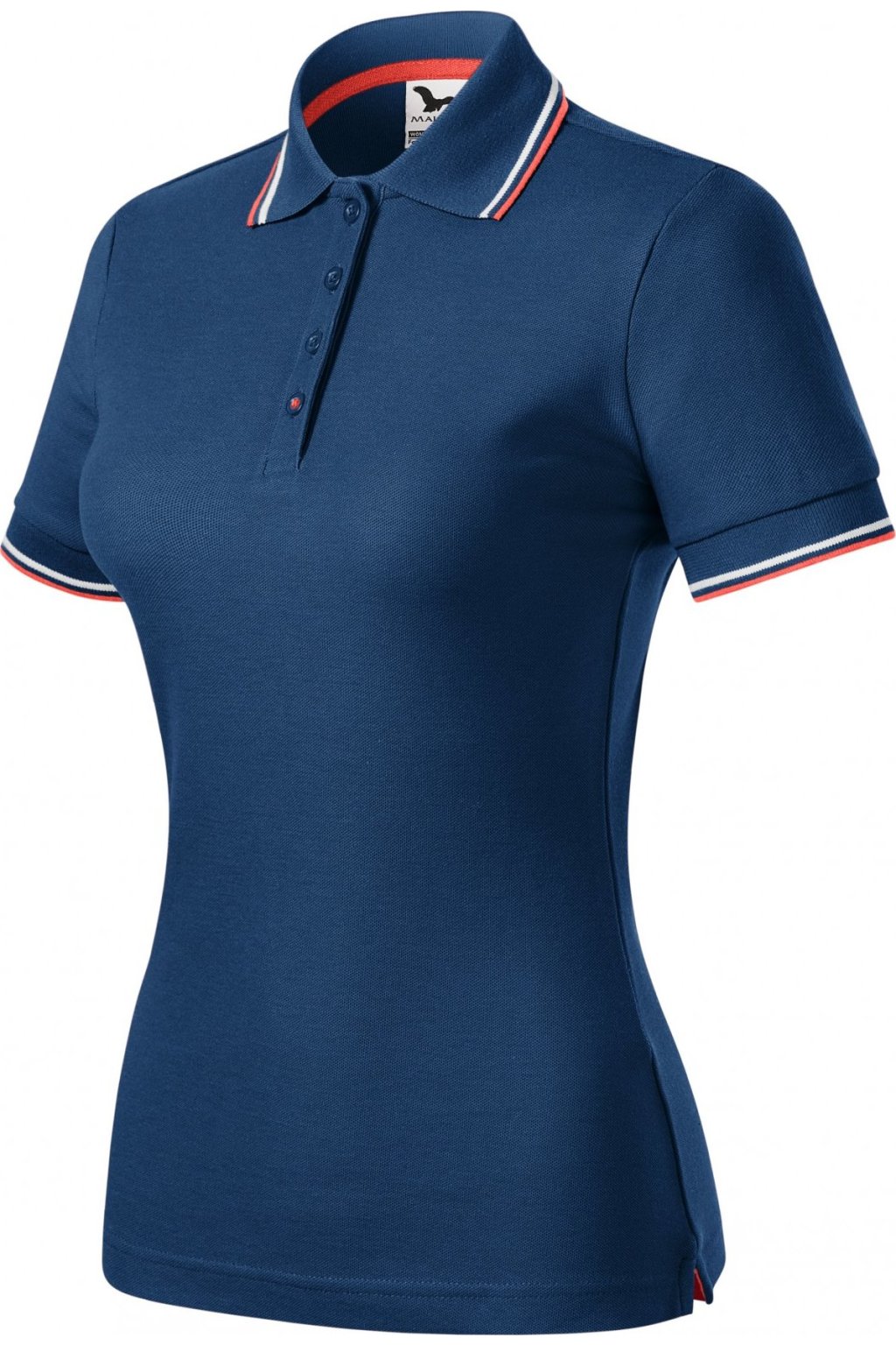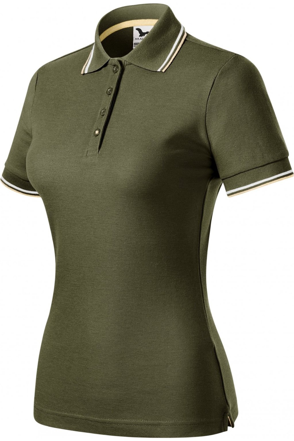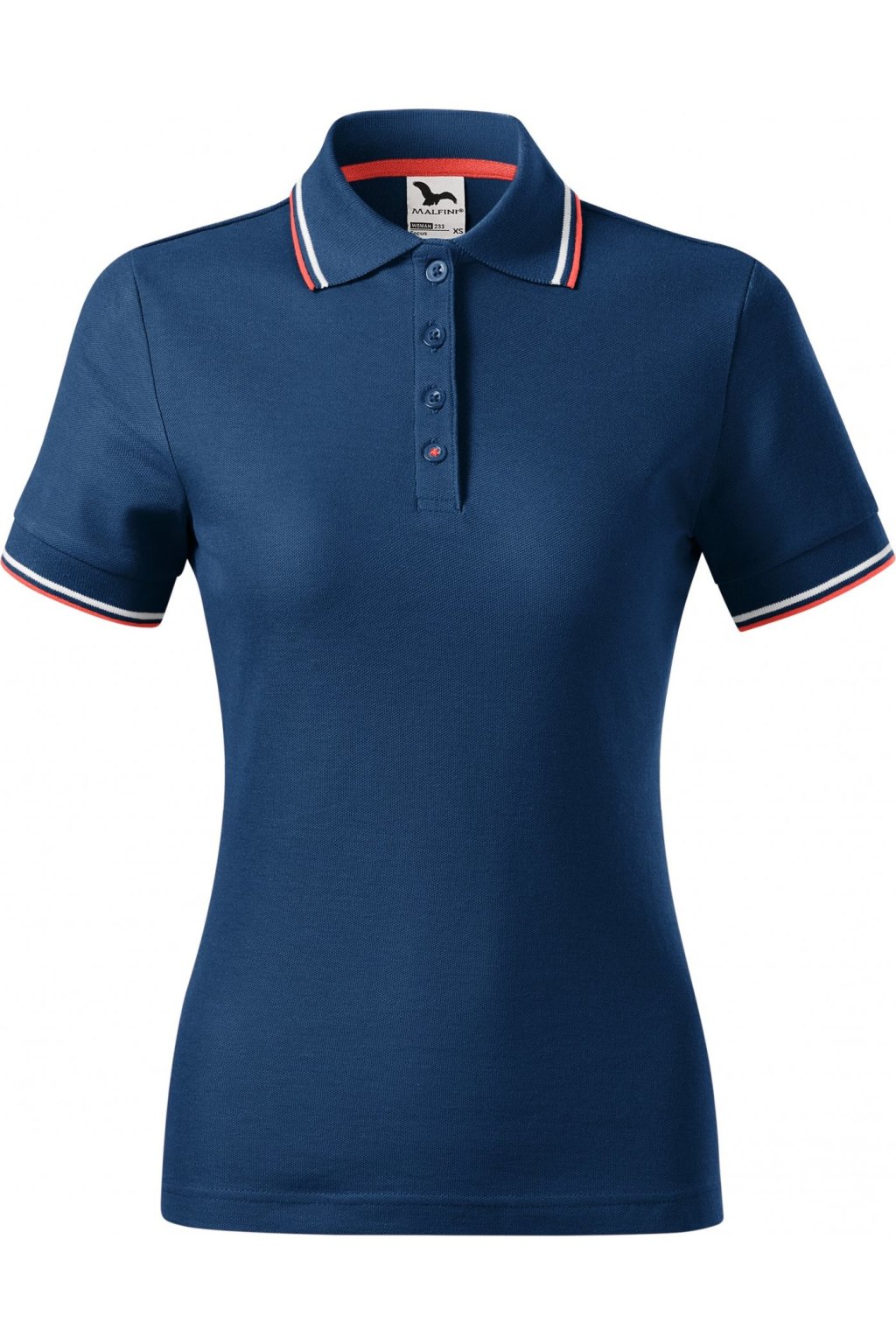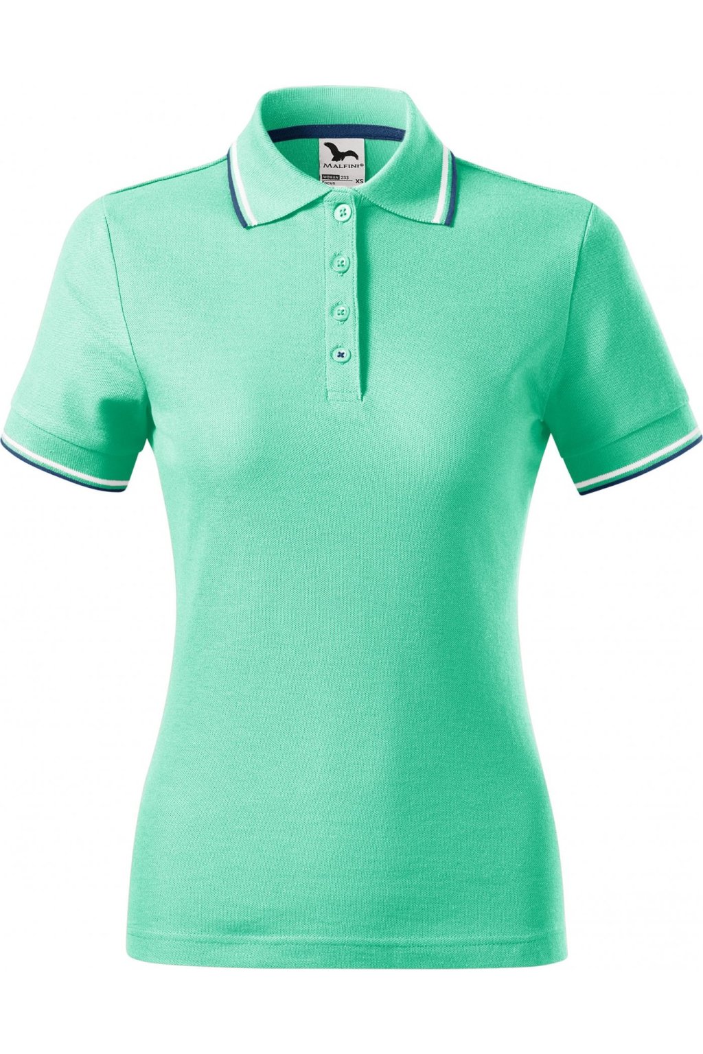 lehce vypasovaný střih s bočními švy, límeček z žebrového úpletu 1:1, 2 kontrastní proužky na rukávu a límečku , úzká léga s 4 knoflíčky v barvě materiálu, spodní knoflíček přišitý kontrastní nití, vnitřní průkrčník začištěn kontrastní páskou, zpevnění ramenních švů páskou, rozparky v bočních švech s kontrastní páskou, zboží II. jakosti, na zboží II. jakosti se nevztahuje reklamace