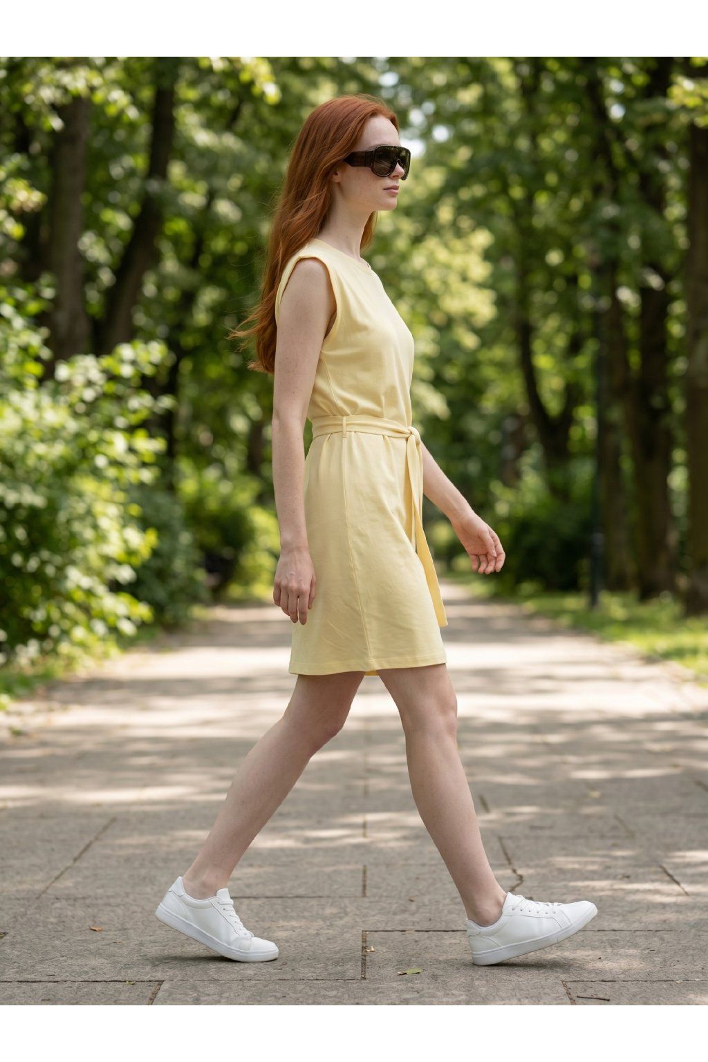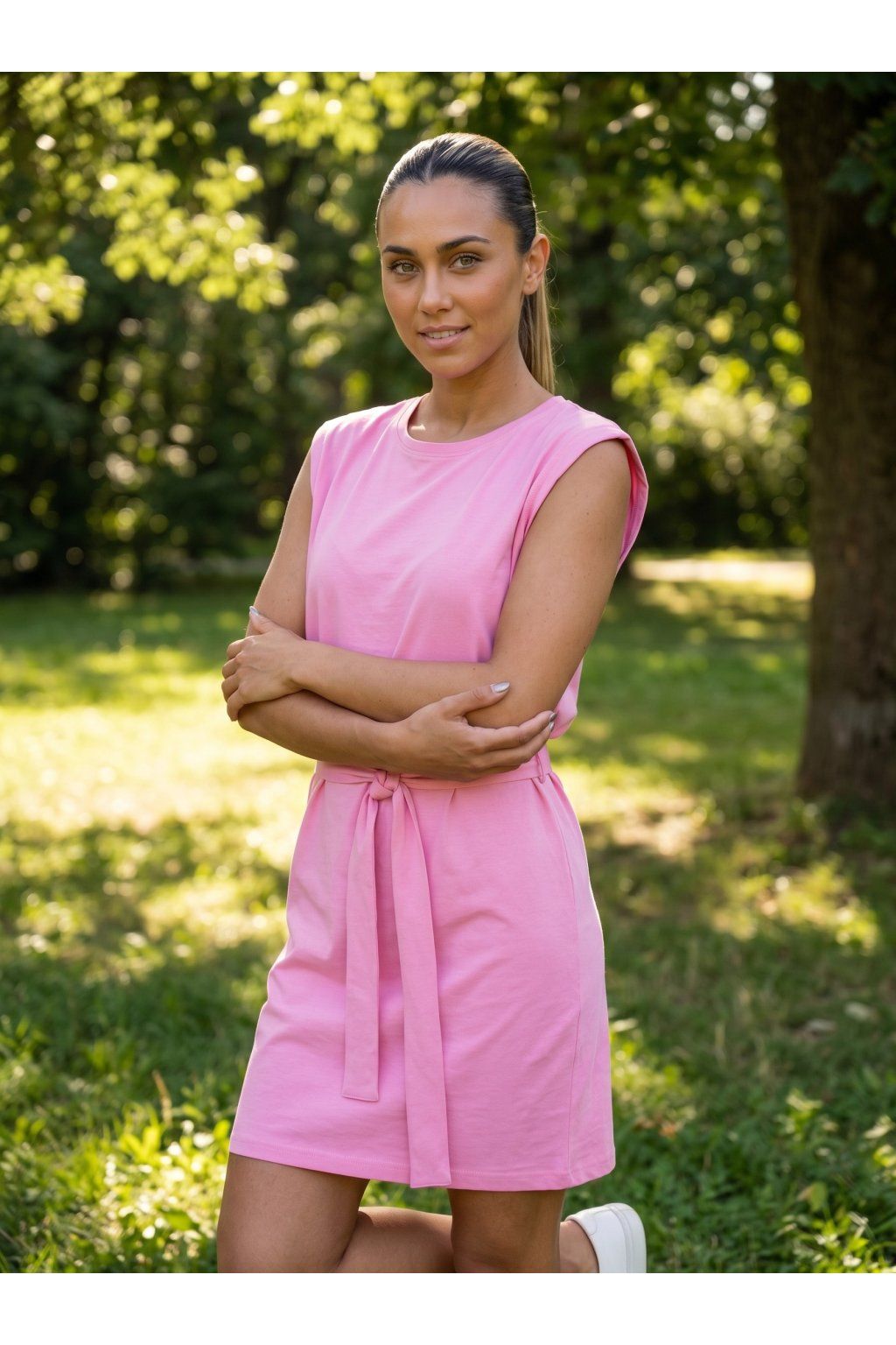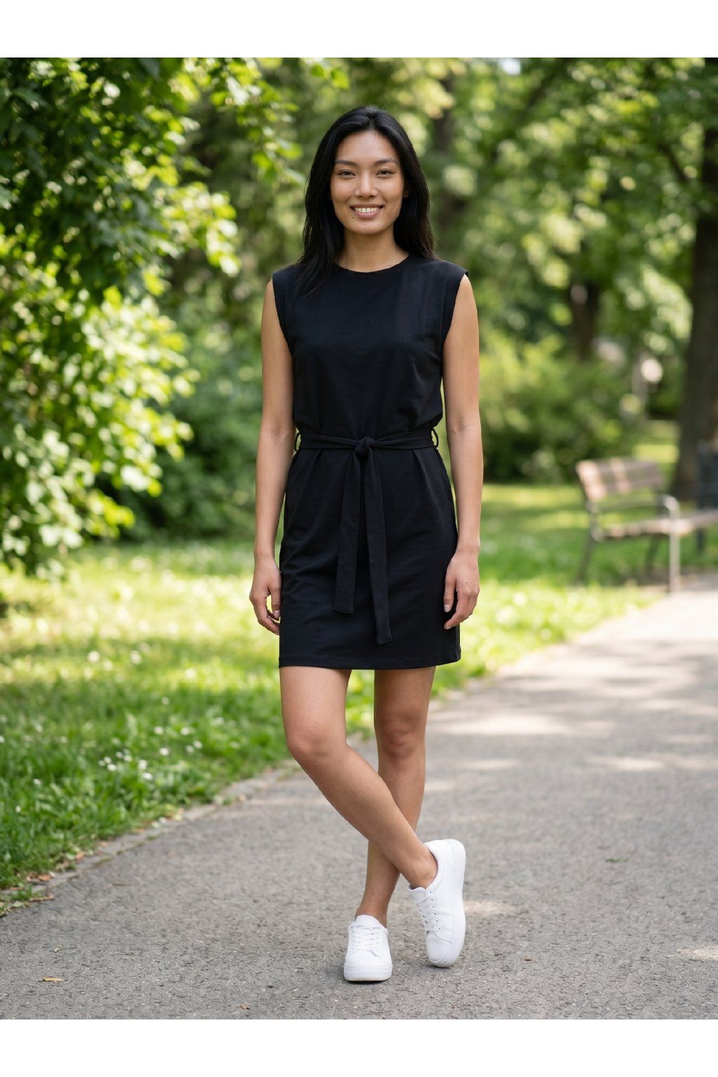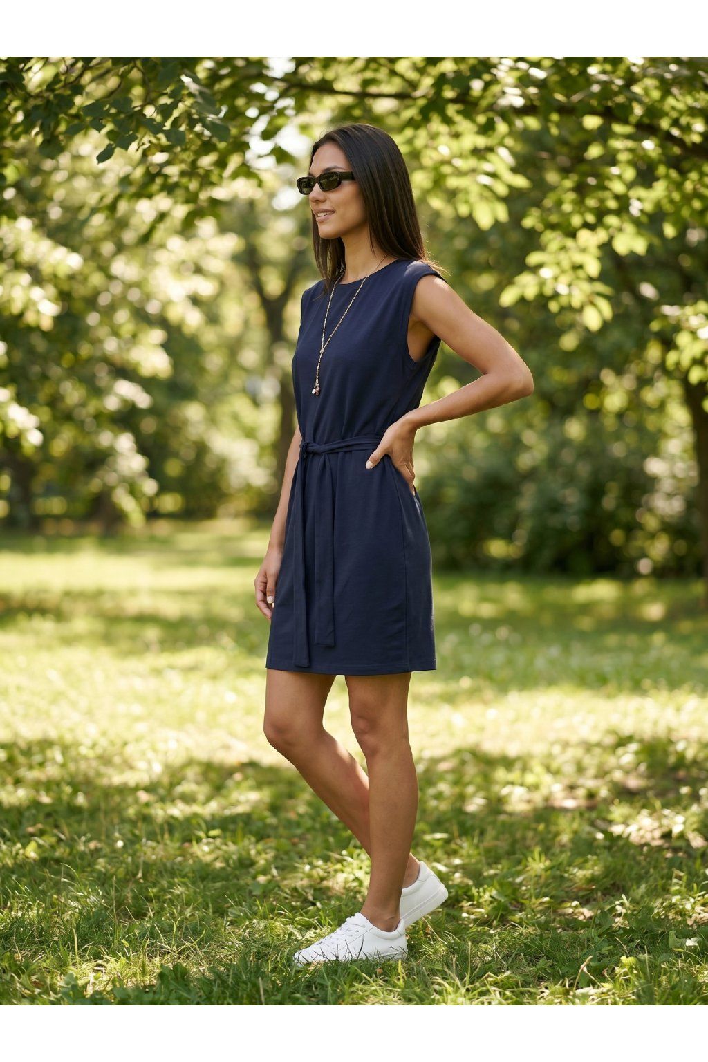 Dámské letní šaty s páskem, krátké, bez rukávů, volnější pohodlný střih.