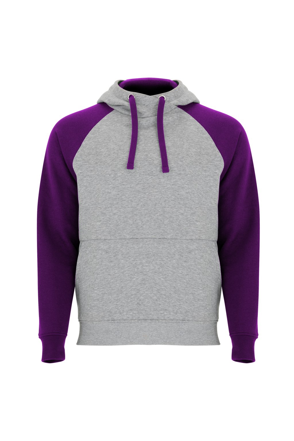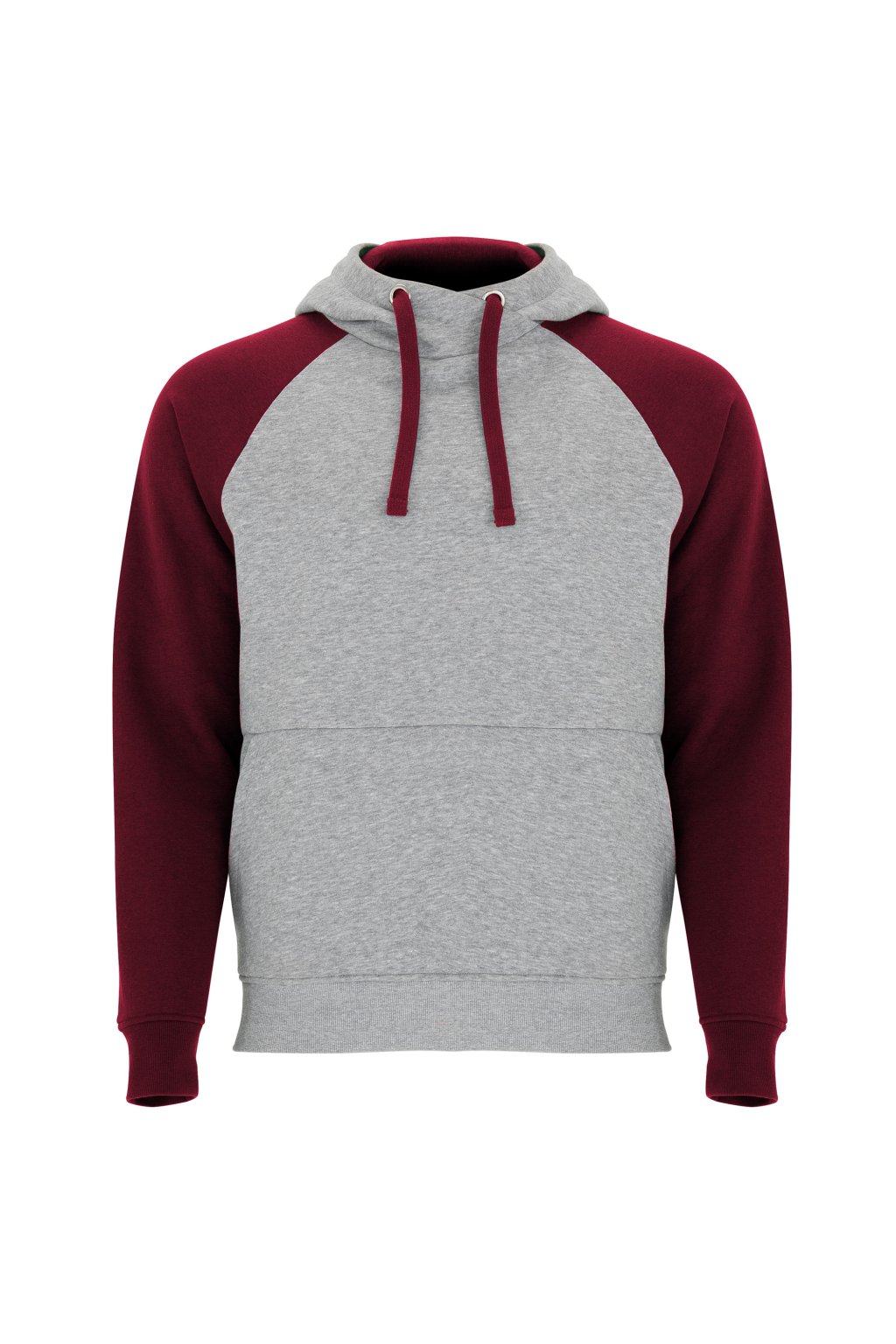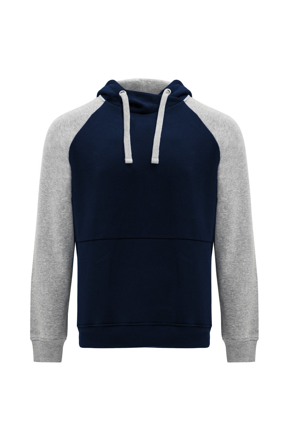Pánská / dětská dvojbarevná mikina. Mikina má překřížený výstřih a kovové kroužky na šňůrky, kontrastní vnitřní kapuci a šňůrky, kontrastní rukáv raglánového stylu a klokaní kapsu. Manžety a spodní lem jsou s elastickým žebrováním 1x1.
