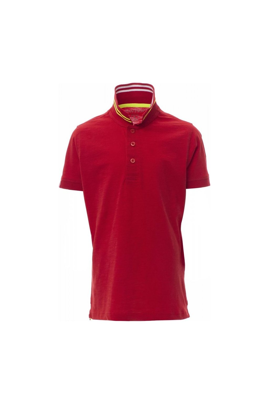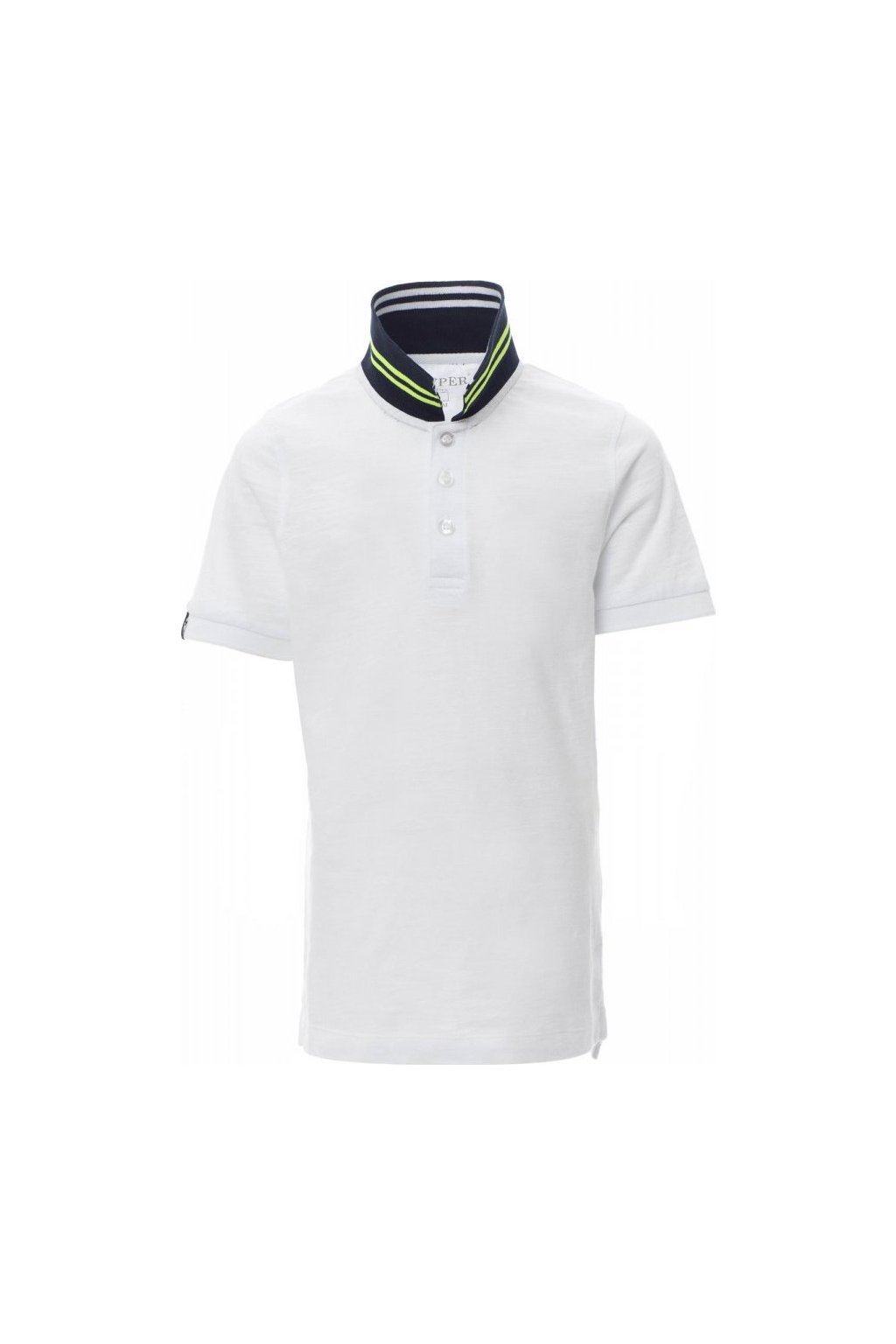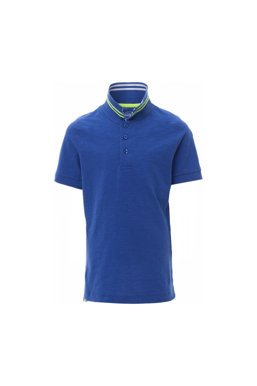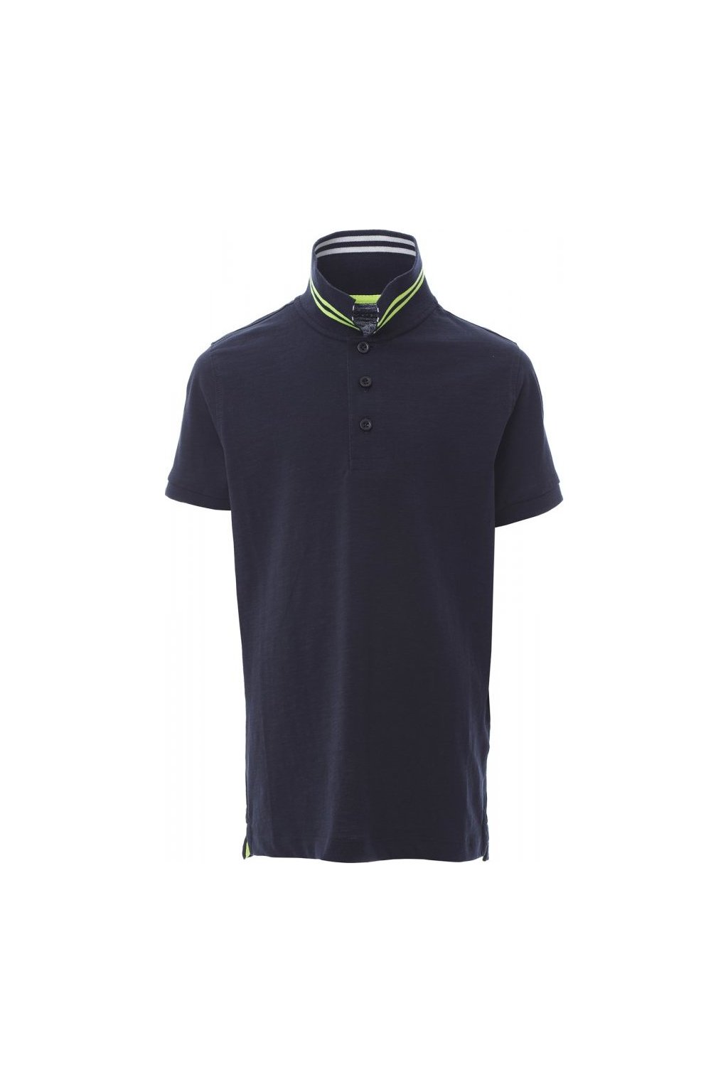 Dětská polokošile s krátkým rukávem s 3 barevně sladěnými perleťovými knoflíky, límeček na jedné straně s kontrastními pruhy a na druhé straně s fluorescentními pruhy, které jsou vidět pouze při zvednutí, žebrovaný límeček a lemy rukávů, tenká vsadka na pravé straně, postranní rozparky a prošití límečku s fluo páskou, nažehlovací etiketa.