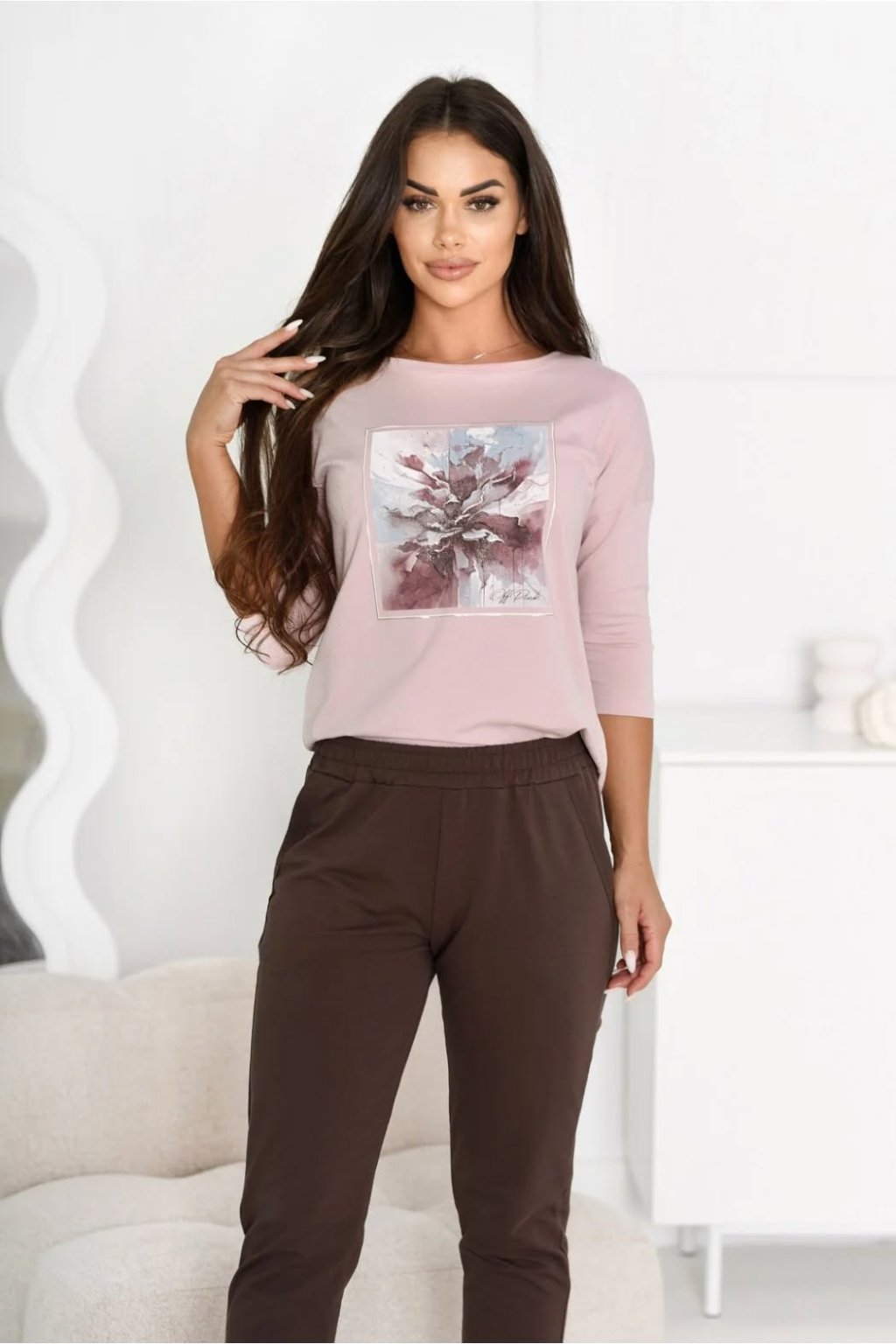 Dámská halenka s 3/4 rukávy. Na přední straně je potisk se zlatými akcenty, které dodávají halence jemný lesk. Spodní část halenky je zakončena rovnou linií, která umožňuje různé způsoby nošení – jak zastrčenou do kalhot, tak i vnější.