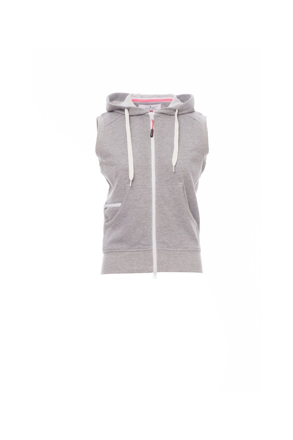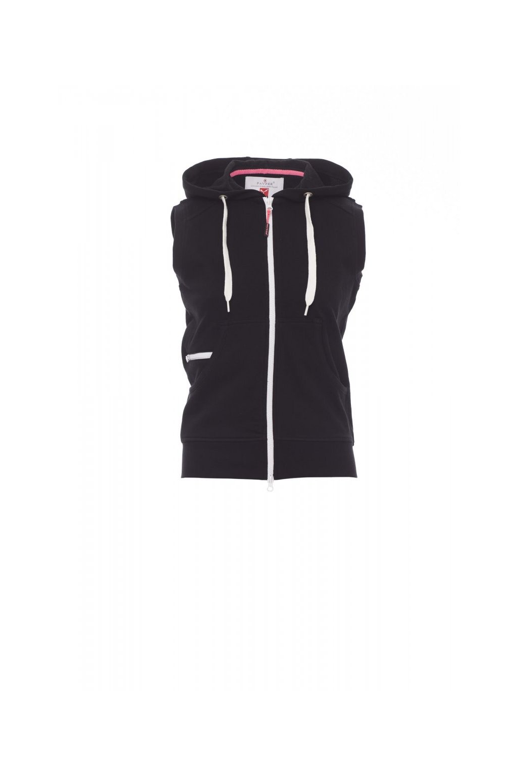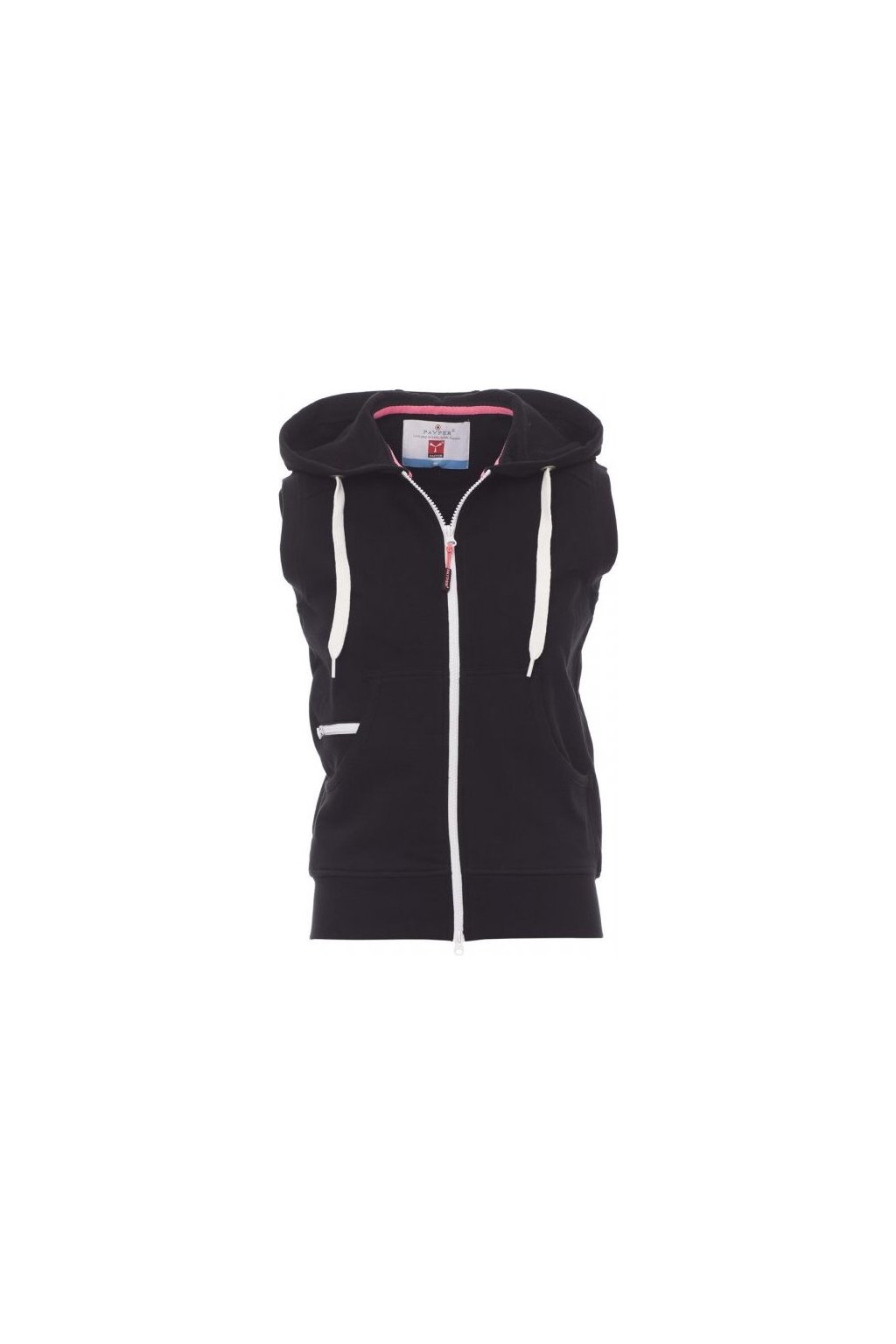 Dámská mikina bez rukávů s plastovým celozipem v kontrastní barvě, s dvojitým kovovým jezdcem, tvarovaná kapuce a stahovací šňůrka kontrastní barvy, klokaní kapsa s kapsičkou na zip.