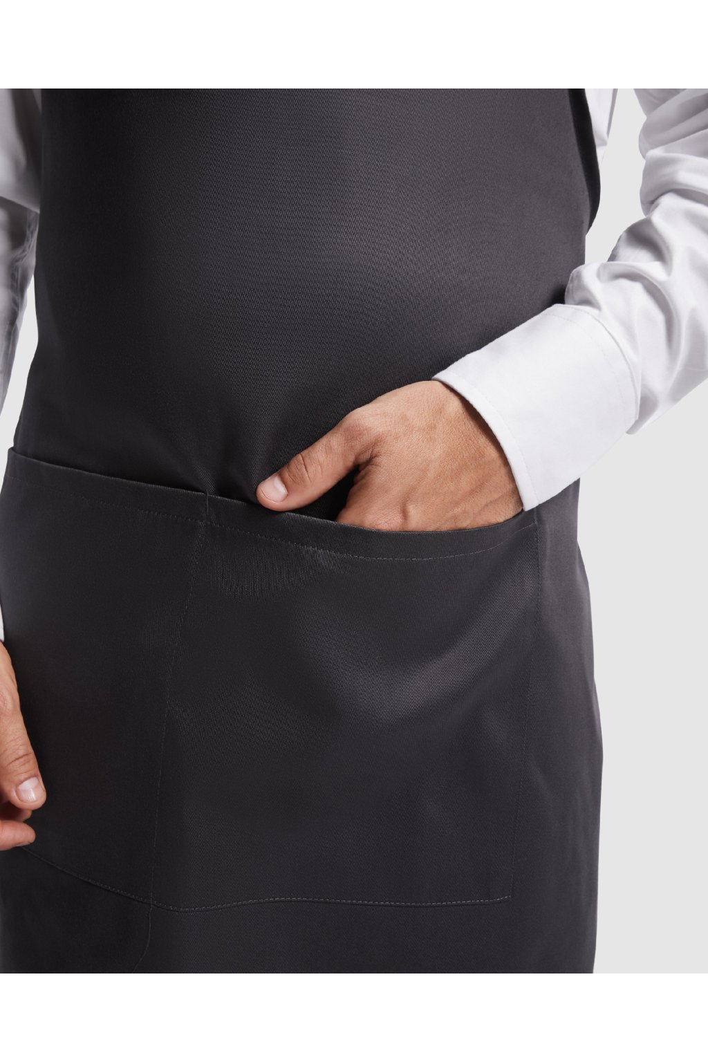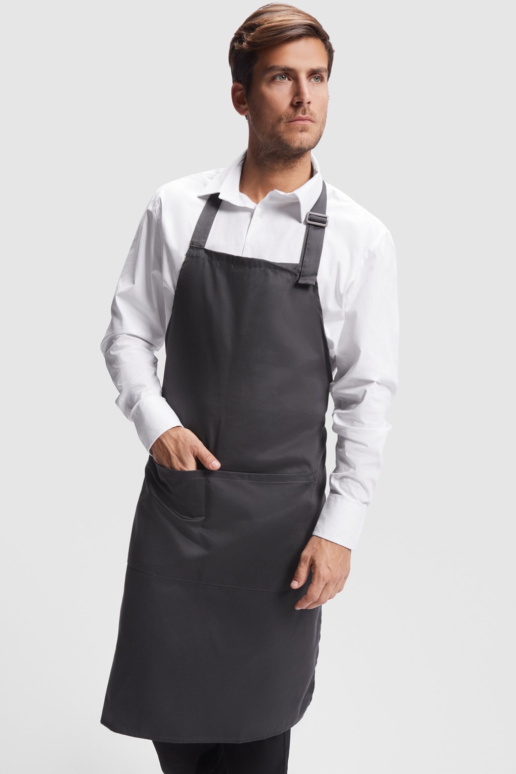 Dlouhá zástěra na vaření s přední kapsou. Délka laclu upravitelná s plastovým uzávěrem. V pase stahovací pásek