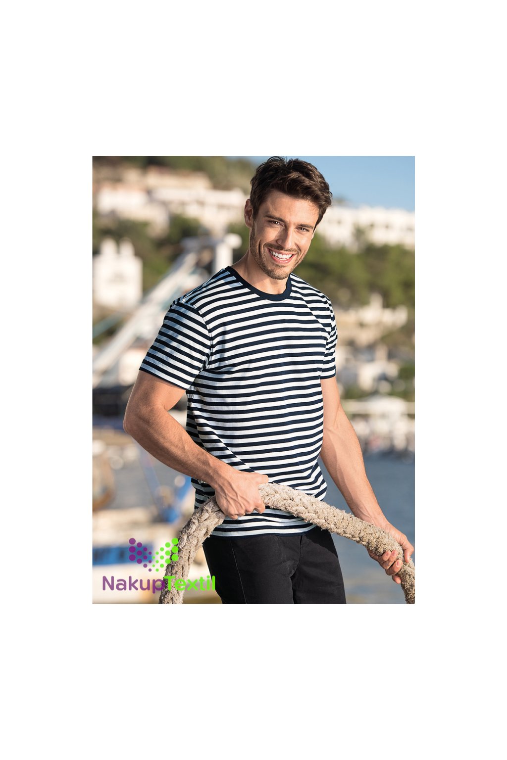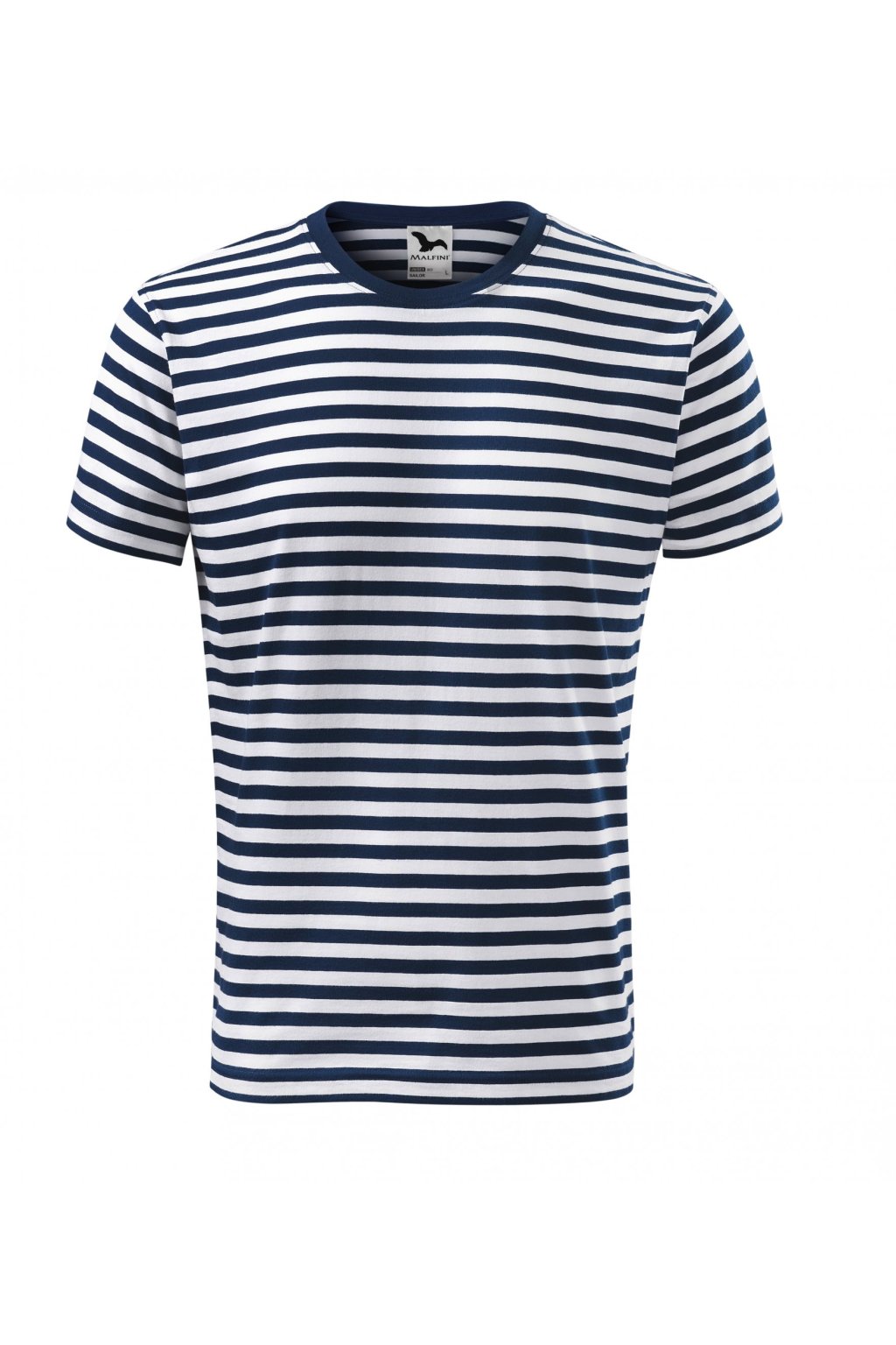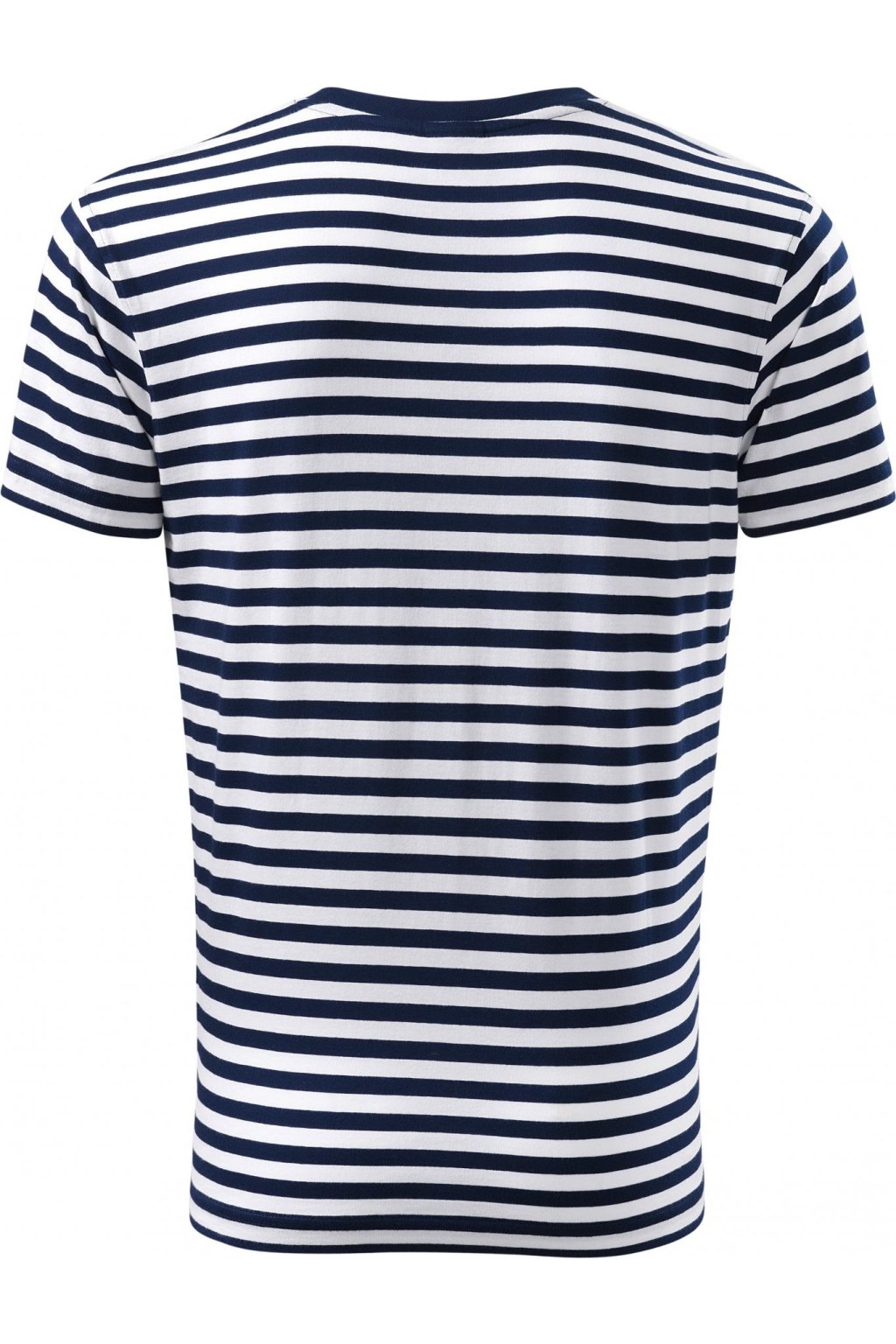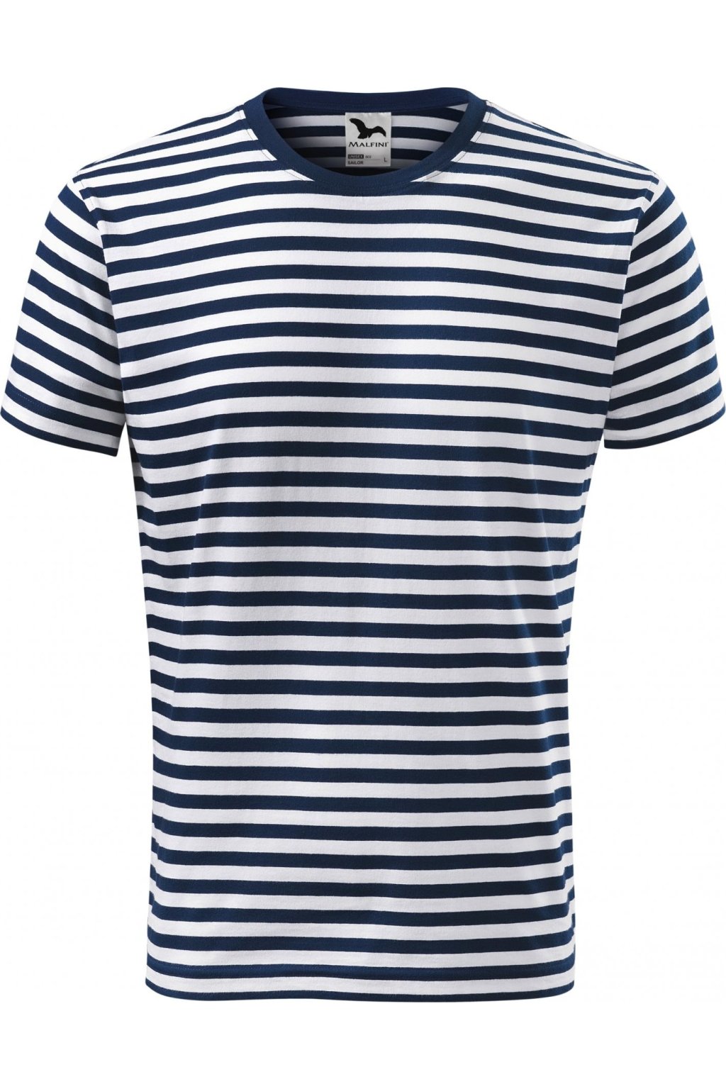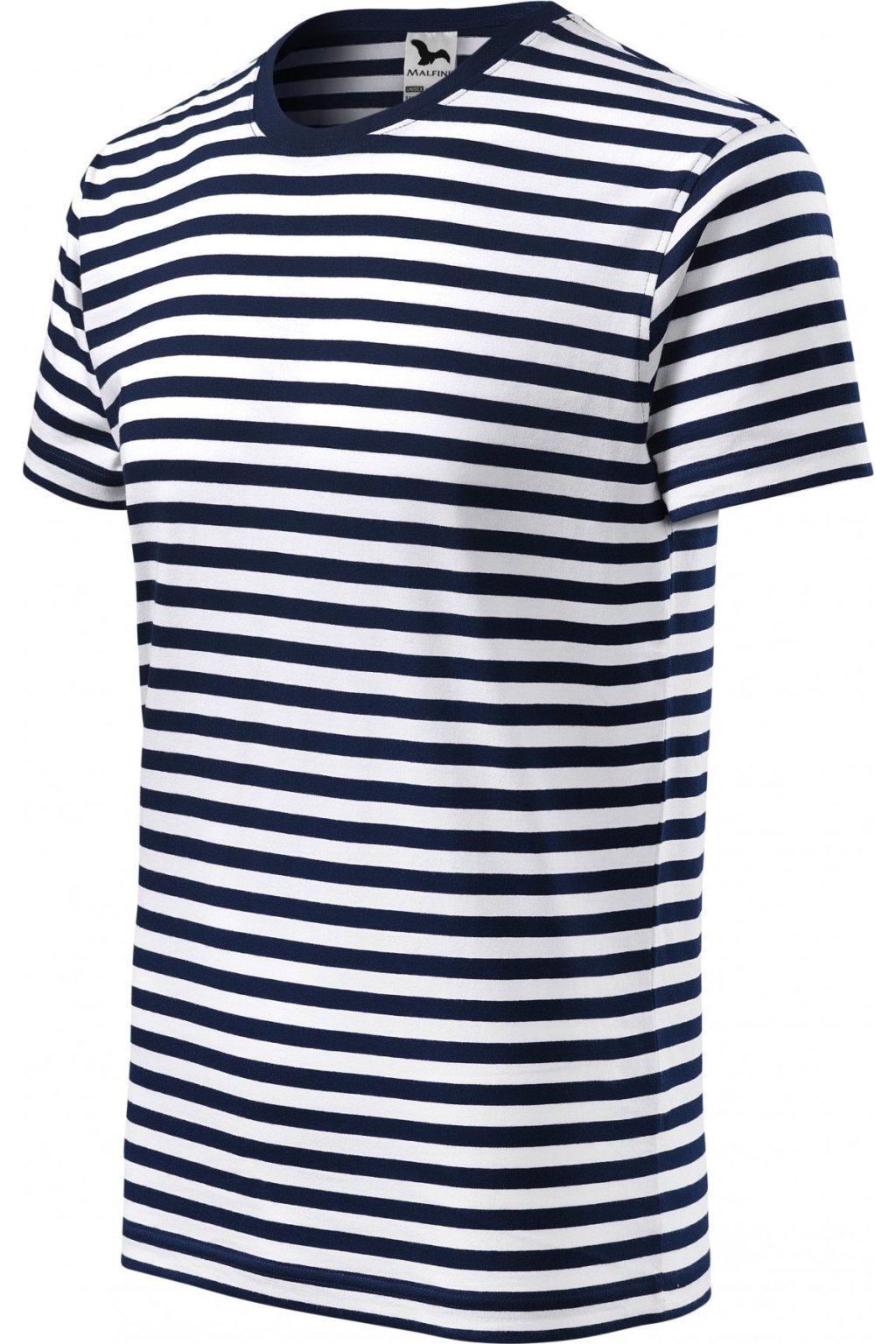 pruhy v kombinaci bílá a námořní modrá, střih s bočními švy, úzký lem průkrčníku z žebrového úpletu 1:1 s 5 % elastanu, vnitřní část průkrčníku začištěna páskou z vrchového materiálu, zpevnění ramenních švů páskou