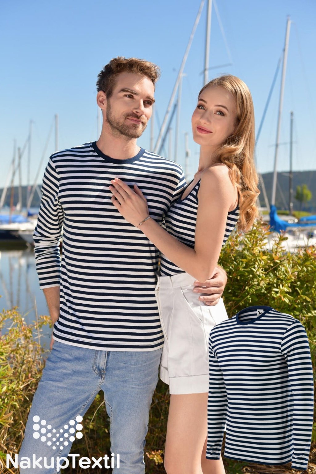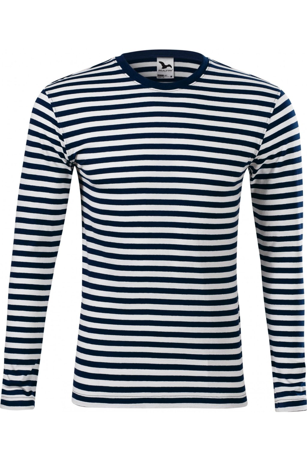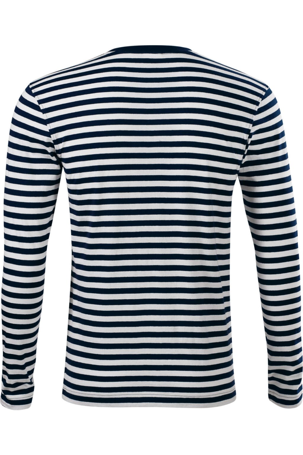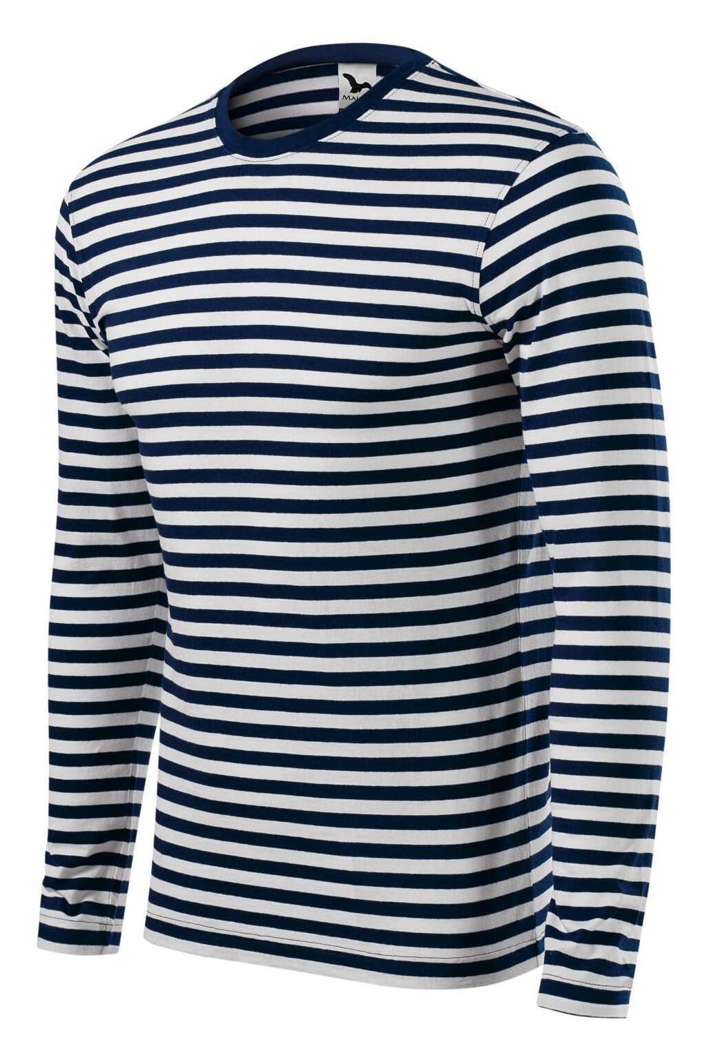 pruhy v kombinaci bílá a námořní modrá, střih s bočními švy, průkrčník lemován žebrovým úpletem 1:1 s 5 % elastanu, vnitřní část průkrčníku začištěna páskou z vrchového materiálu, zpevnění ramenních švů páskou, dlouhé rukávy
