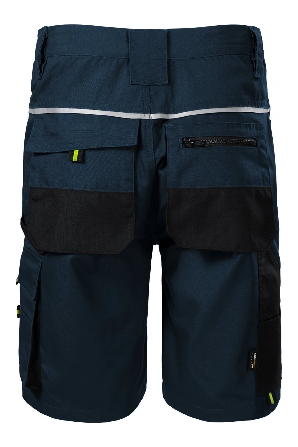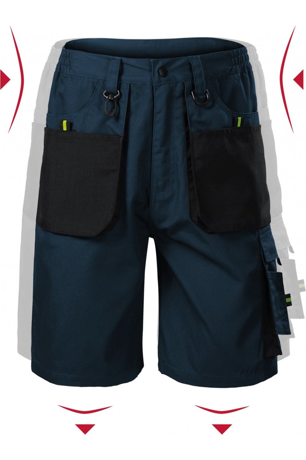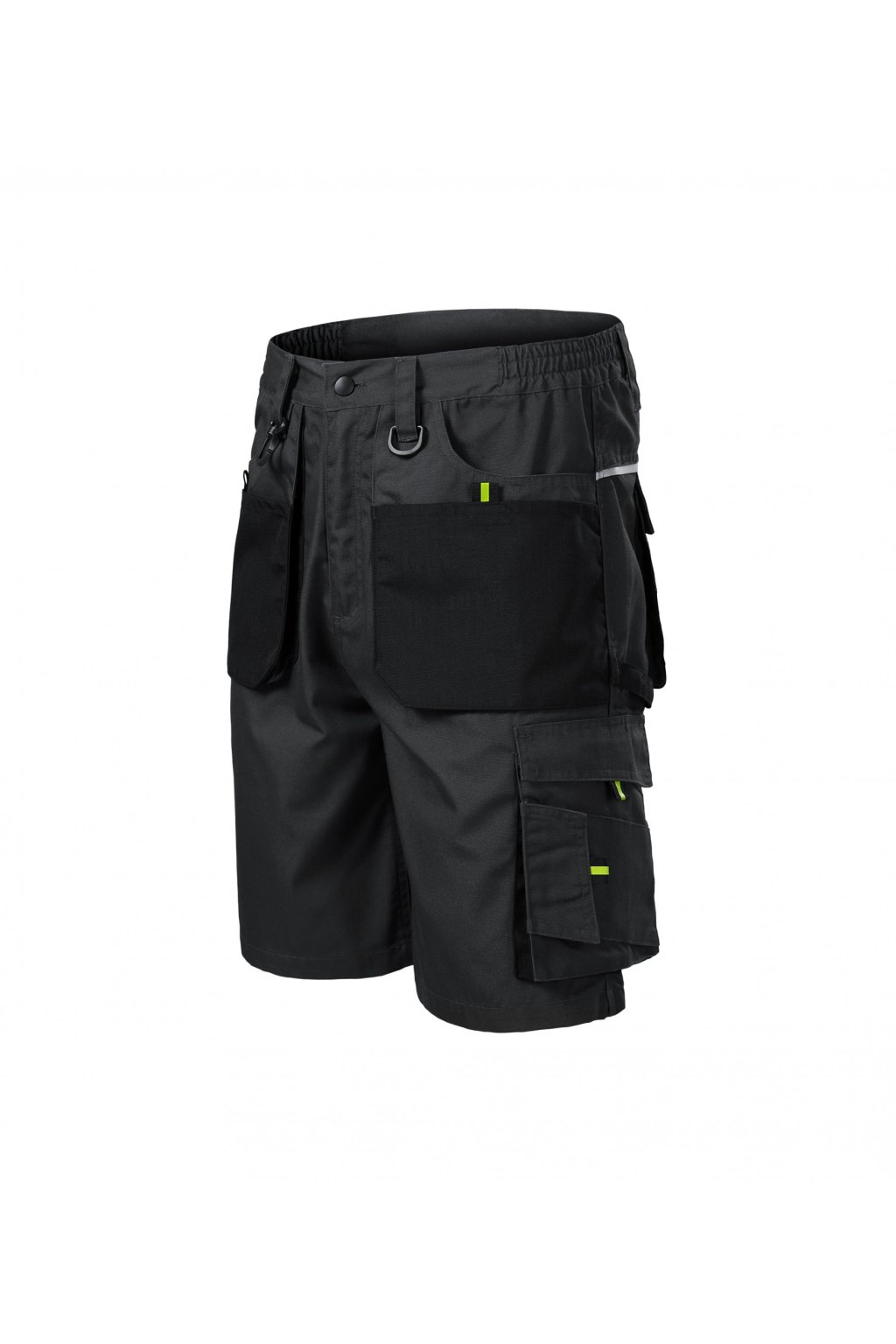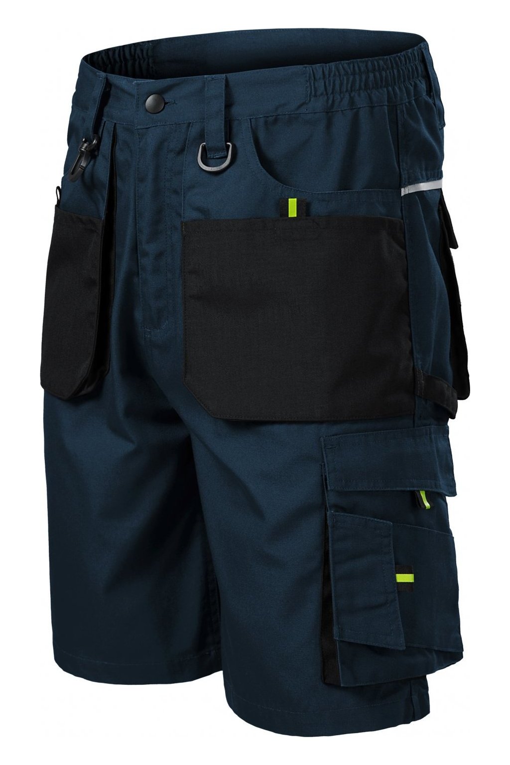 pruženka v boční části pasového límce, 10 multifunkčních kapes, plastové "D" poutko a karabina na klíče a ID karty, poutko na kladivo, dvojité prošití pro vyšší odolnost, vysoce odolný materiá v barvě 01, retroreflexní prvky
