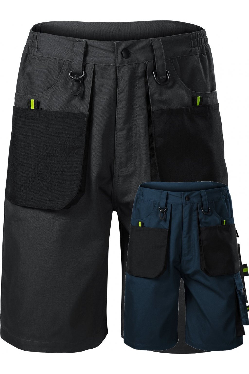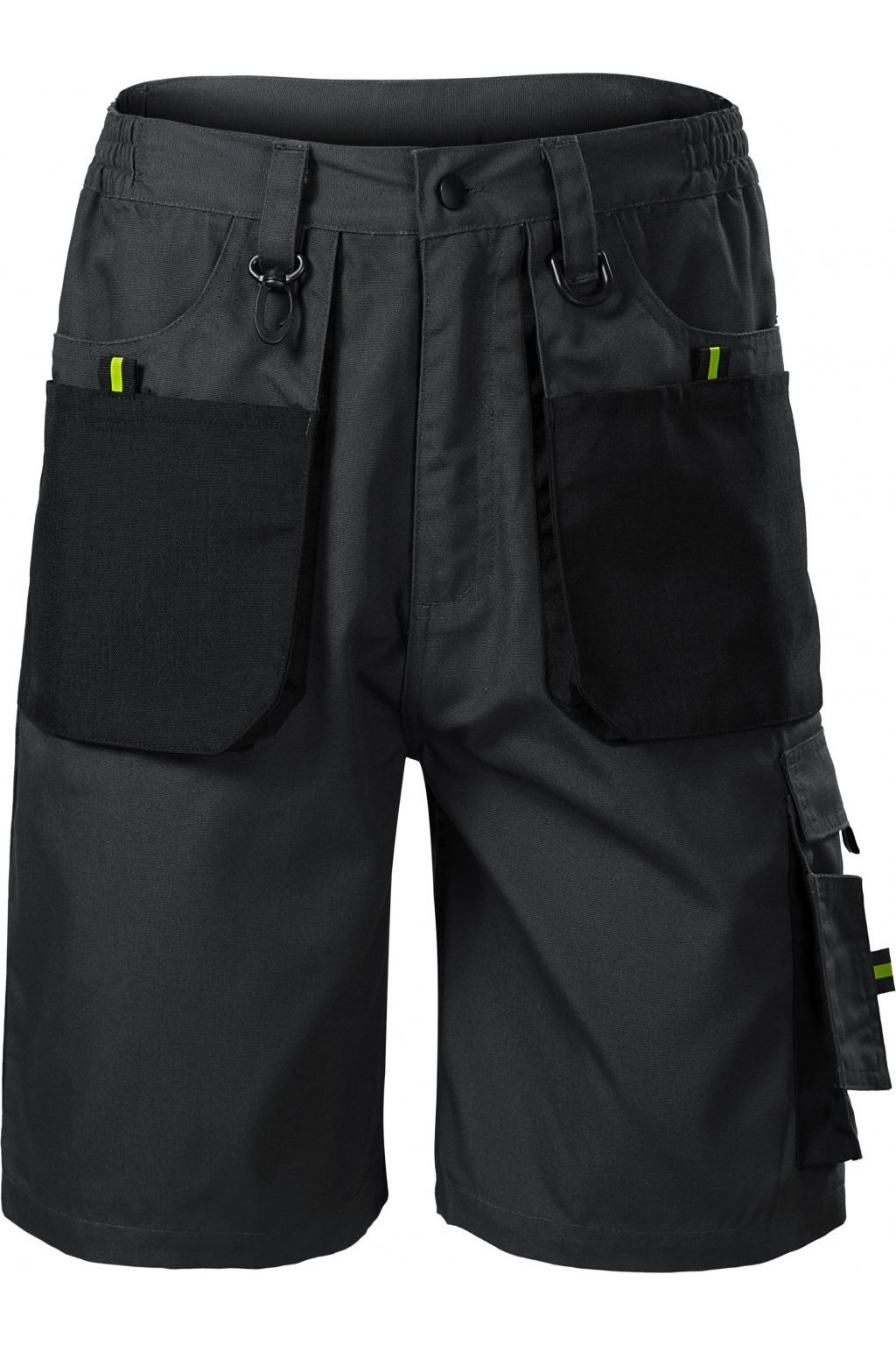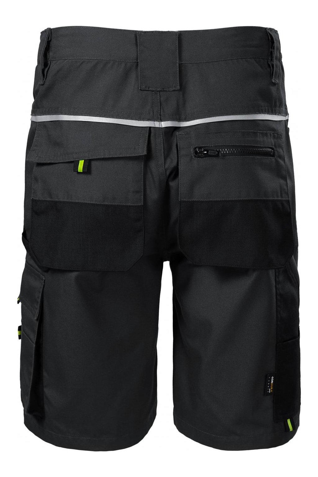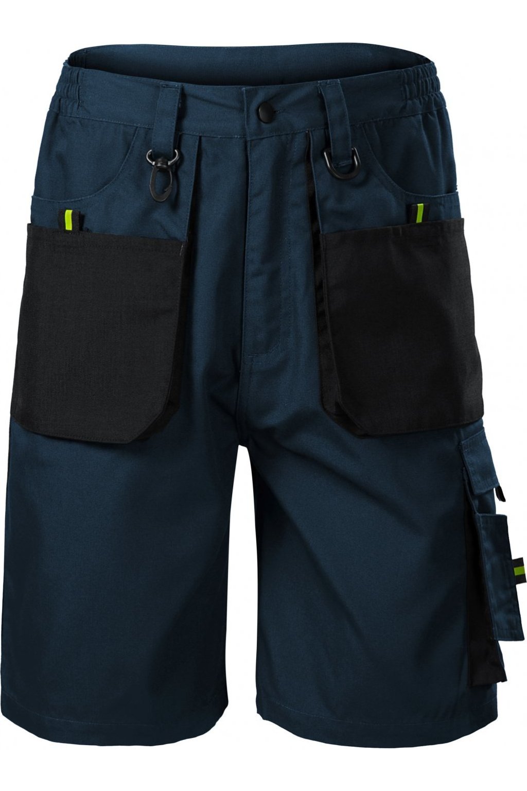 pruženka v boční části pasového límce, 10 multifunkčních kapes, plastové "D" poutko a karabina na klíče a ID karty, poutko na kladivo, dvojité prošití pro vyšší odolnost, vysoce odolný materiá v barvě 01, retroreflexní prvky