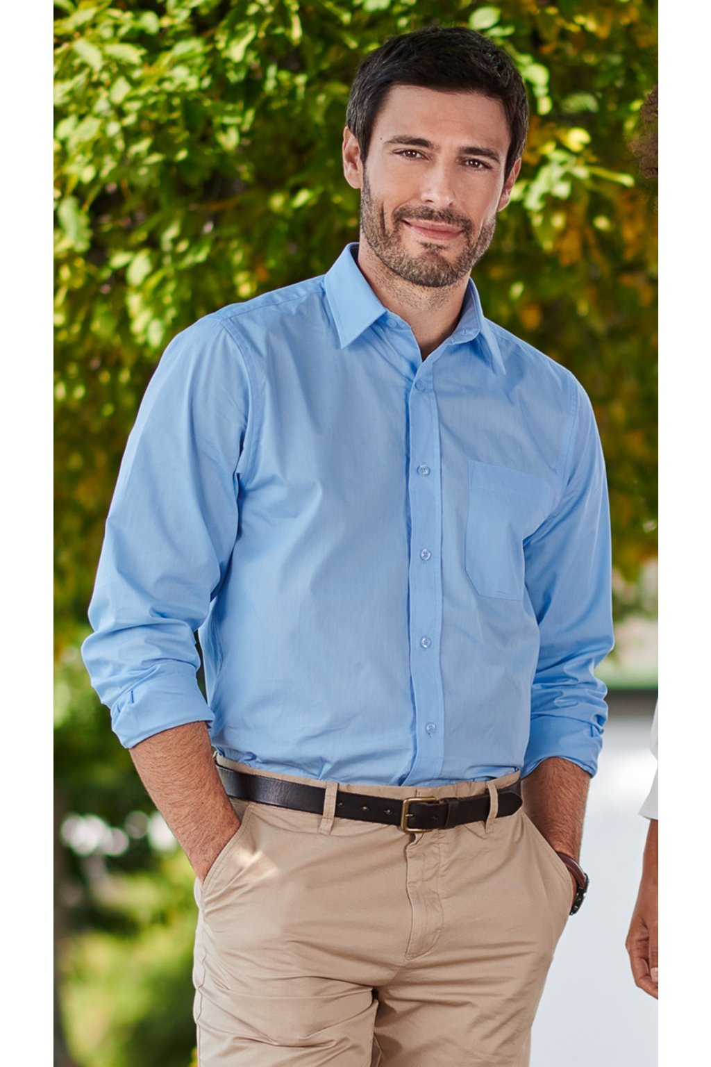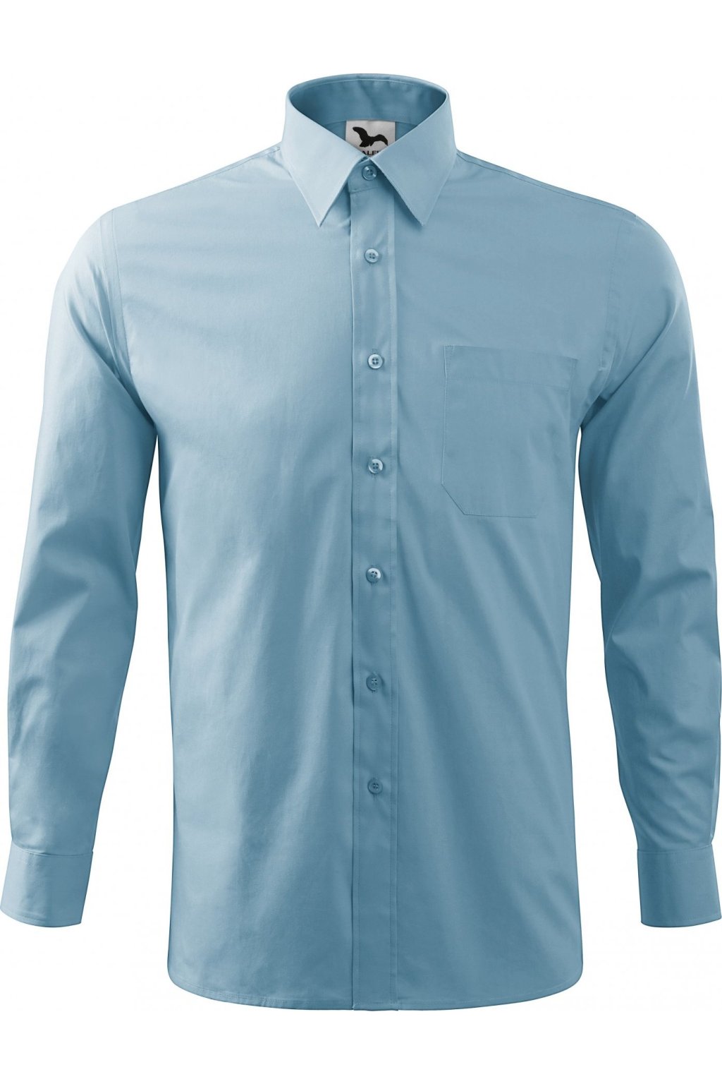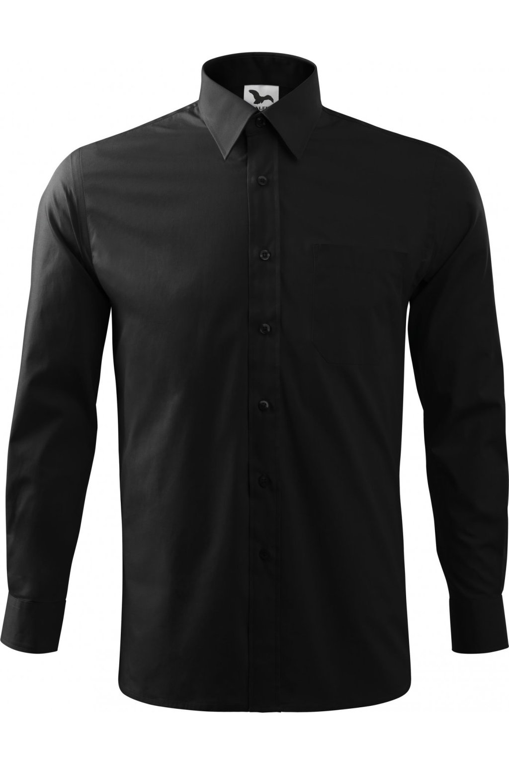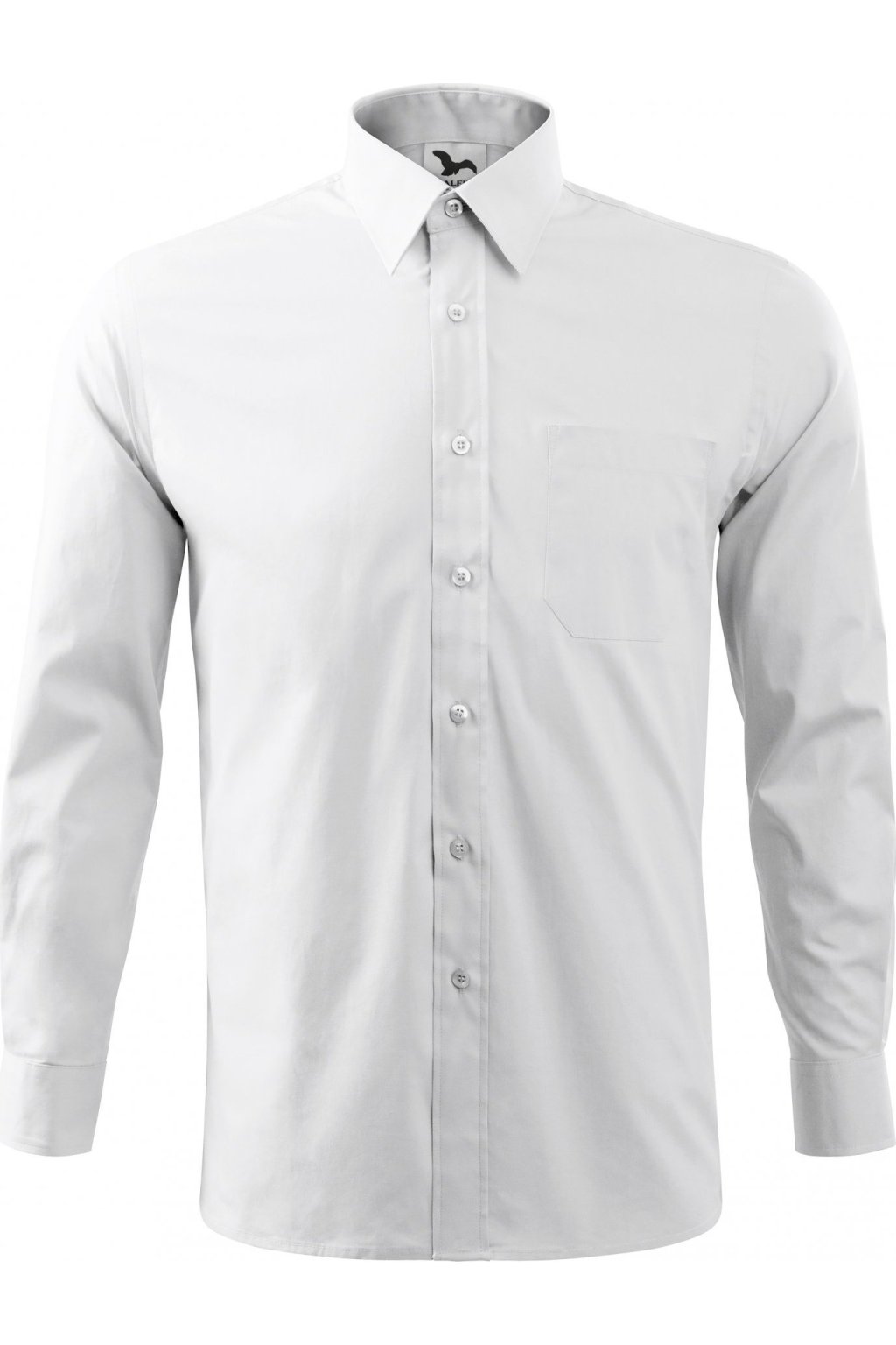 klasický střih s bočními švy, dvojité sedlo a záhyby na zadním dílu, dvoudílný košilový límec, přední kraje začištěny légou, nakládaná náprsní kapsa, dlouhé rukávy s kulatou manžetou na 1 knoflíček, knoflíčky v barvě materiálu (2 náhradní navíc)