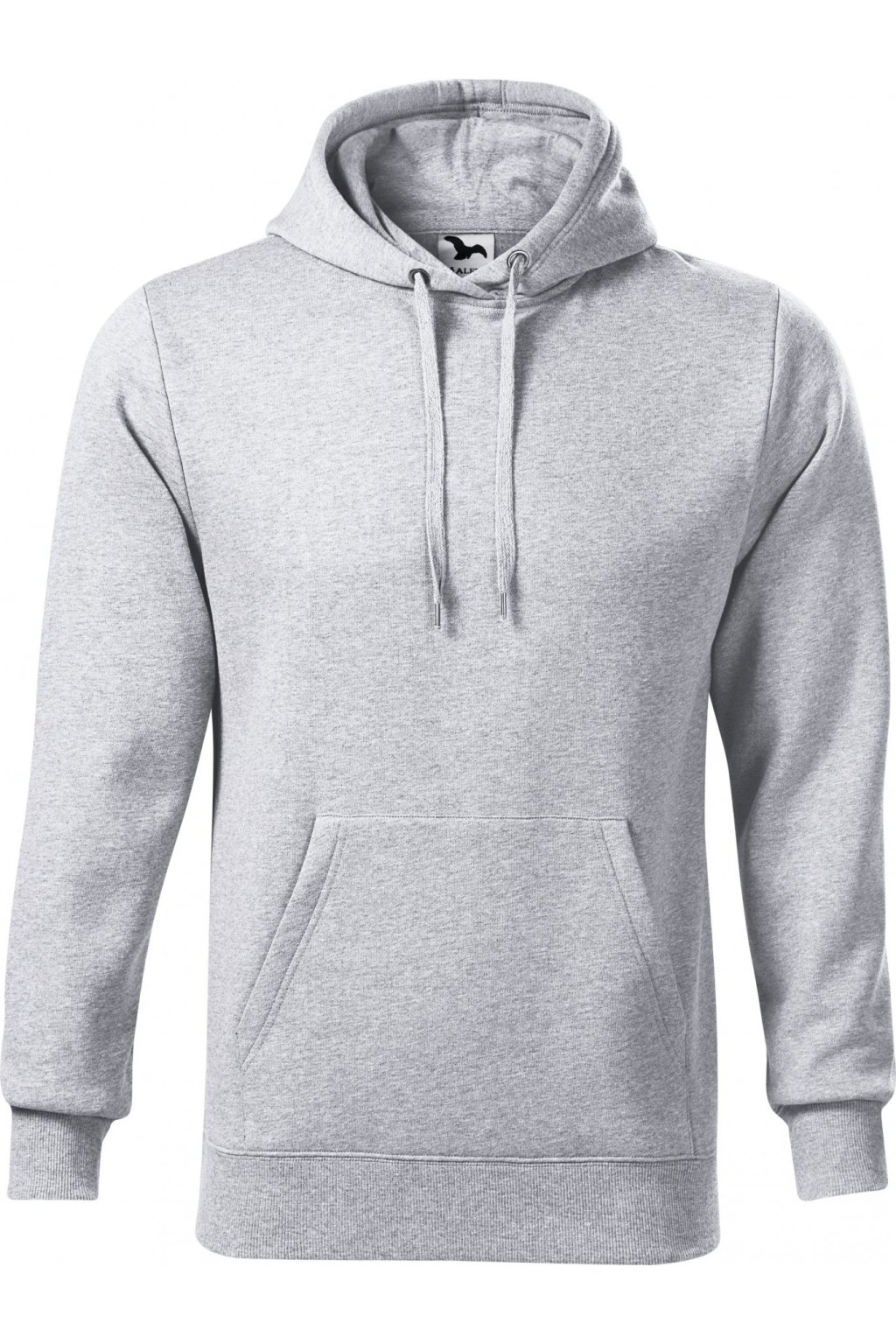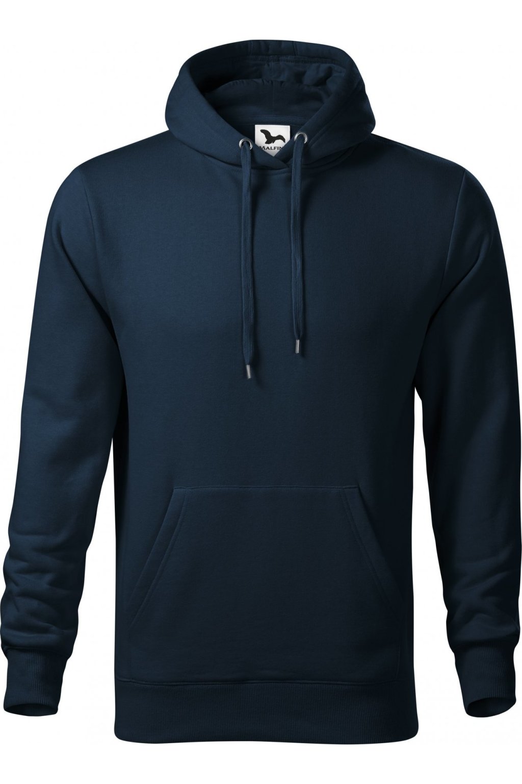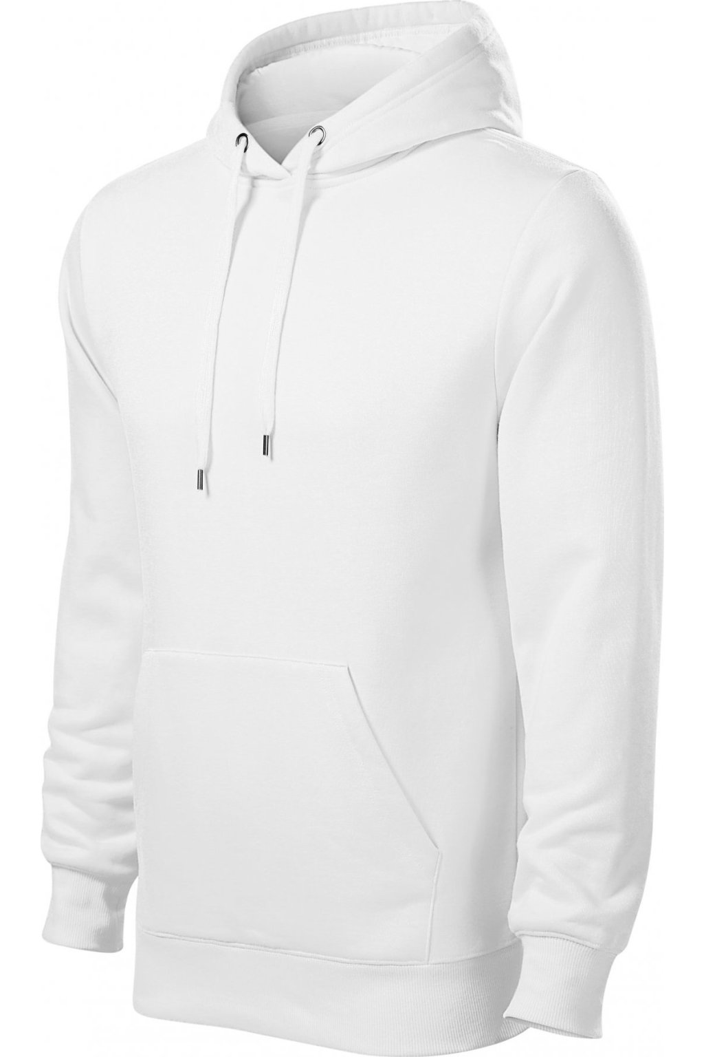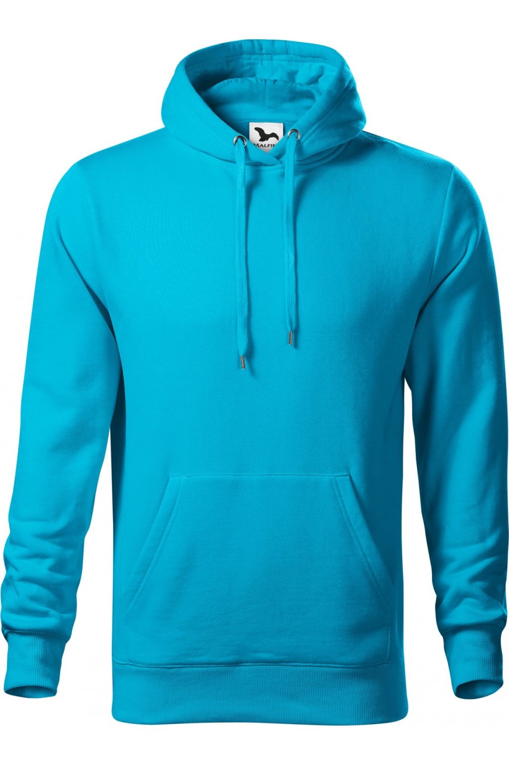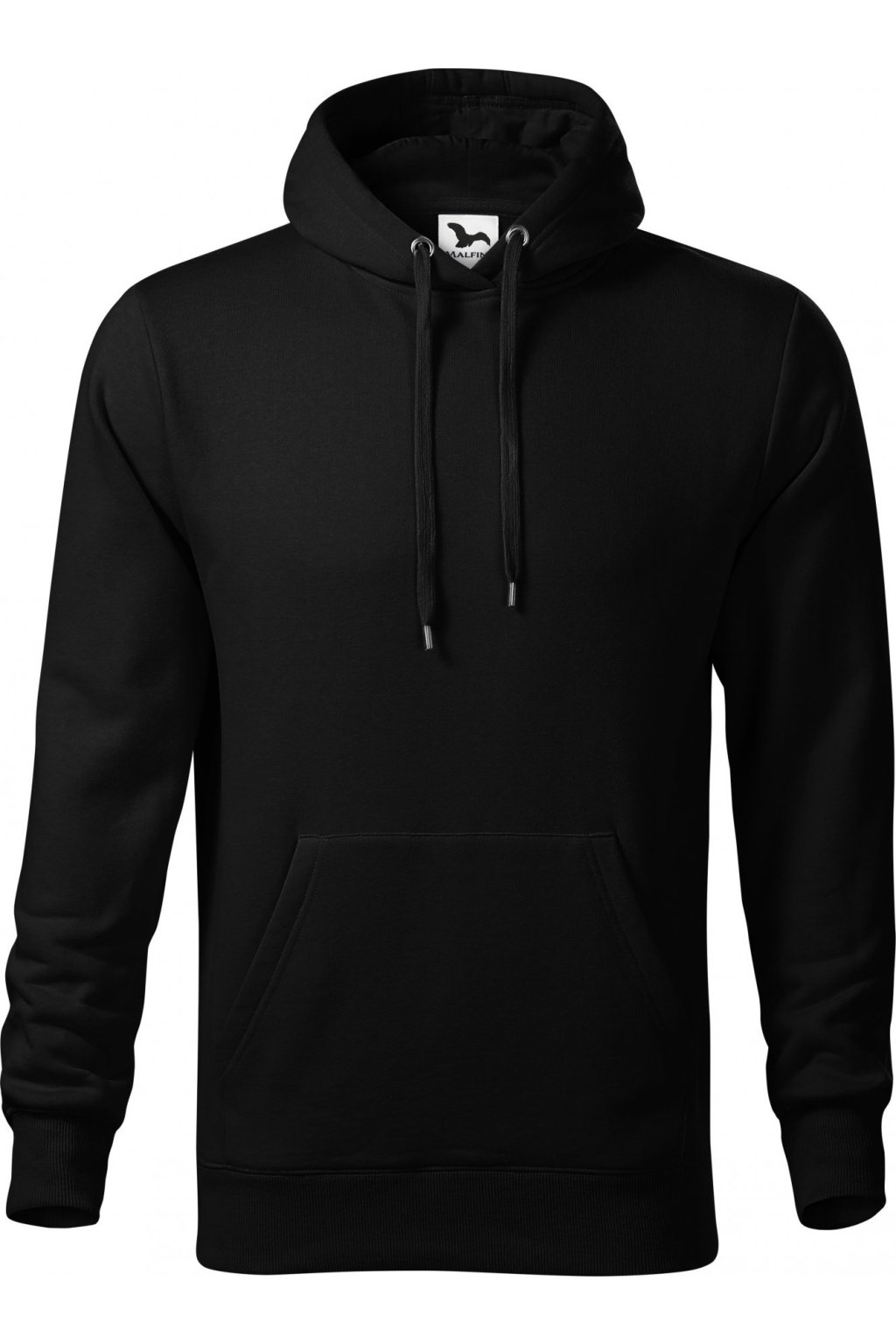 rovný střih s bočními švy, kapuce s podšívkou, na stažení šňůrkou, vnitřní část průkrčníku začištěna páskou v barvě vrchového materiálu, nakládaná kapsa ve stylu klokanky, dolní lem a manžety rukávů z žebrového úpletu 2:2 s 5 % elastanu, vnitřní strana počesaná