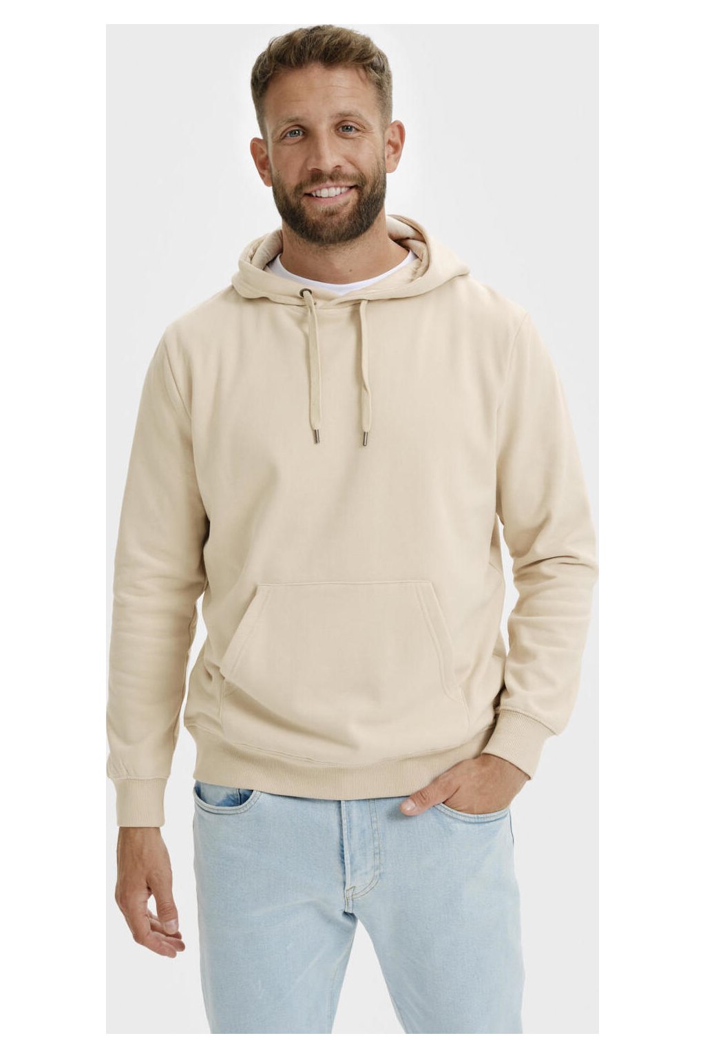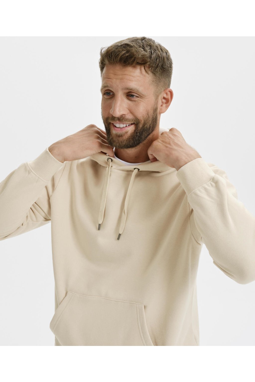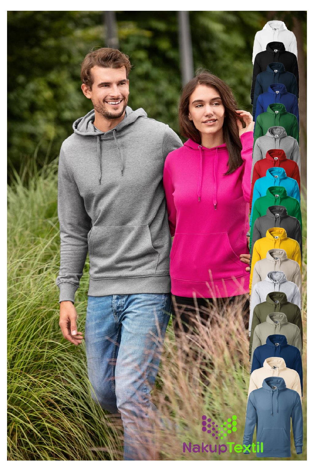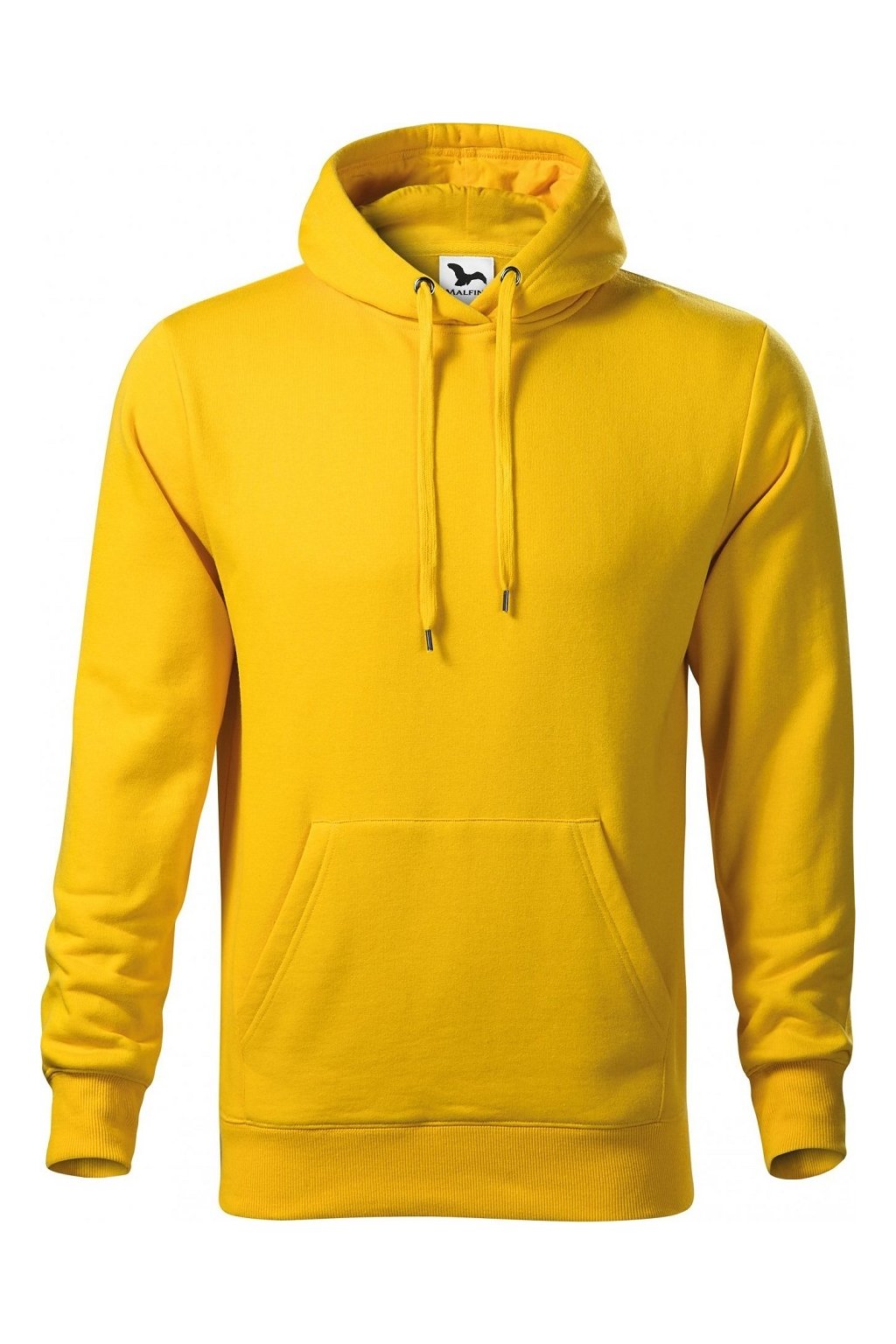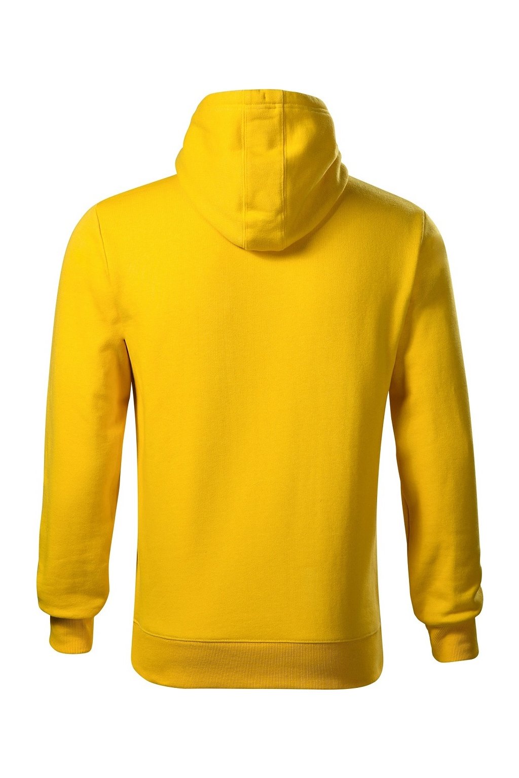 rovný střih s bočními švy, kapuce s podšívkou, na stažení šňůrkou, vnitřní část průkrčníku začištěna páskou v barvě vrchového materiálu, nakládaná kapsa ve stylu klokanky, dolní lem a manžety rukávů z žebrového úpletu 2:2 s 5 % elastanu, vnitřní strana počesaná
