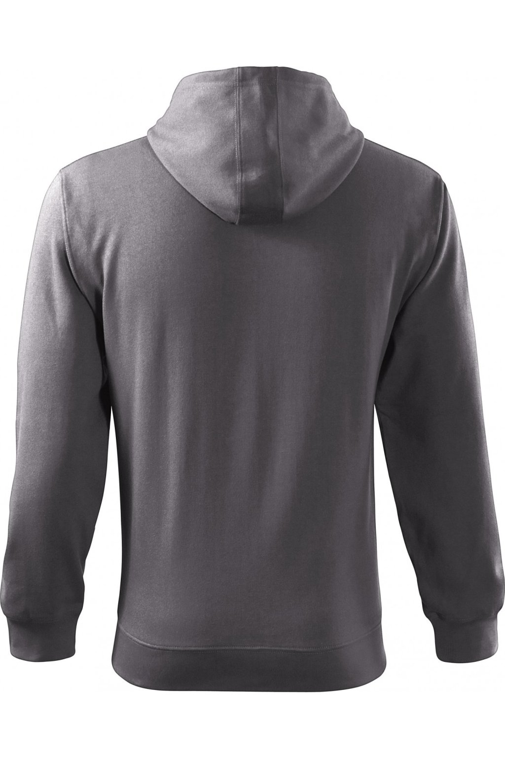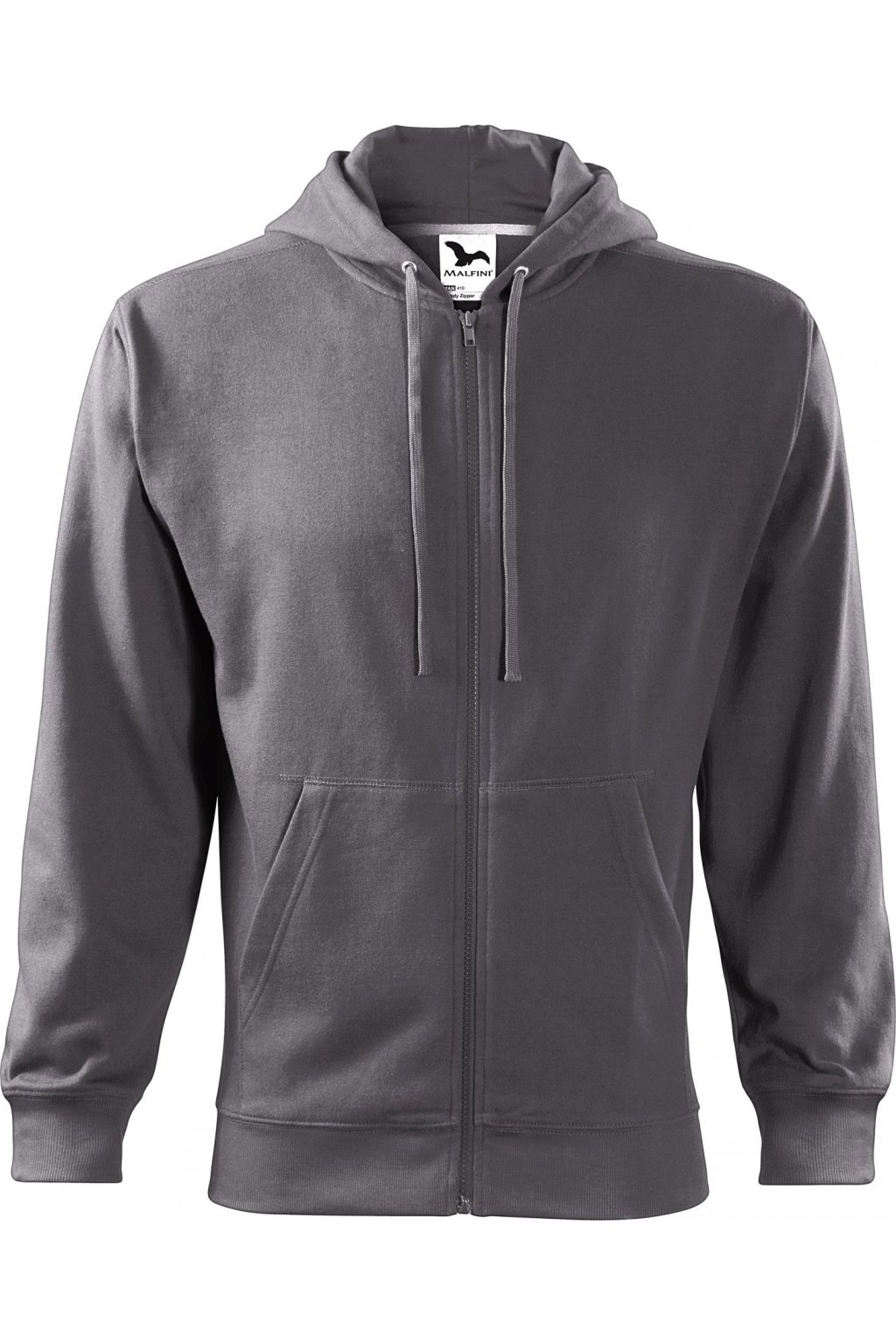 rovný střih s bočními švy, celopropínací kostěný zip, kapuce s podšívkou, na stažení šňůrkou, vnitřní část průkrčníku začištěna kontrastní páskou, nakládané kapsy ve stylu klokanky, dolní lem a manžety rukávů z žebrového úpletu 2:2 s 5 % elastanu, vnitřní strana počesaná