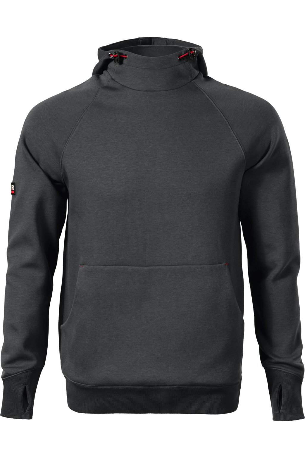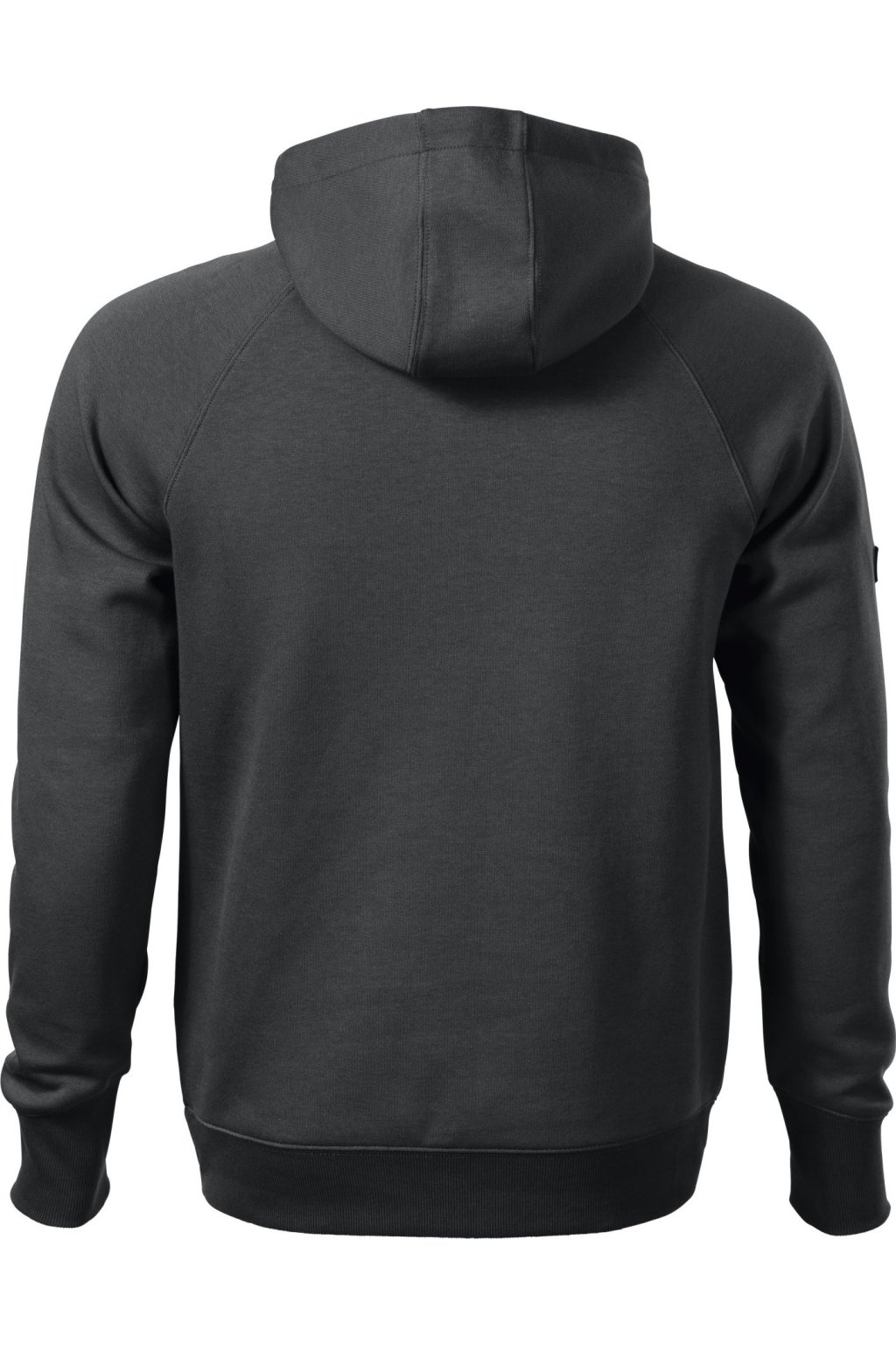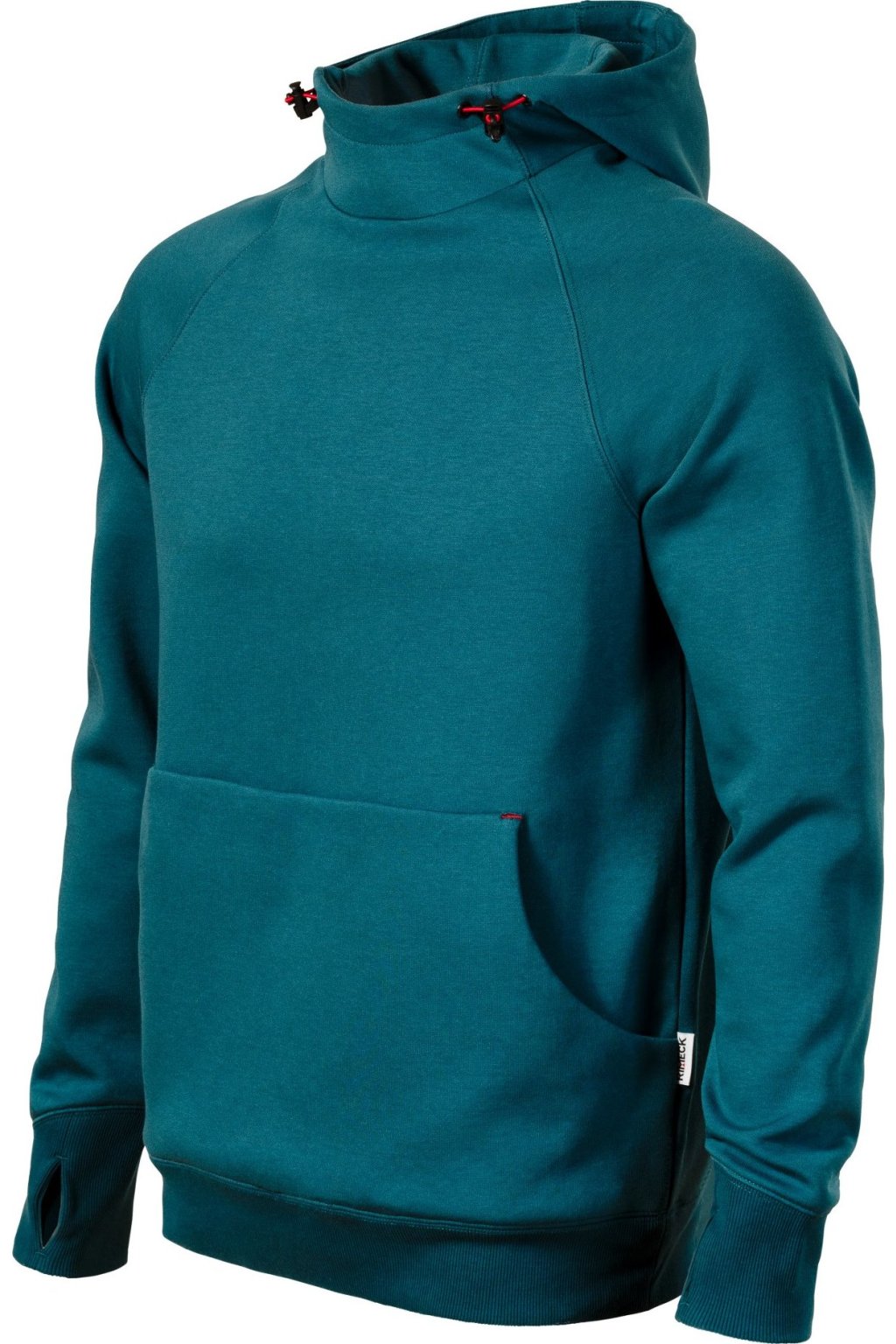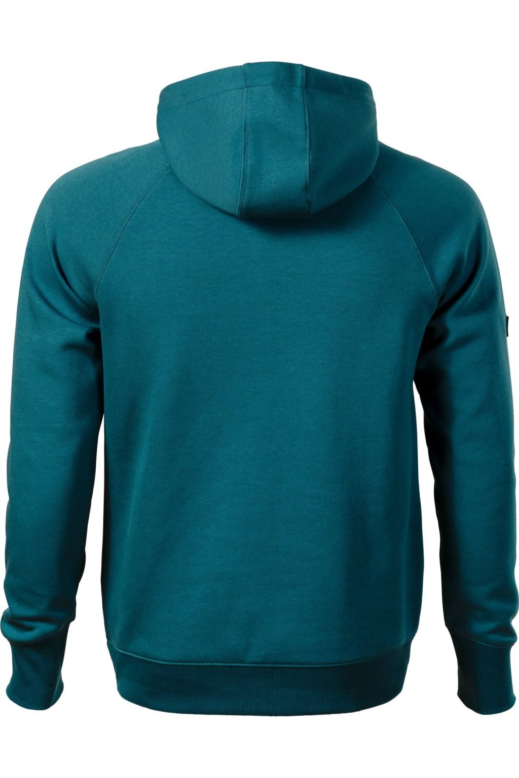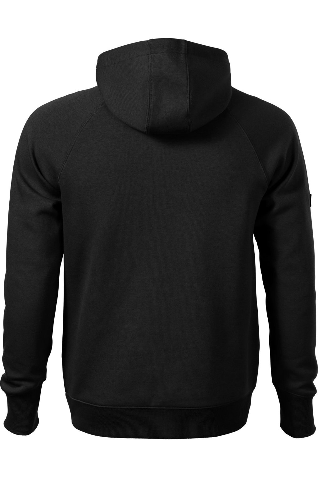 rovný střih s bočními švy, kapuce s podšívkou, na stažení elastickou šňůrkou, vnitřní část průkrčníku začištěna kontrastní páskou, raglánové rukávy s dvojitým prošitím, nakládaná kapsa ve stylu klokanky, 2 skryté kapsy na zip, dolní lem a manžety rukávů z žebrového úpletu 2:2 s 5 % elastanu, manžety s otvorem pro palec, kontrastní prvky