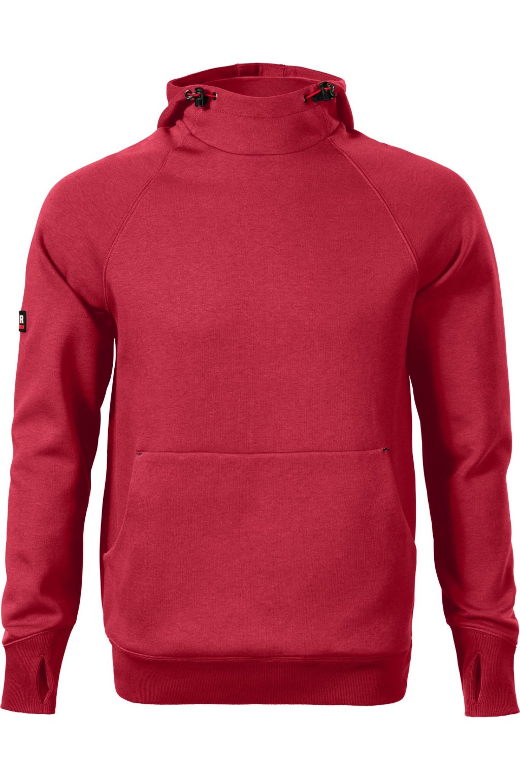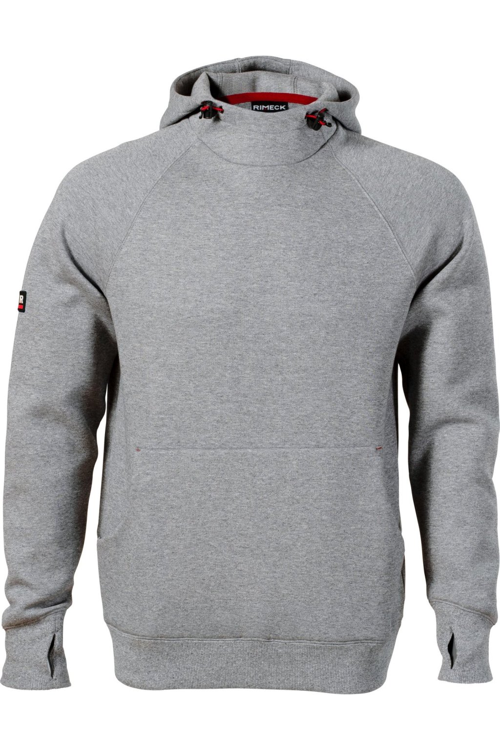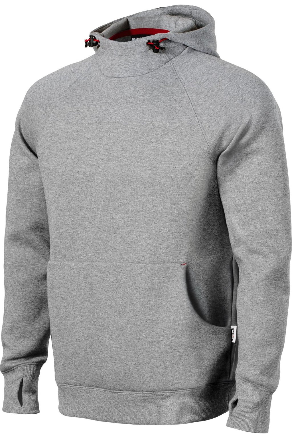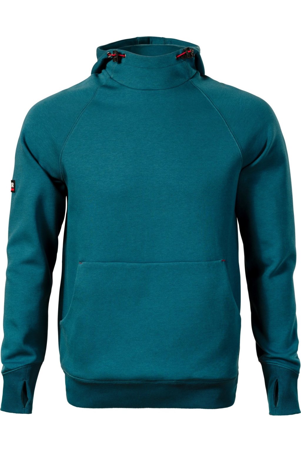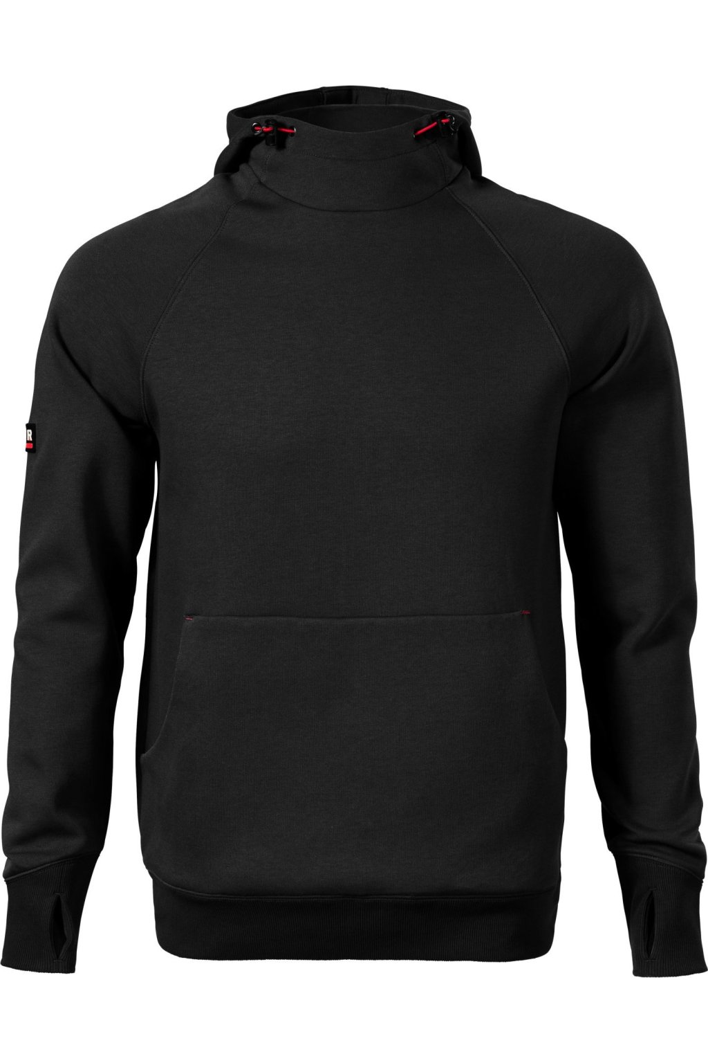 rovný střih s bočními švy, kapuce s podšívkou, na stažení elastickou šňůrkou, vnitřní část průkrčníku začištěna kontrastní páskou, raglánové rukávy s dvojitým prošitím, nakládaná kapsa ve stylu klokanky, 2 skryté kapsy na zip, dolní lem a manžety rukávů z žebrového úpletu 2:2 s 5 % elastanu, manžety s otvorem pro palec, kontrastní prvky