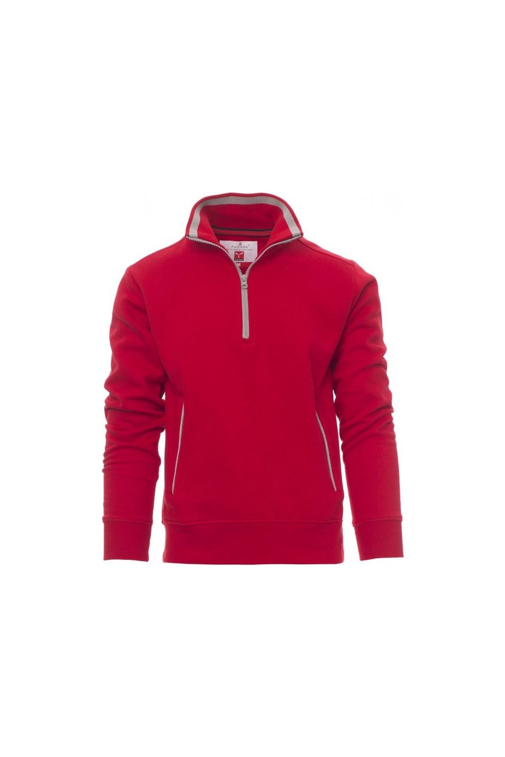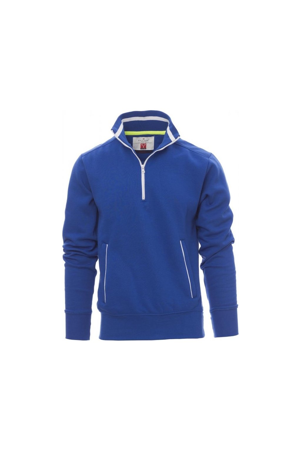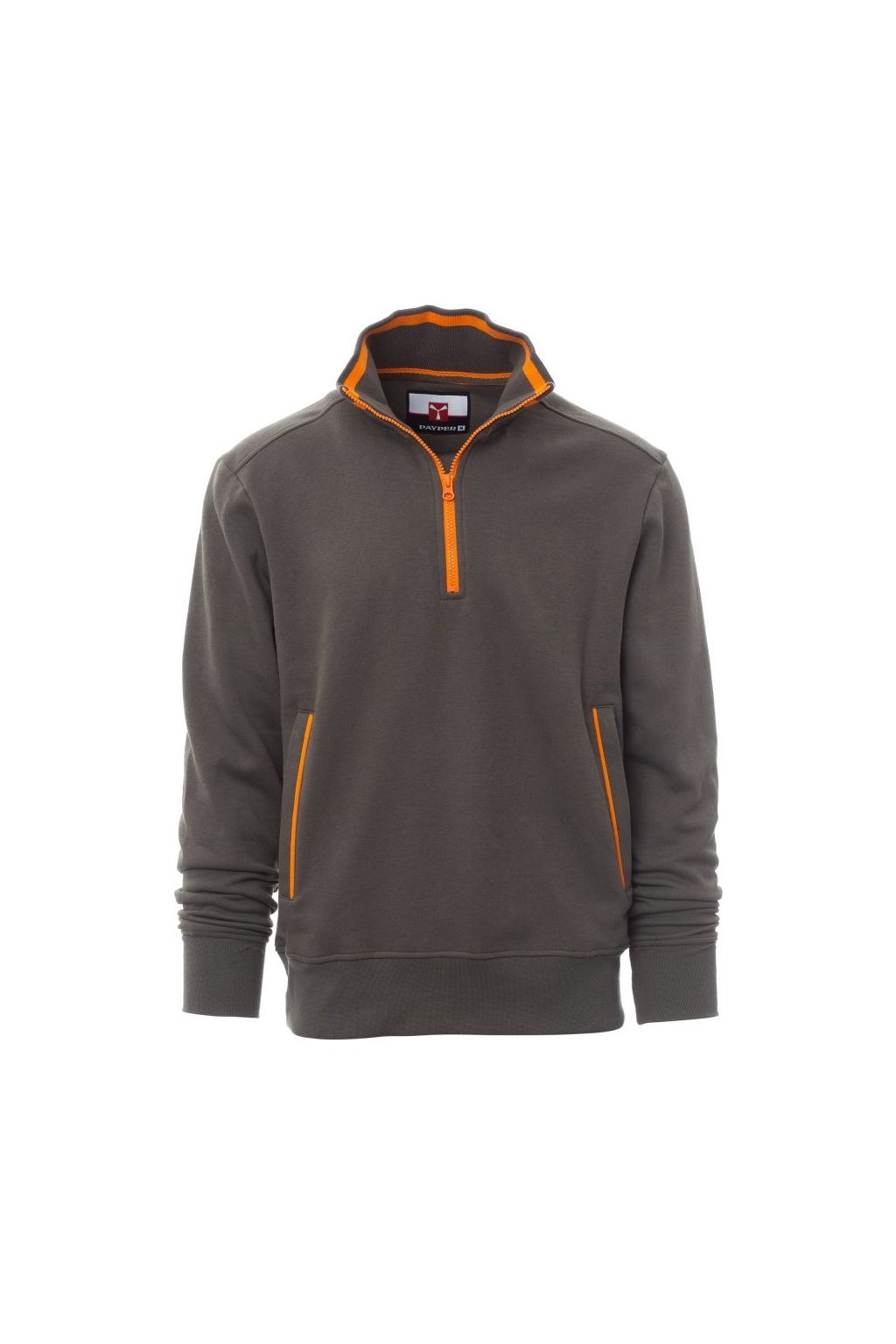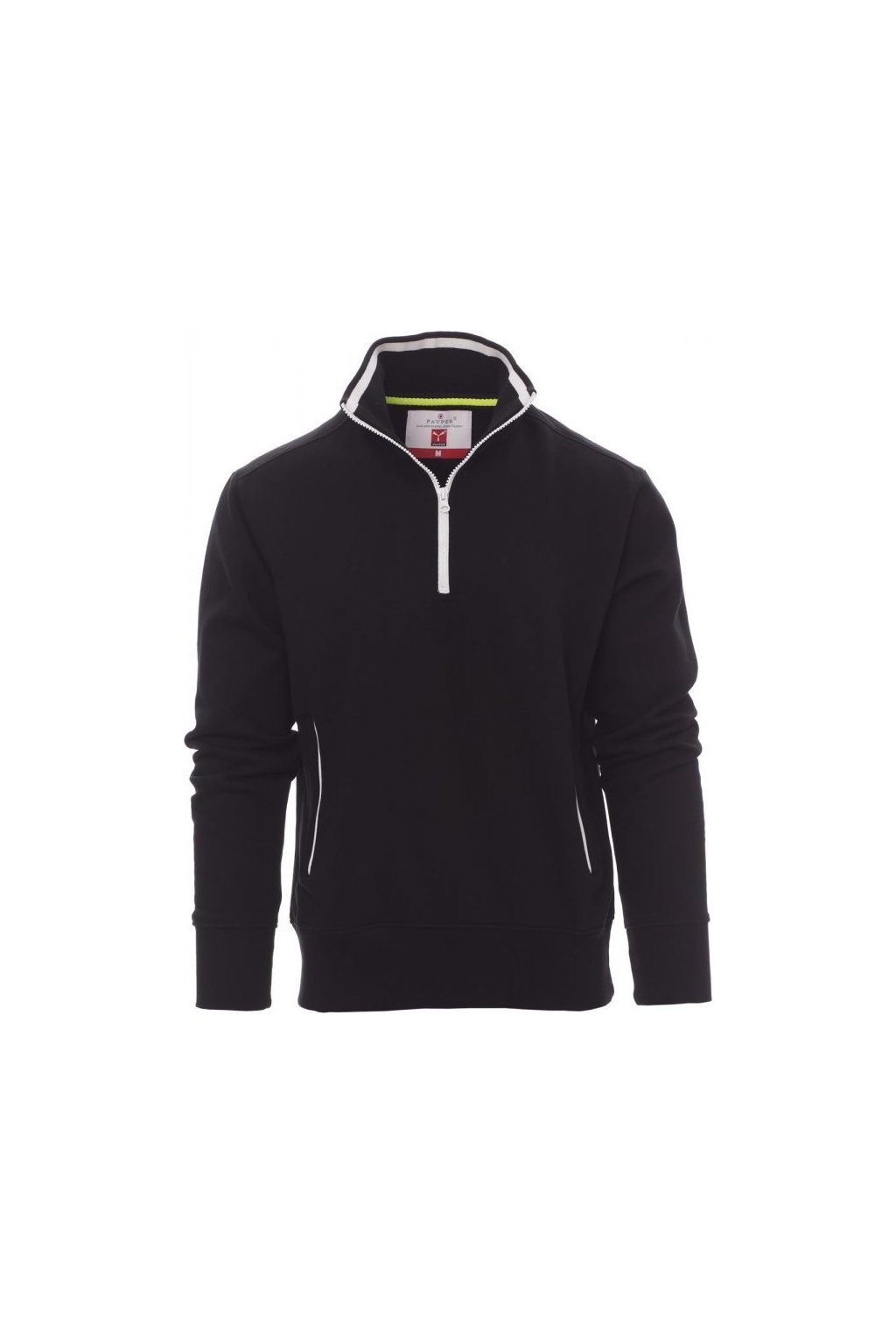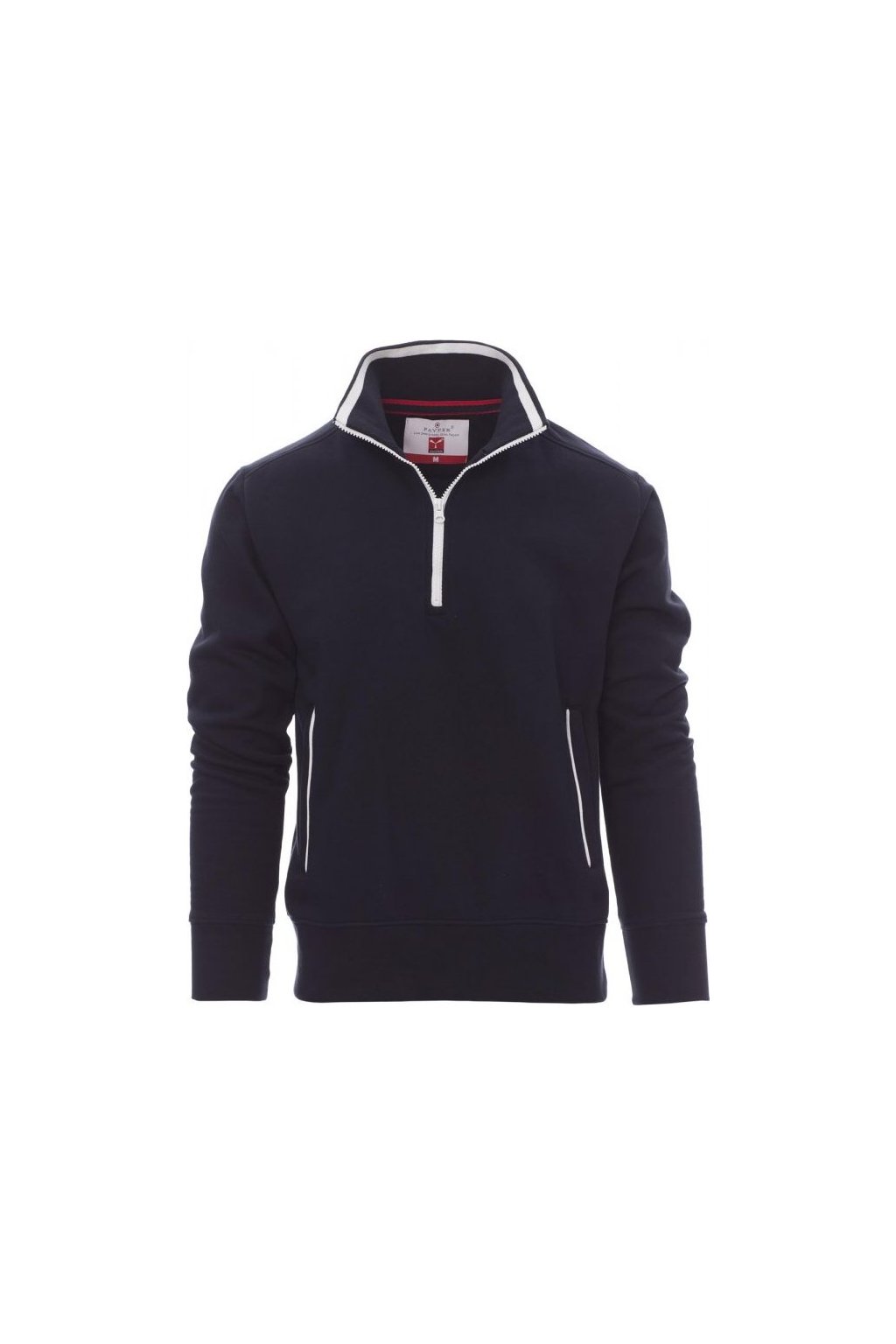Pánská mikina s plastovým polozipem v kontrastní barvě, s kovovým jezdcem, kontrastní lem kolem krku a postranních kapes, všívané rukávy, límec, manžety a pas s elastickým žebrováním, zesílené švy.