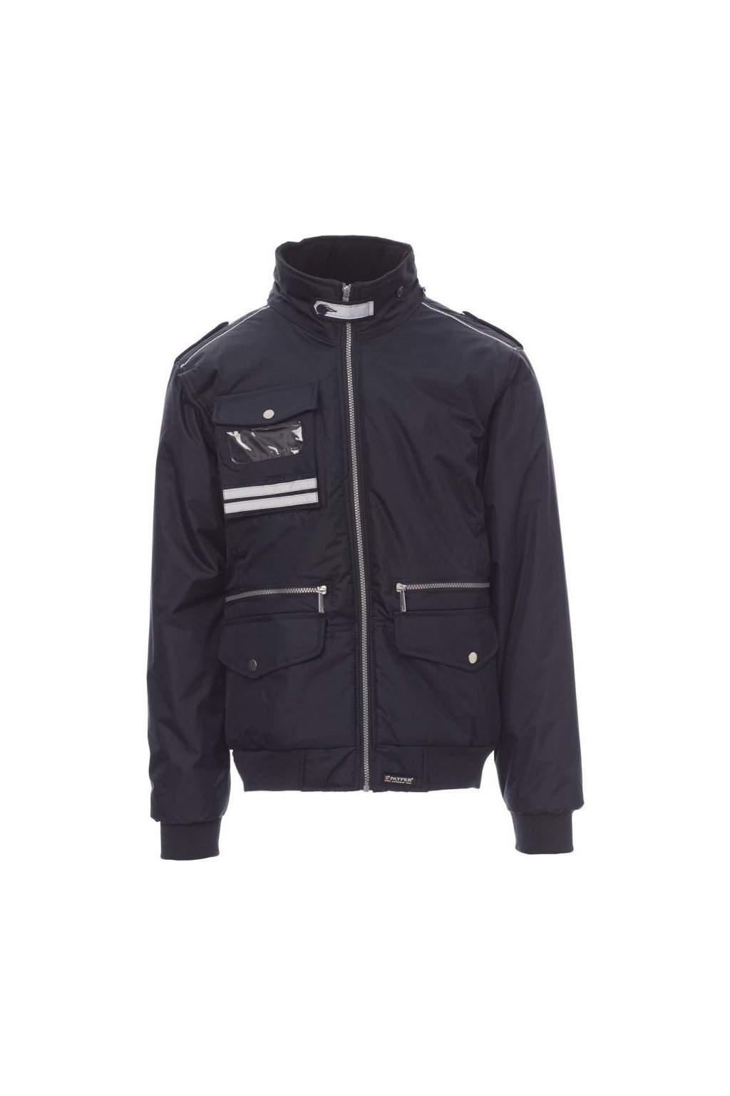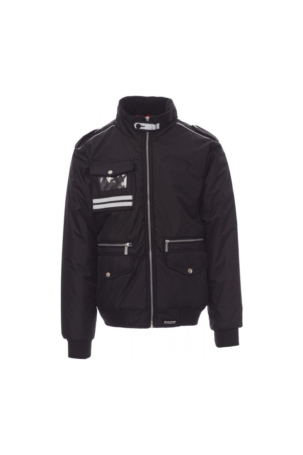 Pánská bunda casual přiléhavého střihu s plastovým zipem s kovovým jezdcem, kapuce v límci, žebrovaný pas a manžety, nárameníky a límec na zip, dvě kapsy s LOCK SYSTEMem, dvě kapsy na zip, jedna kapsa s oboustranným pouzdrem na jmenovku, reflexní lemování na ramenou, dva reflexní proužky na kapse na hrudi a dva na zádech. Vnitřek: zateplení, s postříbřeným zátěrem vysoké hustoty, mikroflísová záda, flísový límeček, jedna kapsa.