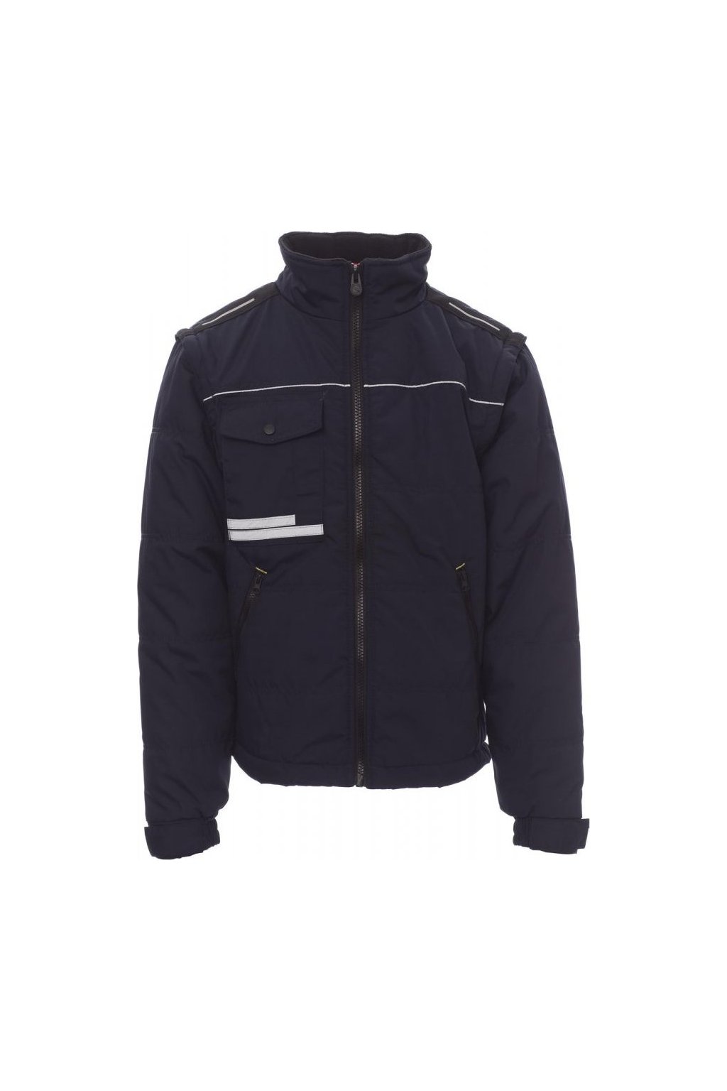 Pánská bunda s odepínacími rukávy, tvarovaná záda, 8mm plastový zip s kovovým jezdcem, dvě velké vnější kapsy na zip, kapuce v límci, velká víceúčelová kapsa na hrudi, kapsa na smartphone s reflexními pruhy, upínací kroužek na jmenovku. Vnitřek: zateplení, prošívaný materiál podšívky s vysokou hustotou, flísový vnitřek límce, jedna kapsa.