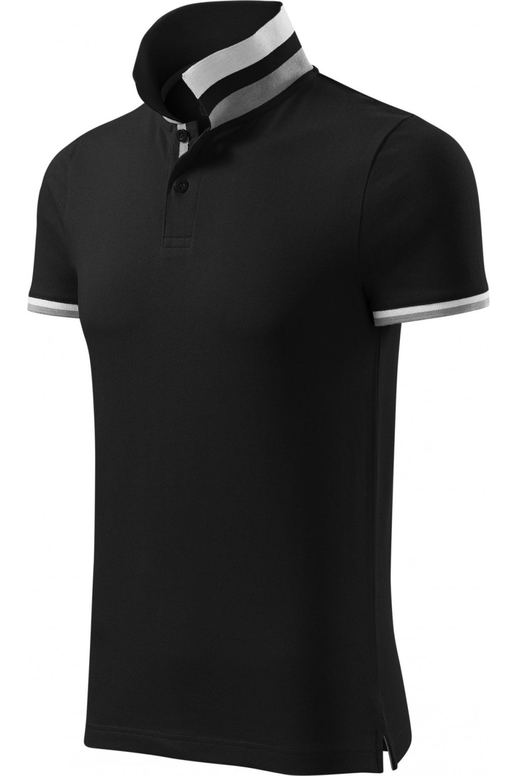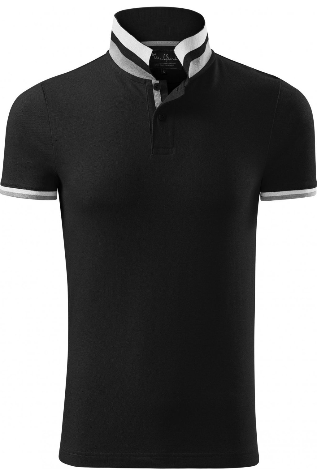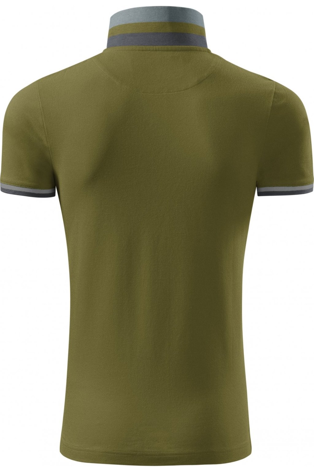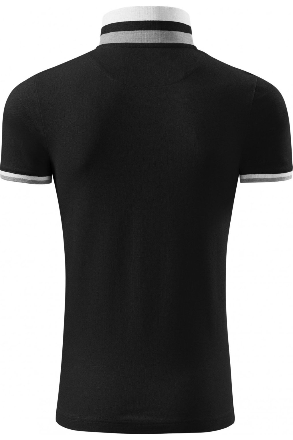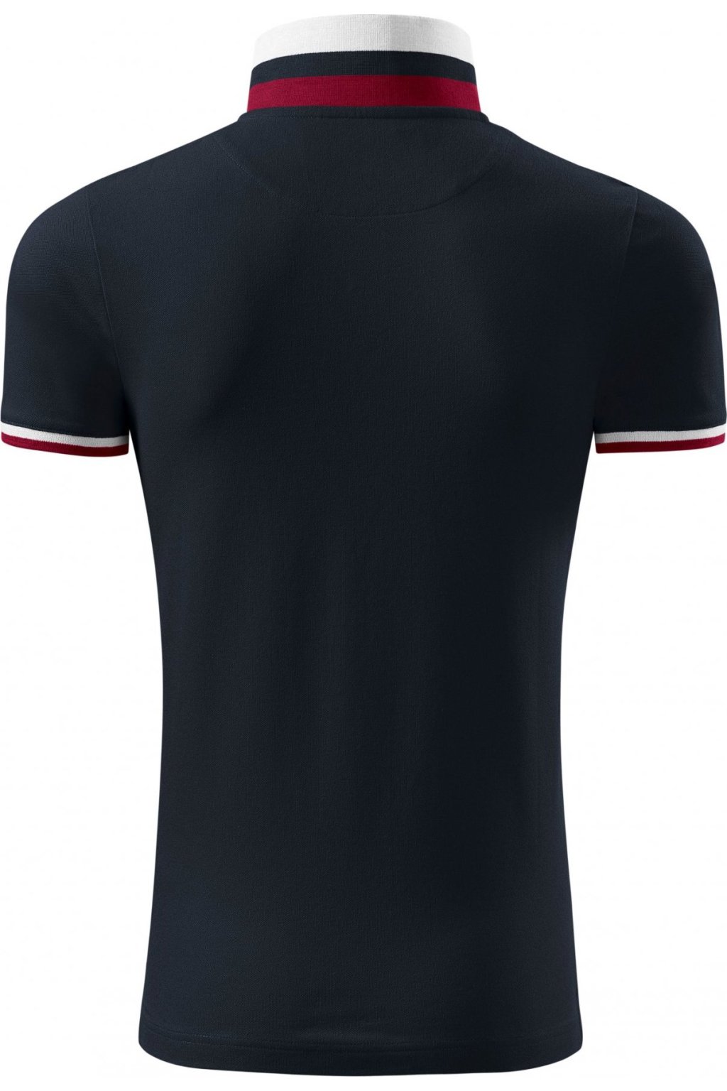střih s bočními švy, límeček a lemy rukávů z žebrového úpletu 1:1, spodní část límečku a lemy rukávů s kontrastními pruhy, léga s 2 knoflíčky v barvě materiálu, rozparky v bočních švech a spodní léga s kontrastní páskou, vnitřní průkrčník začištěn kontrastní páskou, zpevnění ramenních švů páskou