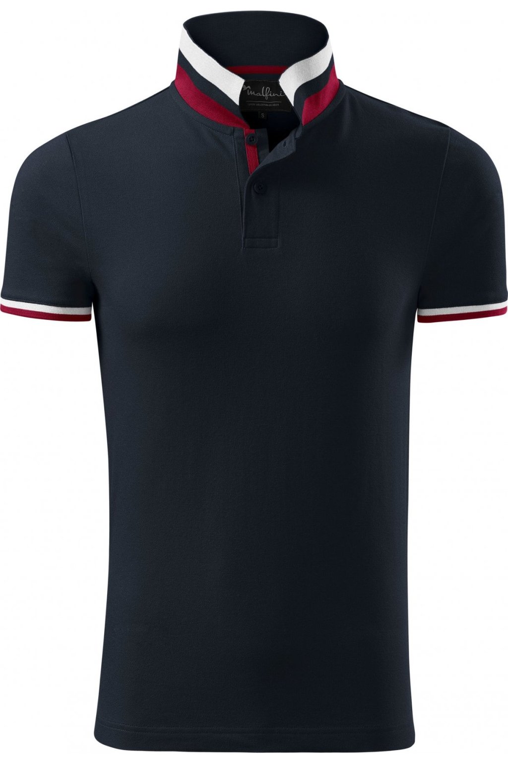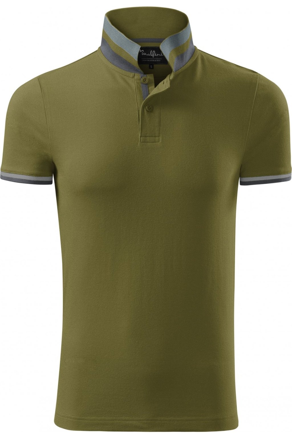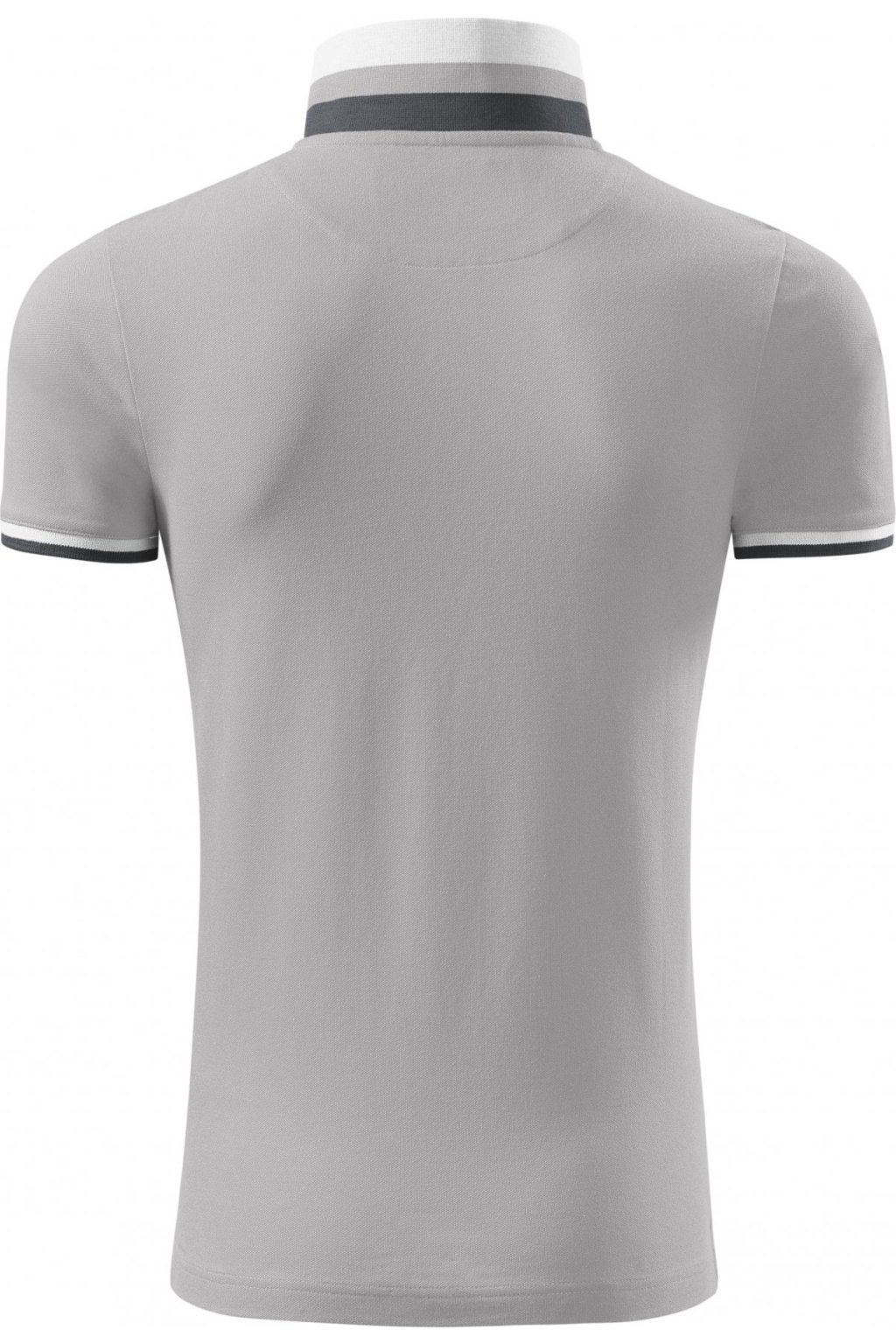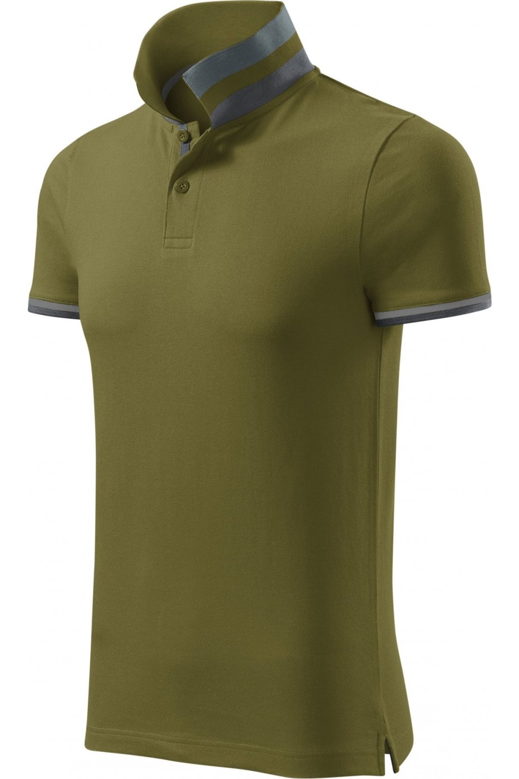 střih s bočními švy, límeček a lemy rukávů z žebrového úpletu 1:1, spodní část límečku a lemy rukávů s kontrastními pruhy, léga s 2 knoflíčky v barvě materiálu, rozparky v bočních švech a spodní léga s kontrastní páskou, vnitřní průkrčník začištěn kontrastní páskou, zpevnění ramenních švů páskou