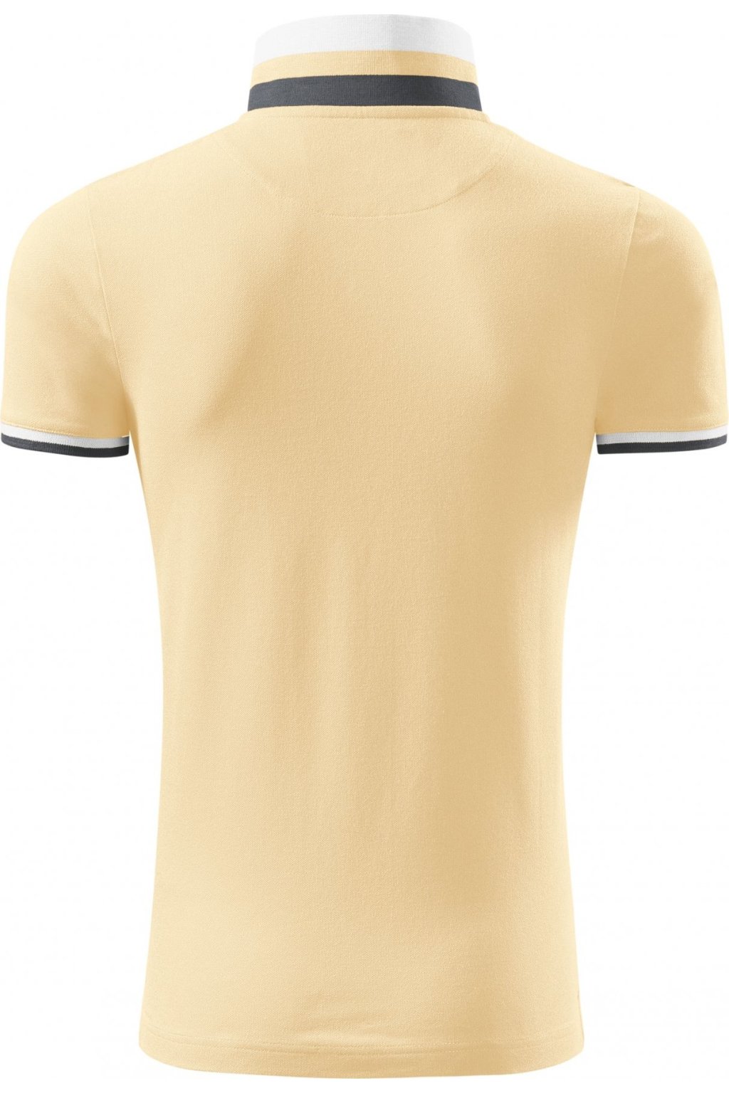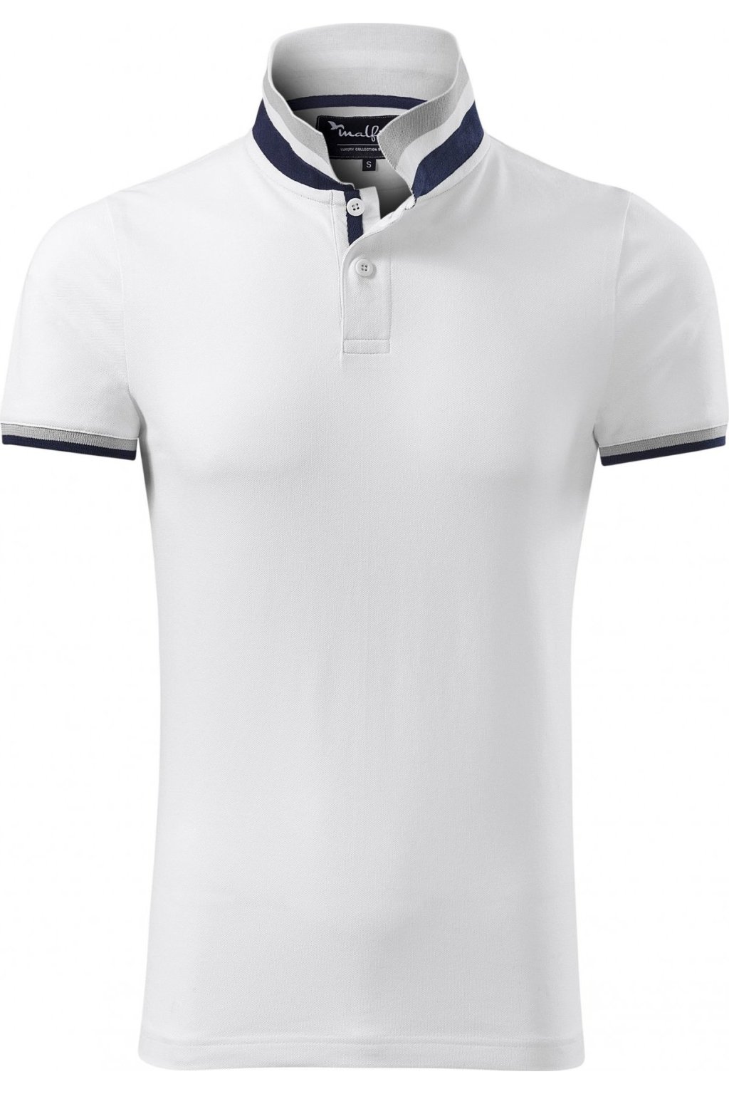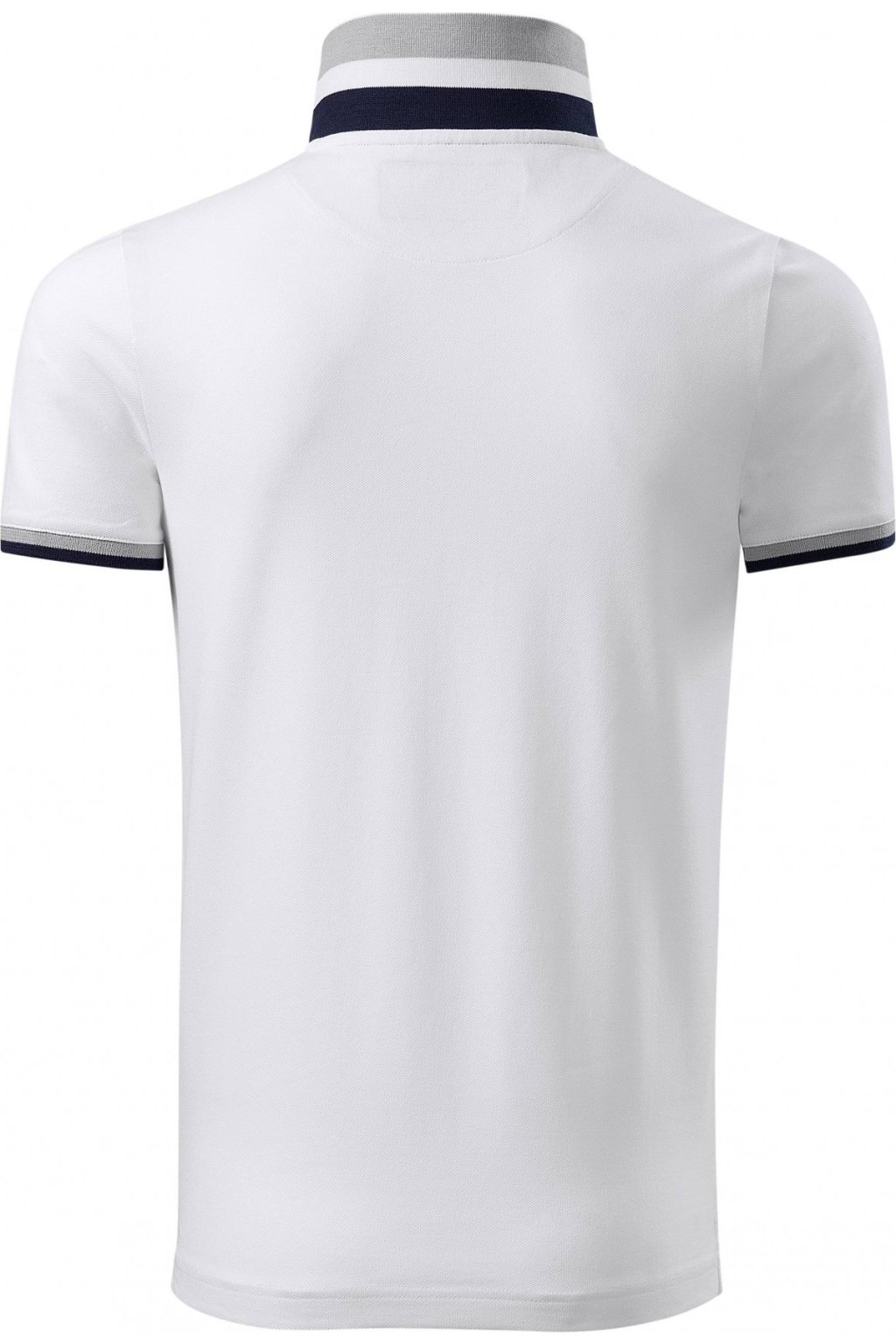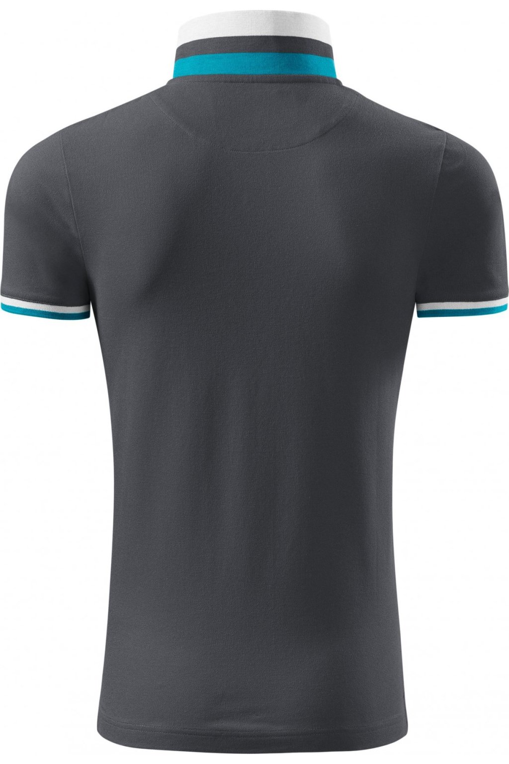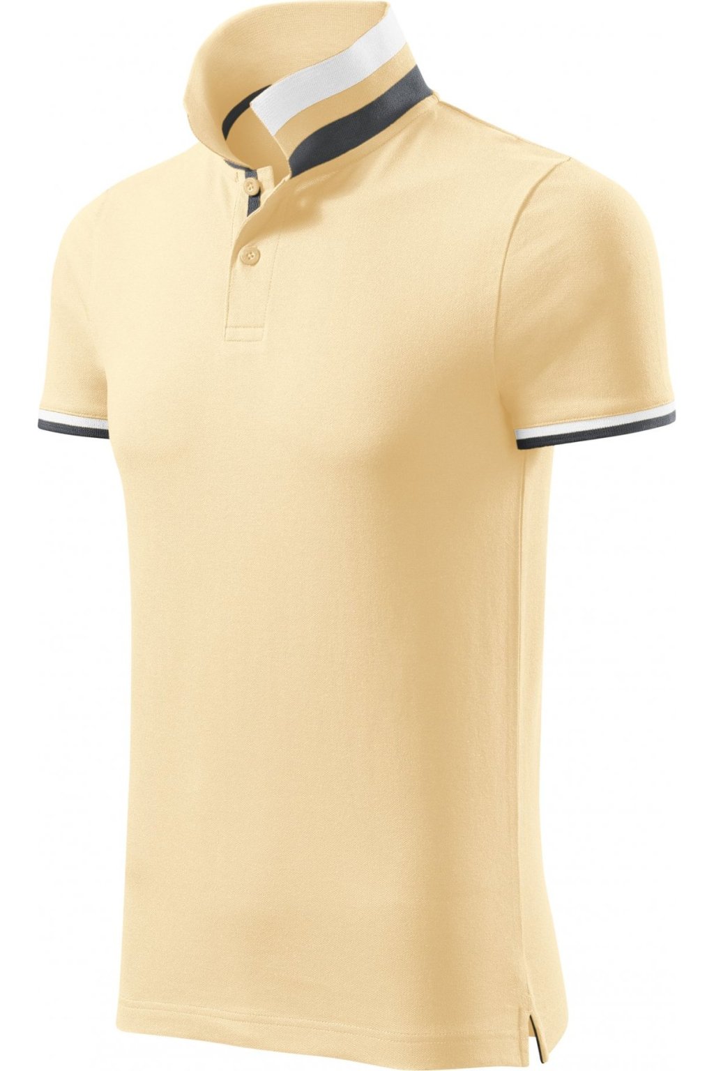 střih s bočními švy, límeček a lemy rukávů z žebrového úpletu 1:1, spodní část límečku a lemy rukávů s kontrastními pruhy, léga s 2 knoflíčky v barvě materiálu, rozparky v bočních švech a spodní léga s kontrastní páskou, vnitřní průkrčník začištěn kontrastní páskou, zpevnění ramenních švů páskou