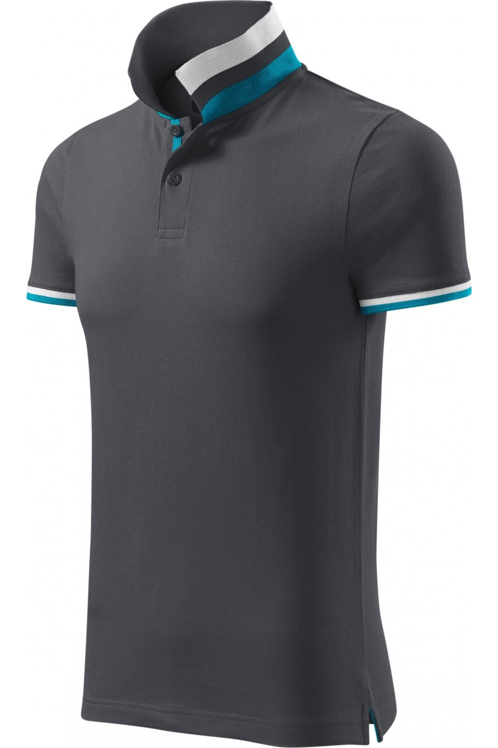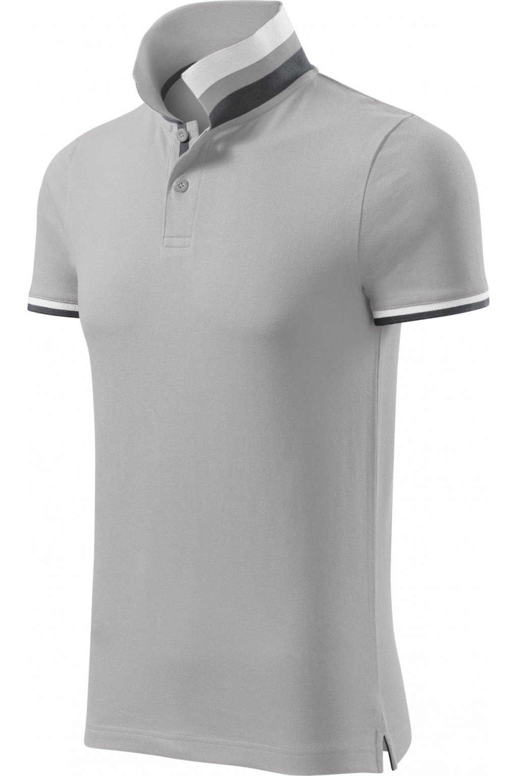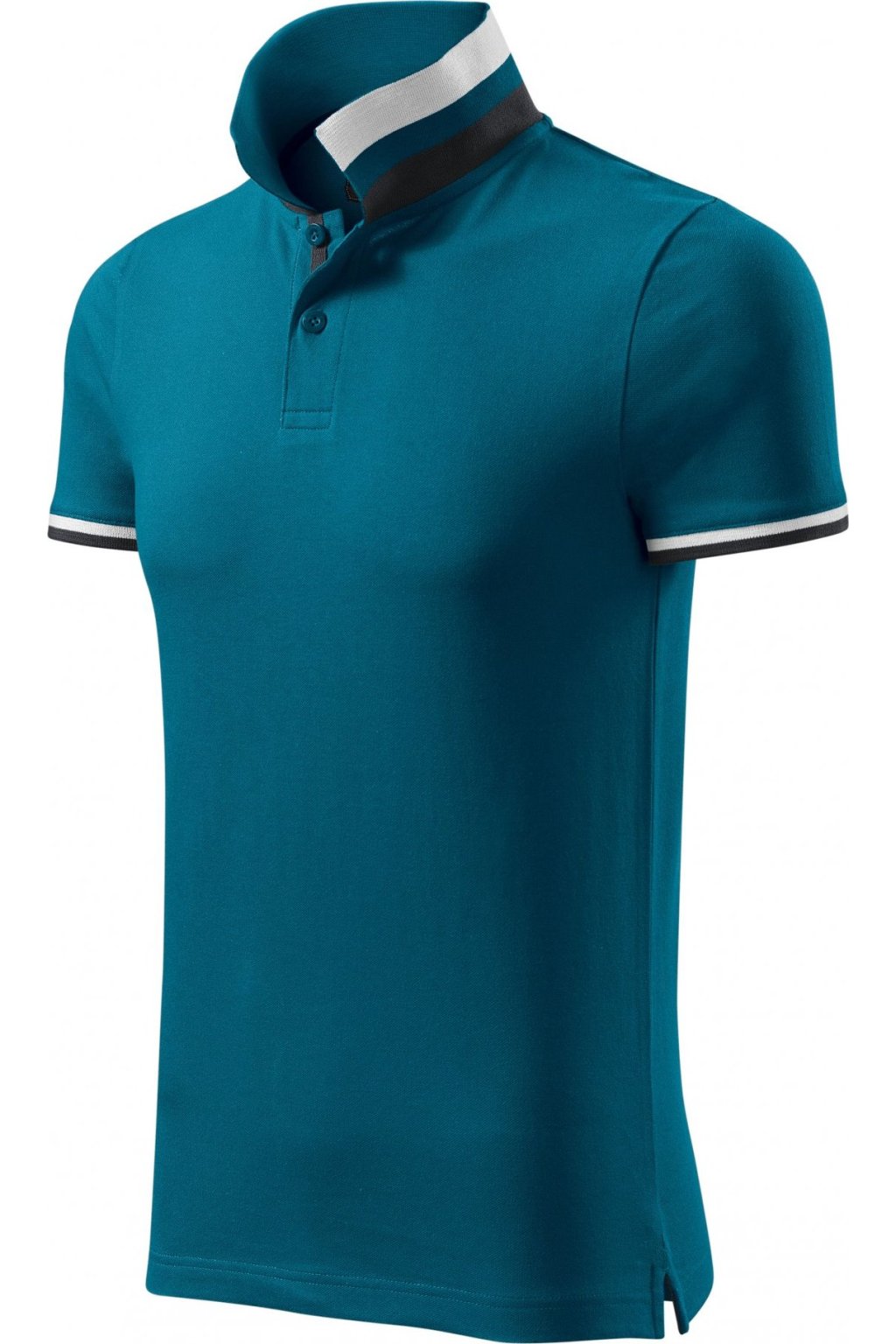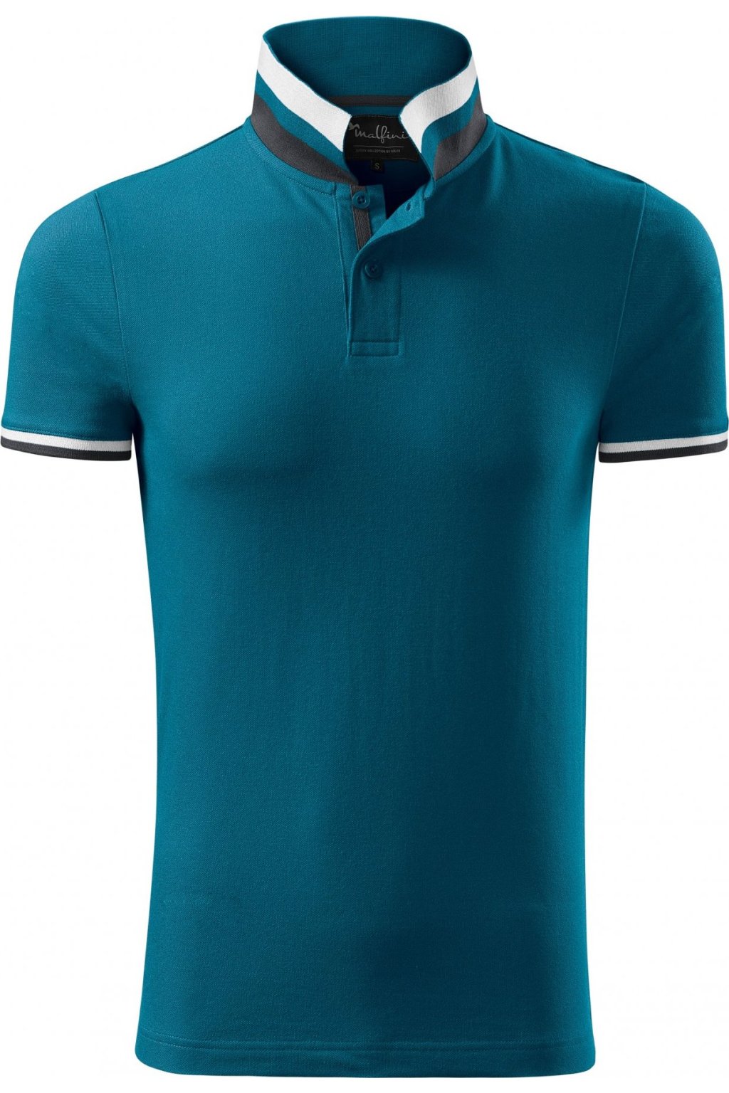 střih s bočními švy, límeček a lemy rukávů z žebrového úpletu 1:1, spodní část límečku a lemy rukávů s kontrastními pruhy, léga s 2 knoflíčky v barvě materiálu, rozparky v bočních švech a spodní léga s kontrastní páskou, vnitřní průkrčník začištěn kontrastní páskou, zpevnění ramenních švů páskou