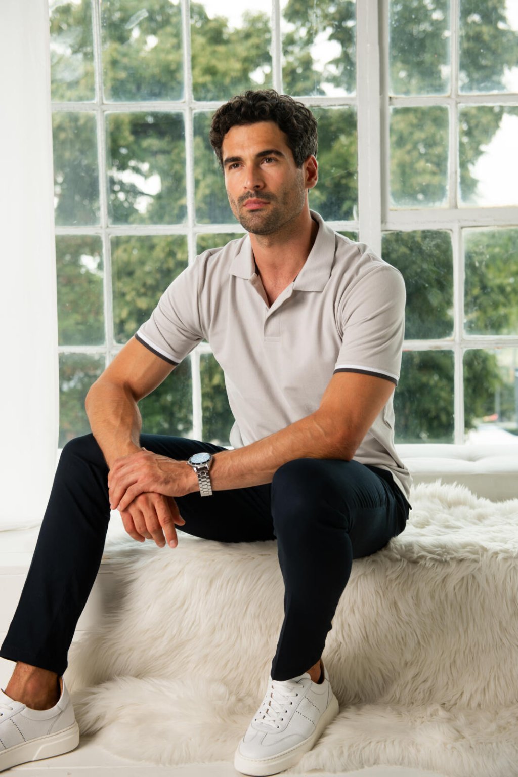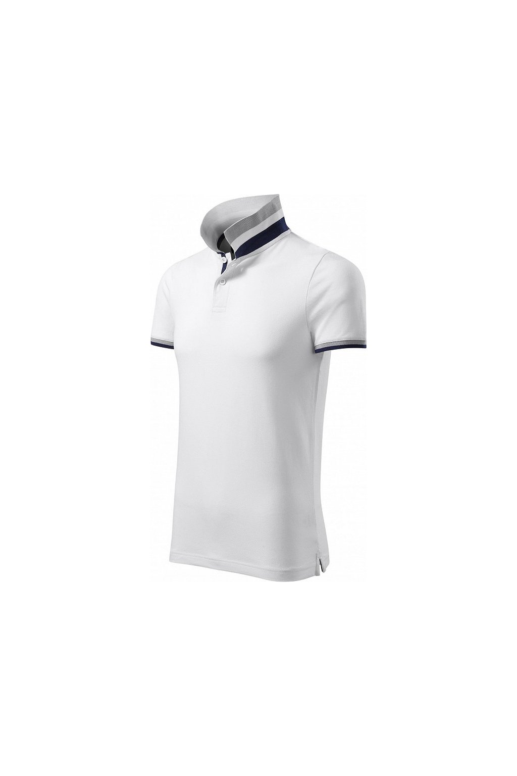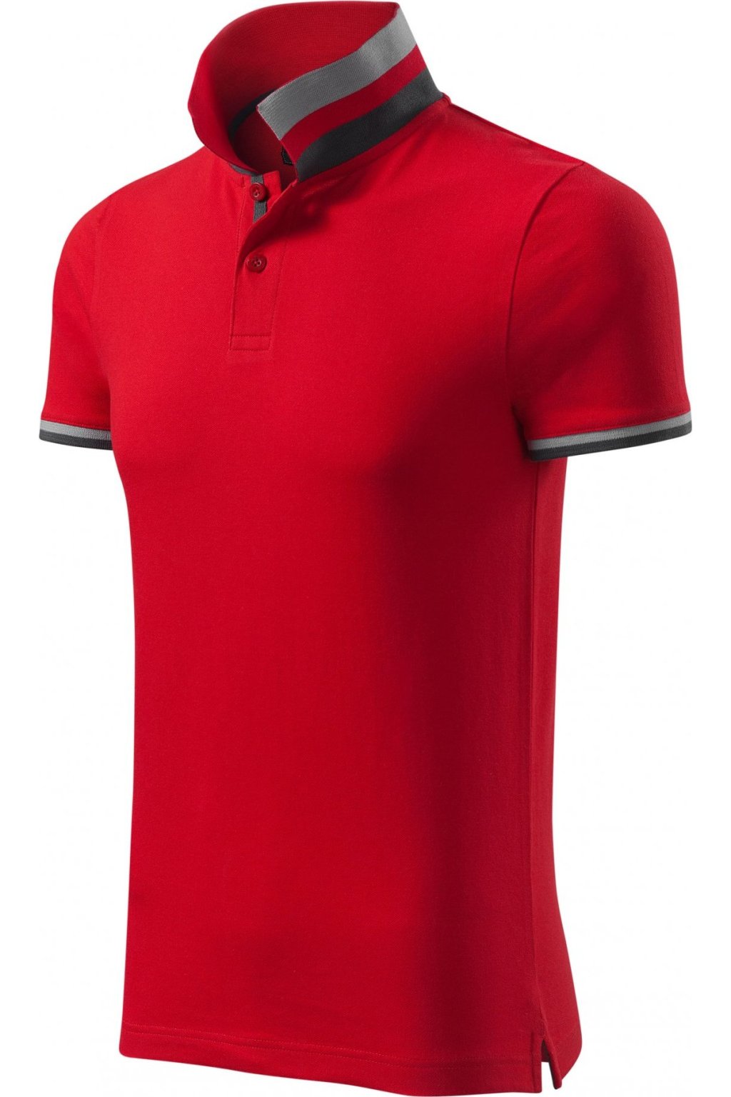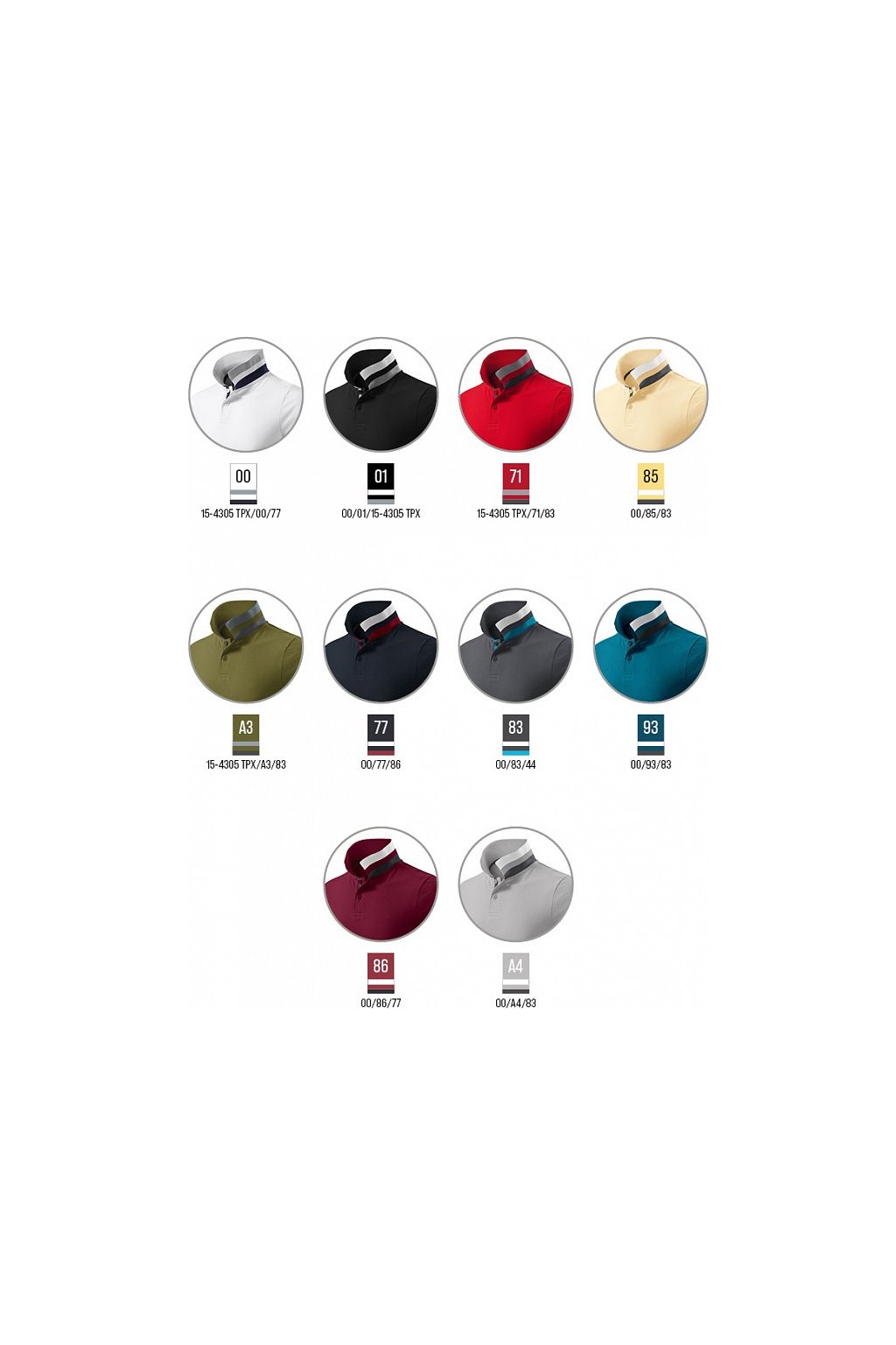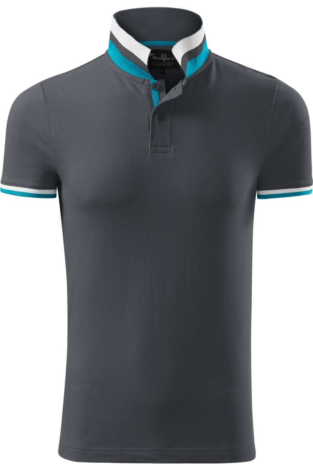 střih s bočními švy, límeček a lemy rukávů z žebrového úpletu 1:1, spodní část límečku a lemy rukávů s kontrastními pruhy, léga s 2 knoflíčky v barvě materiálu, rozparky v bočních švech a spodní léga s kontrastní páskou, vnitřní průkrčník začištěn kontrastní páskou, zpevnění ramenních švů páskou
