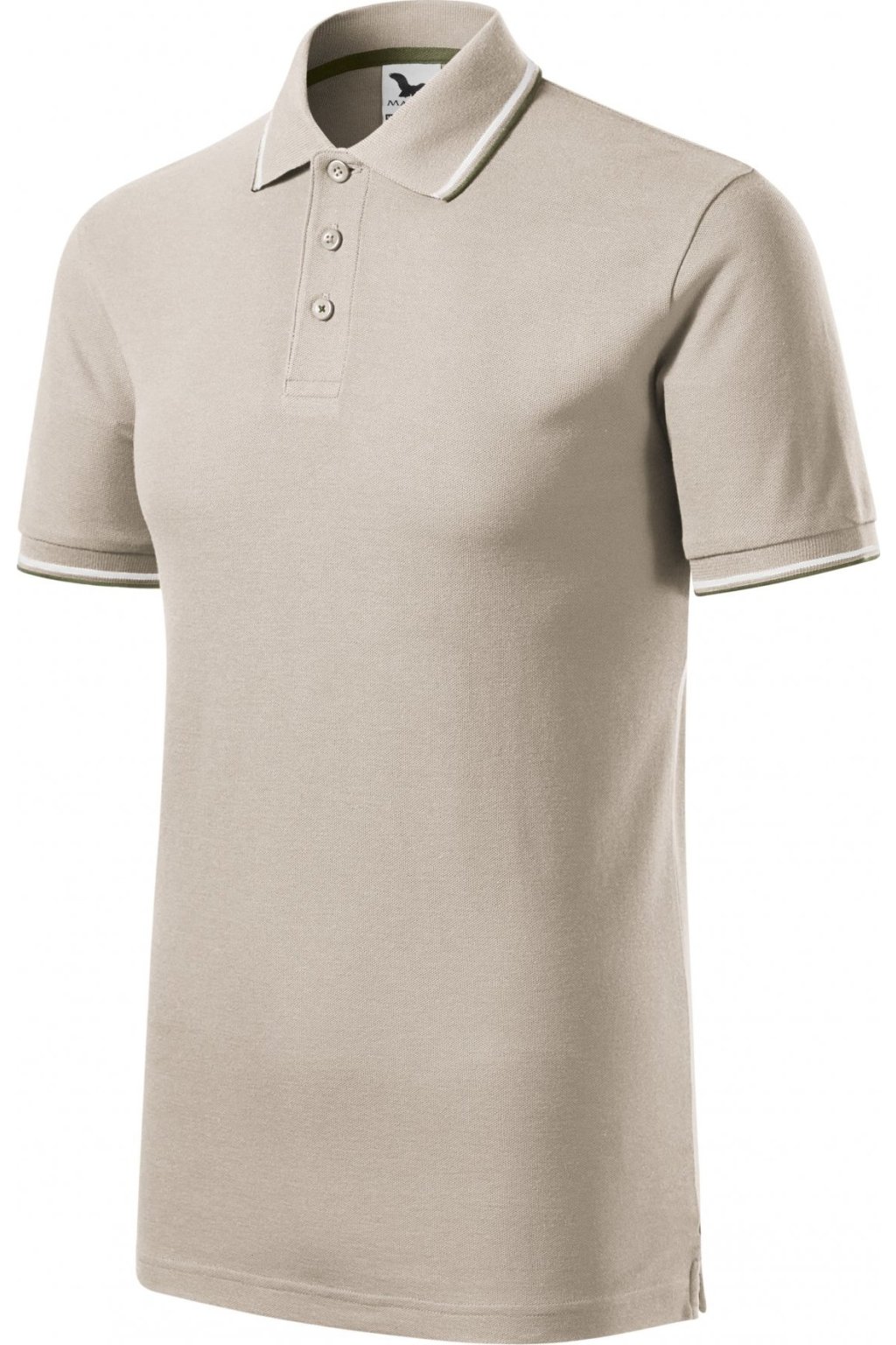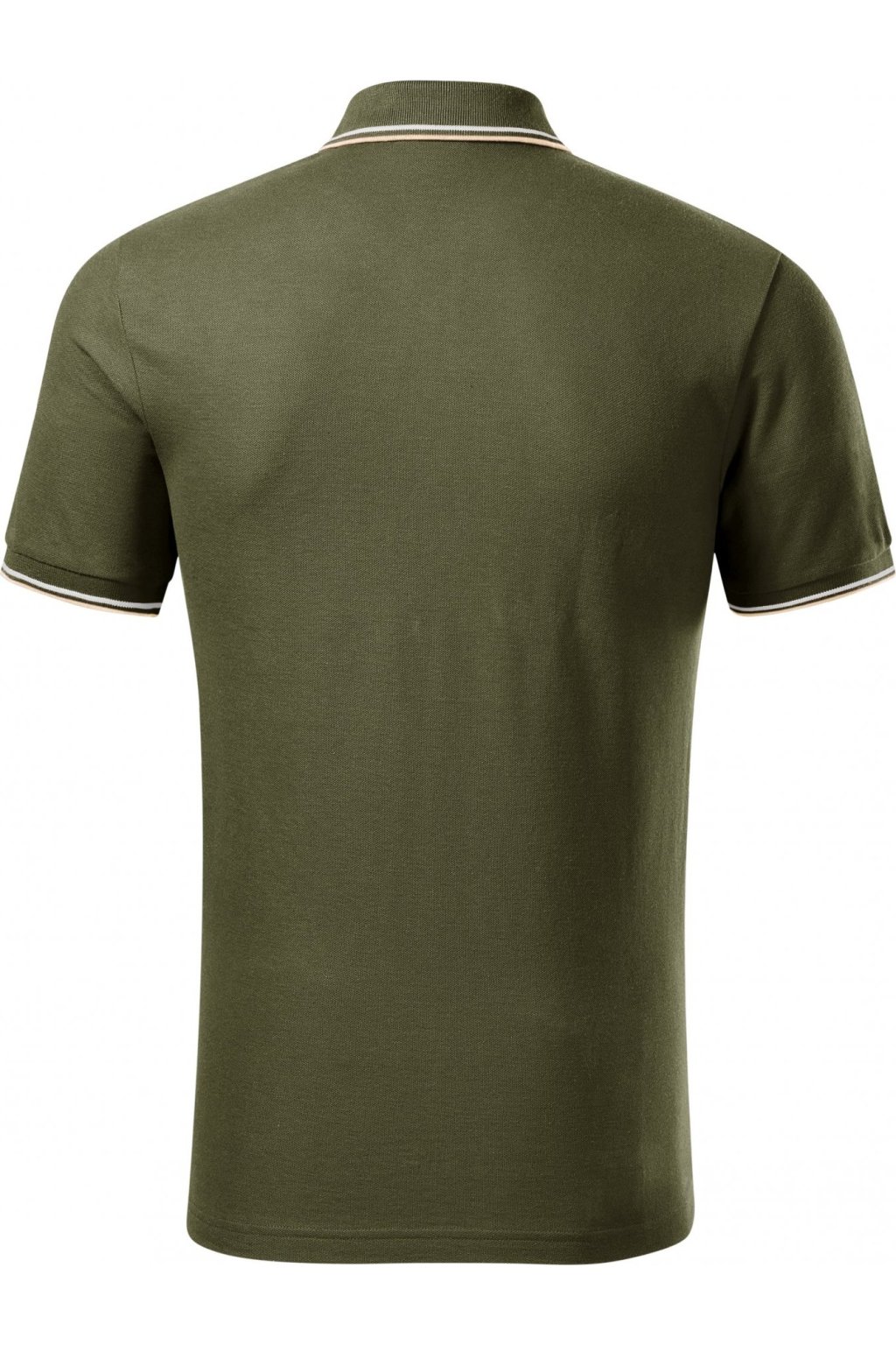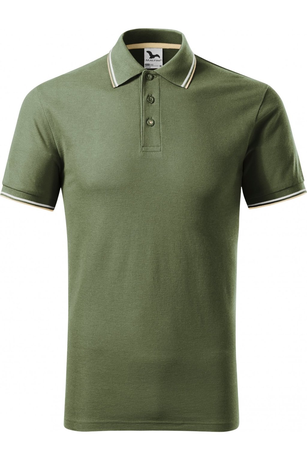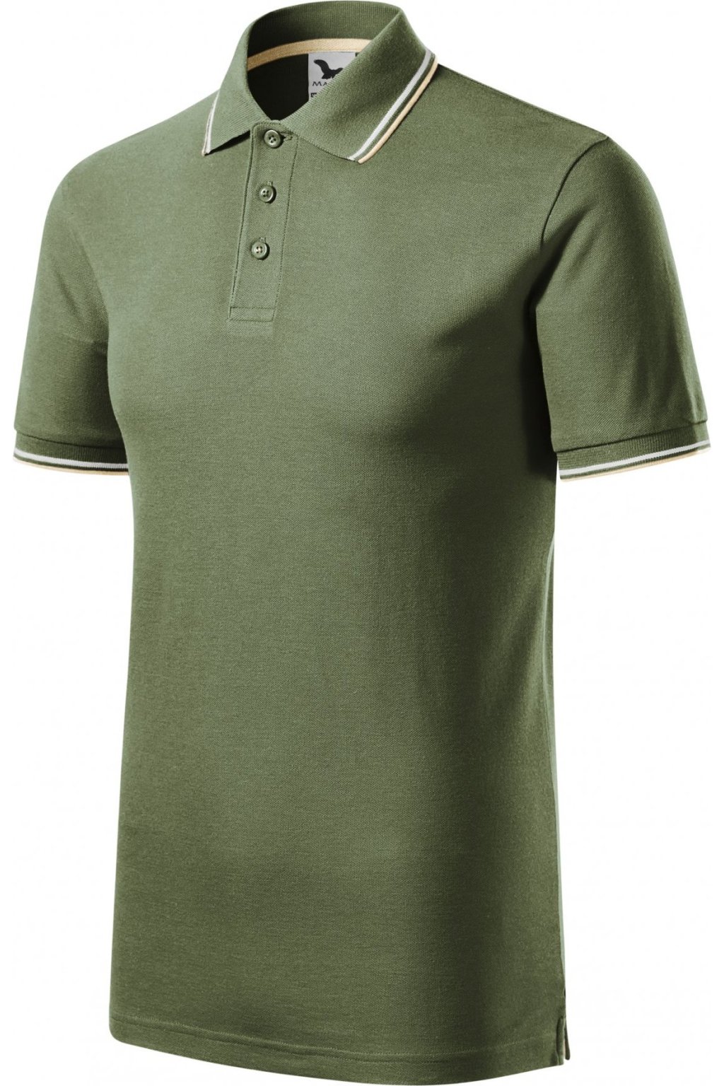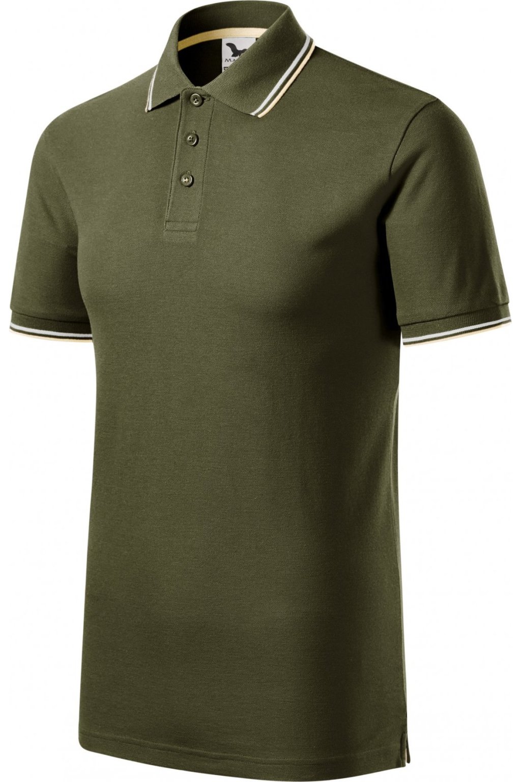 střih s bočními švy, límeček z žebrového úpletu 1:1, 2 kontrastní proužky na rukávu a límečku , léga s 3 knoflíčky v barvě materiálu, spodní knoflíček přišitý kontrastní nití, vnitřní průkrčník začištěn kontrastní páskou, zpevnění ramenních švů páskou, rozparky v bočních švech s kontrastní páskou, zboží II. jakosti, na zboží II. jakosti se nevztahuje reklamace