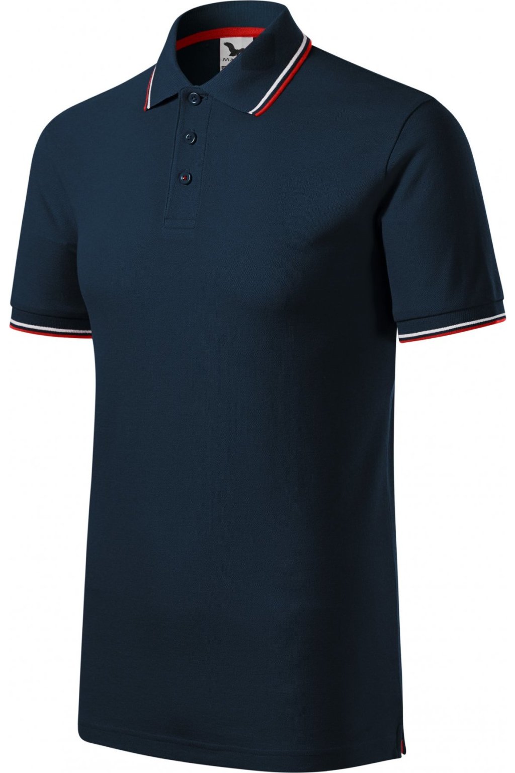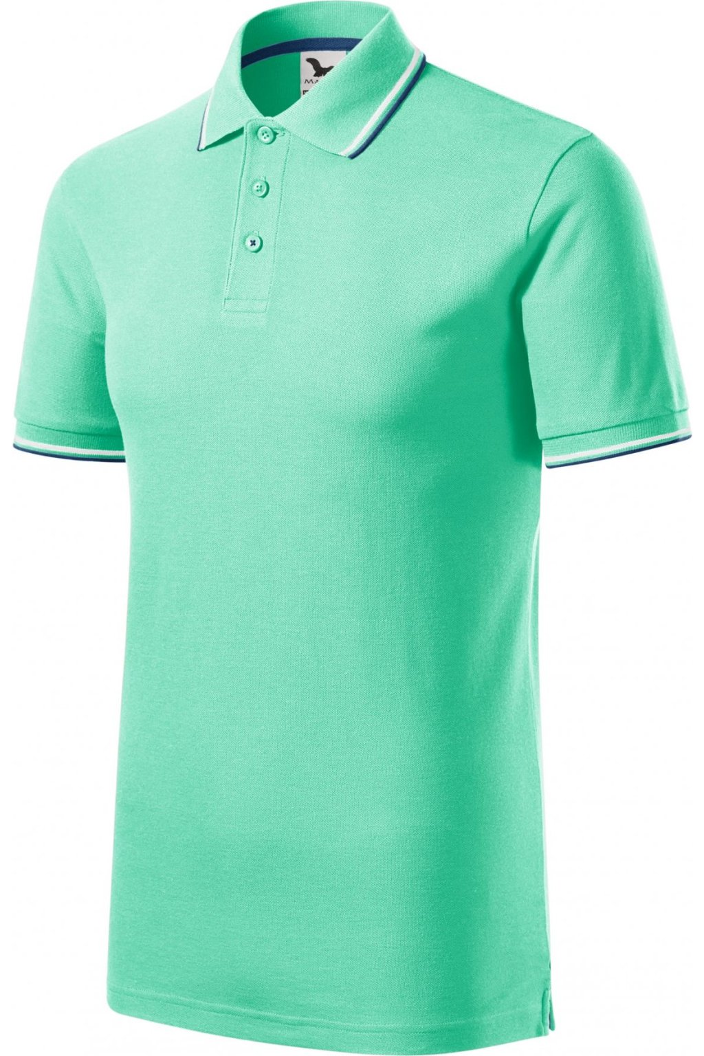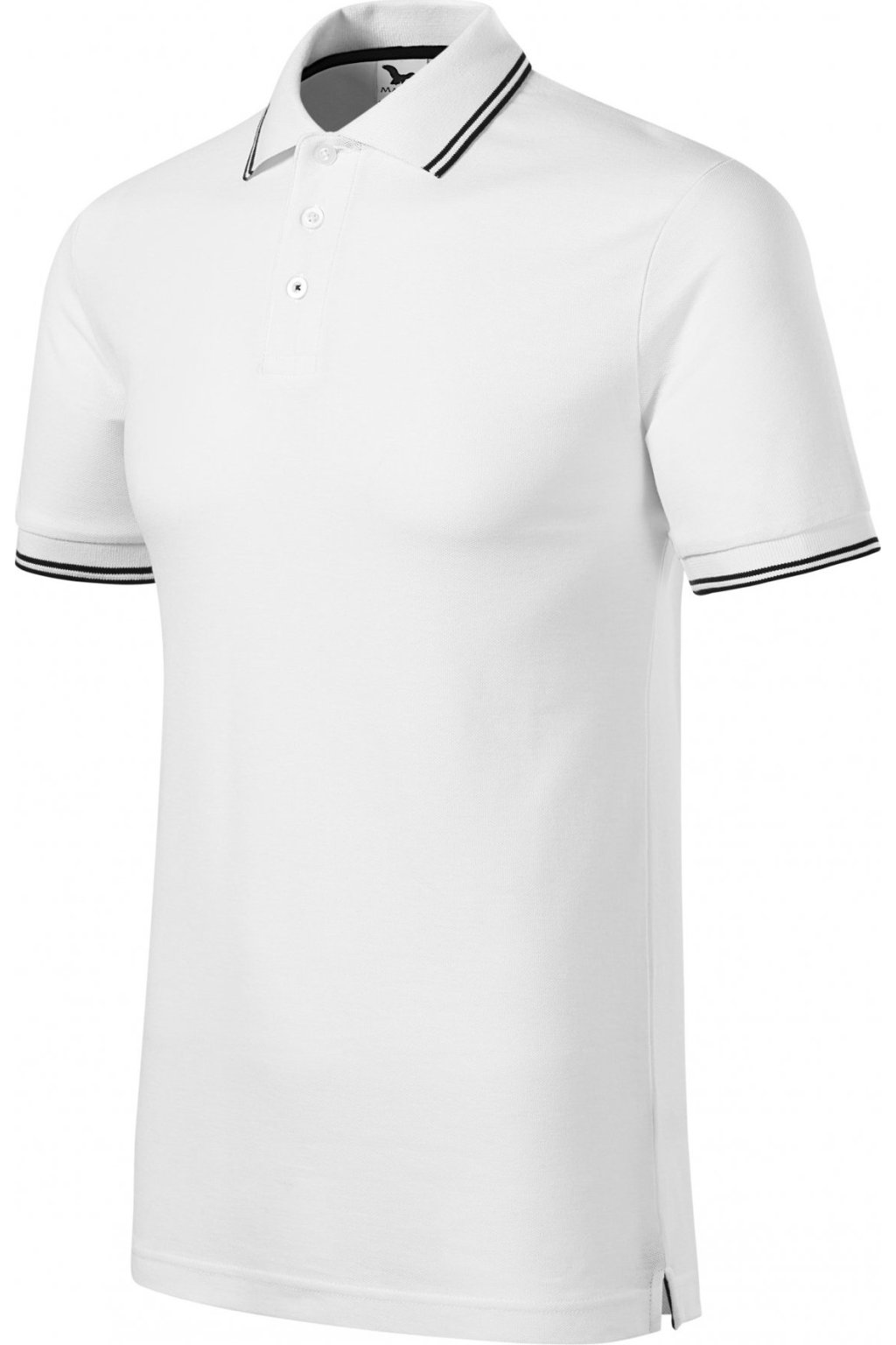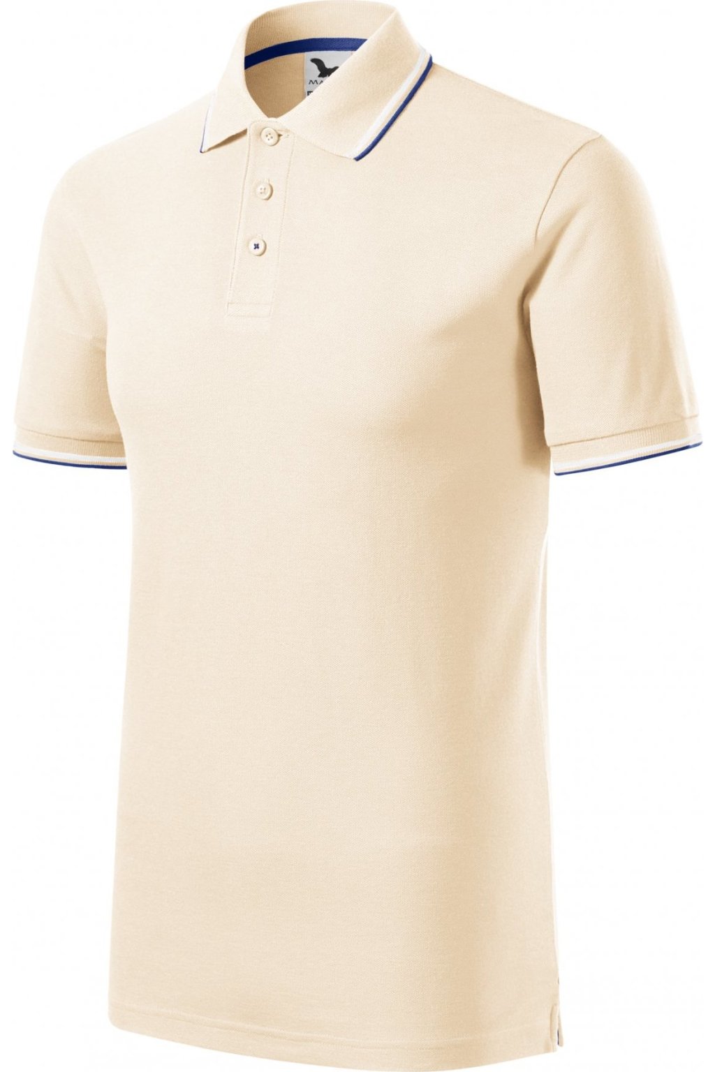 střih s bočními švy, límeček z žebrového úpletu 1:1, 2 kontrastní proužky na rukávu a límečku , léga s 3 knoflíčky v barvě materiálu, spodní knoflíček přišitý kontrastní nití, vnitřní průkrčník začištěn kontrastní páskou, zpevnění ramenních švů páskou, rozparky v bočních švech s kontrastní páskou, zboží II. jakosti, na zboží II. jakosti se nevztahuje reklamace
