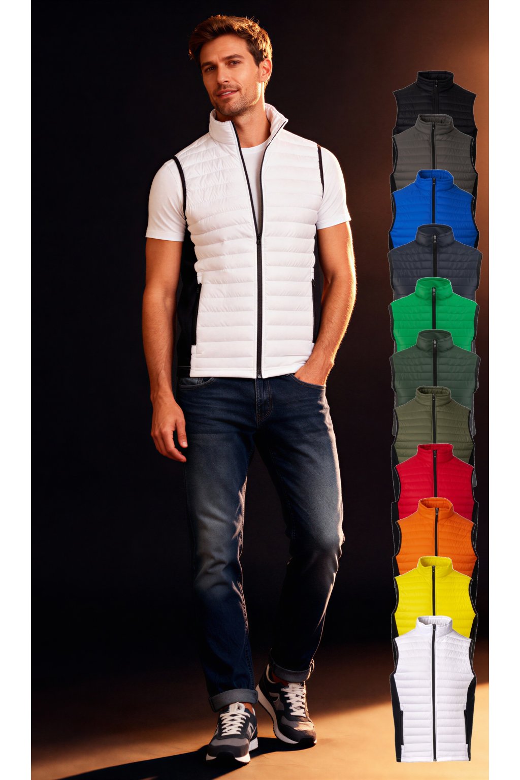 Pánská zateplená vesta (120g/m²), softshellové boky, zapínání na plastový zip s kovovým jezdcem „semi-auto lock“ a přizpůsobeným taháčkem.