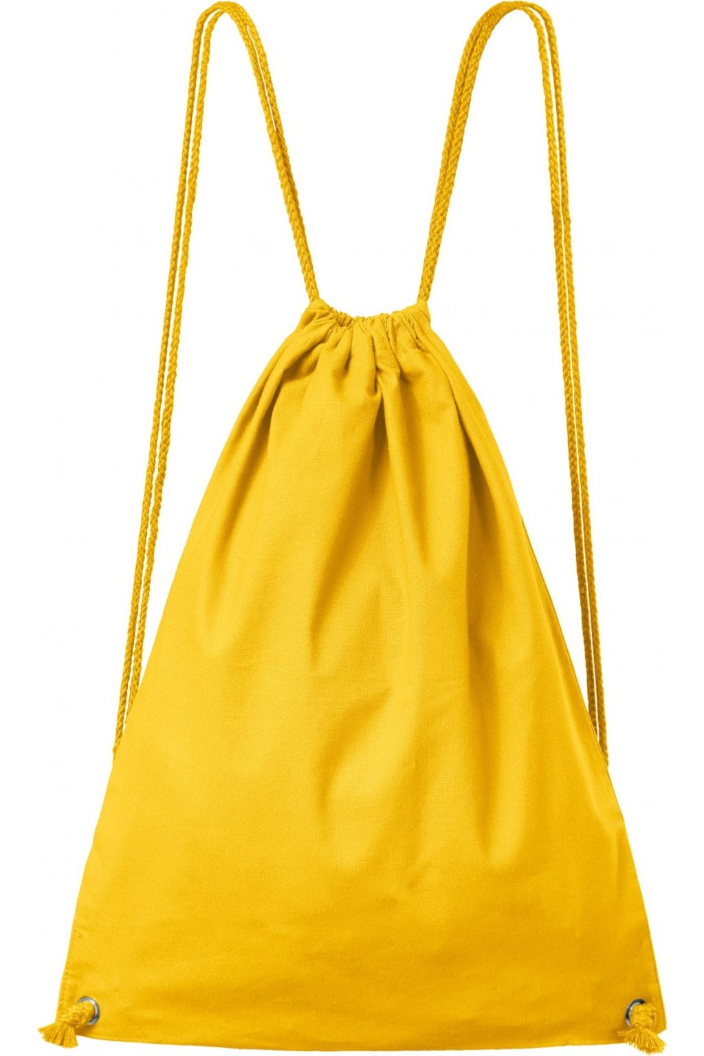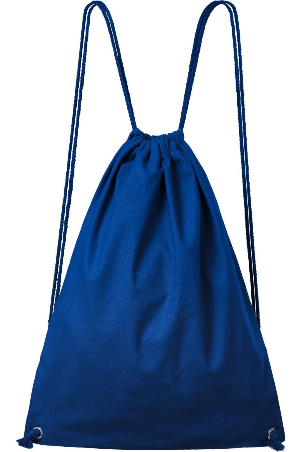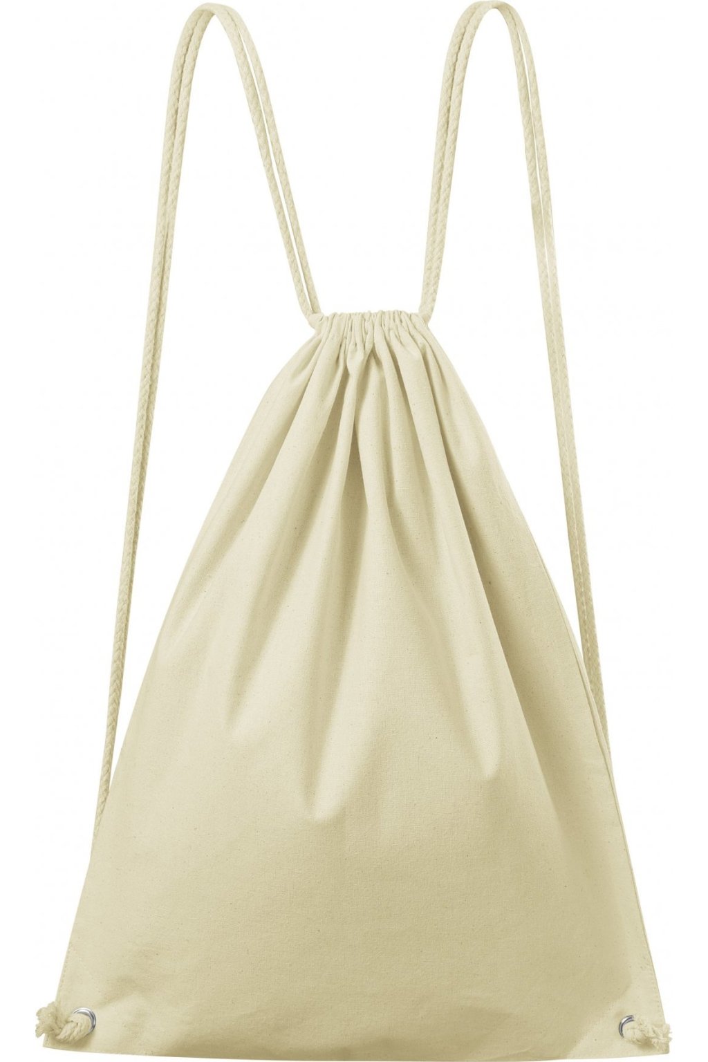 bavlněný tkaný batoh střední gramáže, zavírání na stahování, 2 bavlněné šňůrky v barvě vrchového materiálu, zpevněné dolní rohy dvojitým materiálem a kovovými kroužky, vnitřní kapsa na zip 20 x 23 cm, rozměry batohu 47 x 37 cm