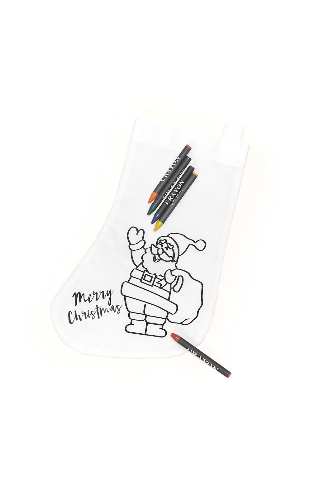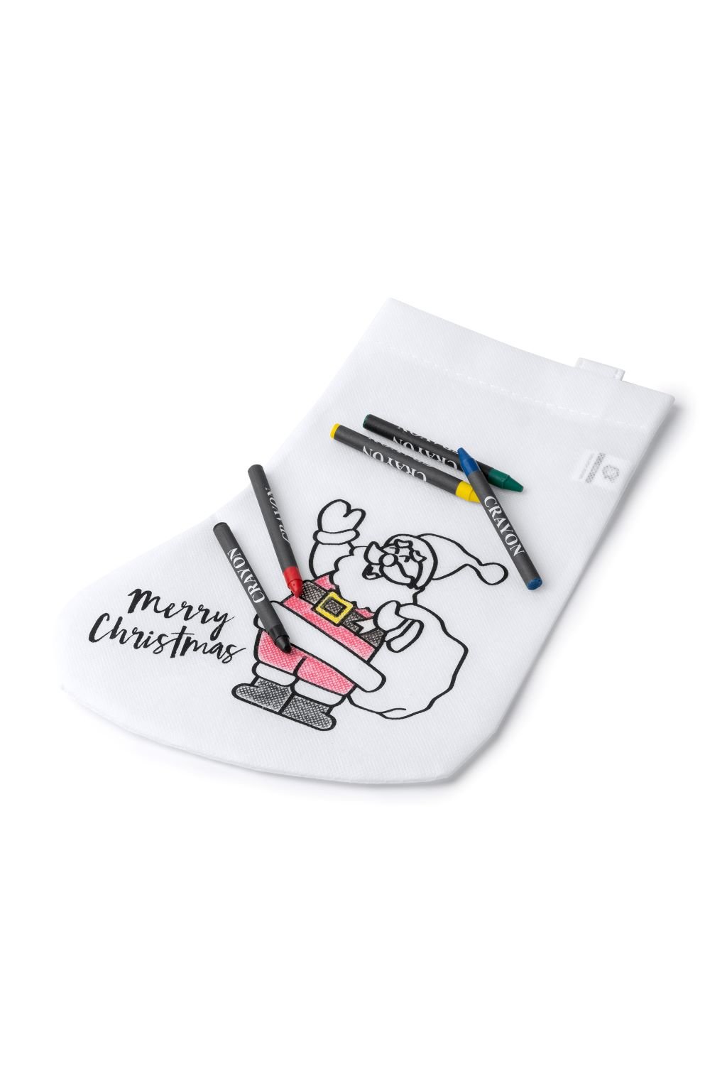 Vánoční punčocha s 5 různými pastelkami k vybarvování. Vyrobeno z netkané textilie o gramáži 80 g/m².