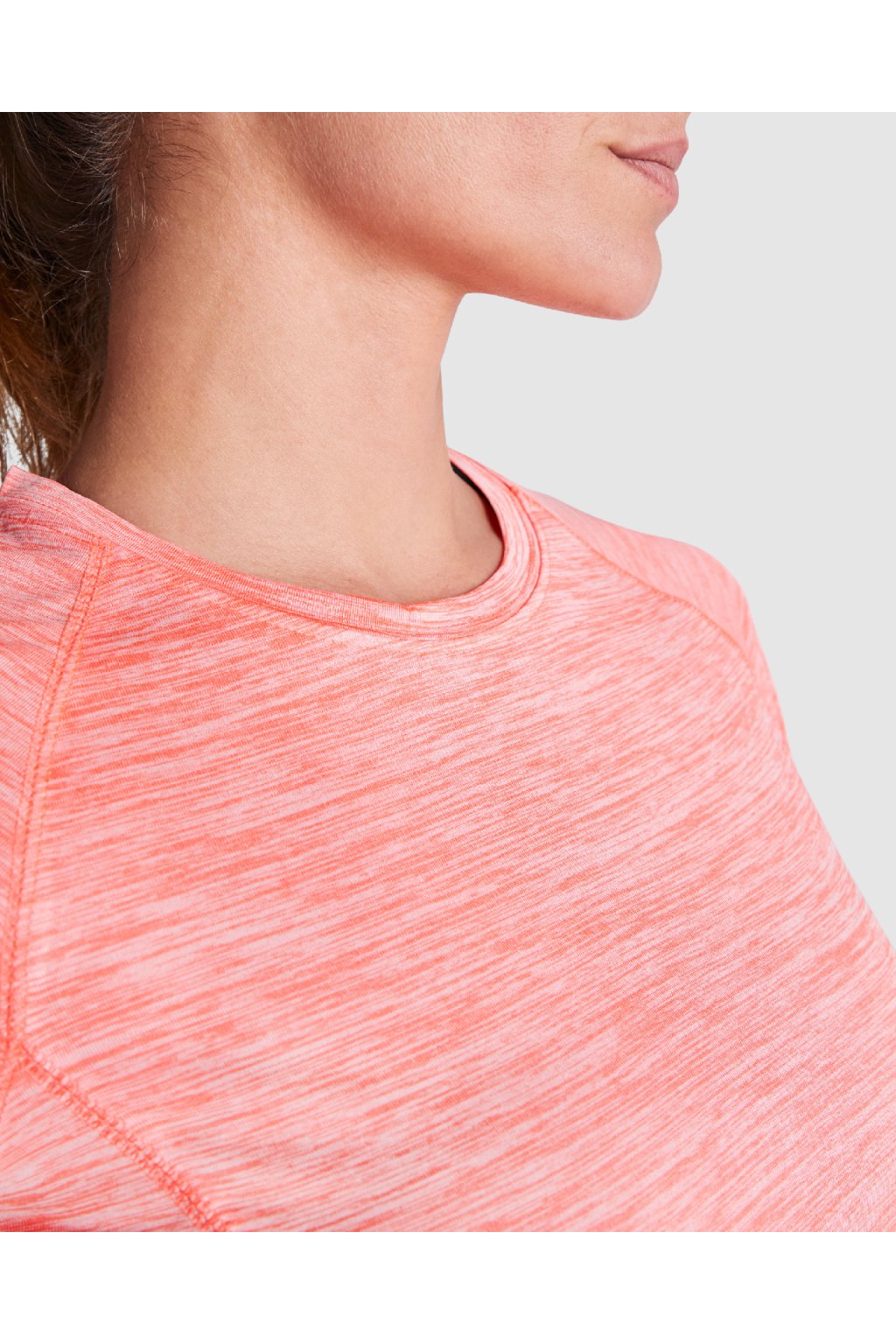 Dámské funkční tričko z polyesterového materiálu s krátkým rukávem raglánového stylu. Kulatý výstřih. Tričko z příjemné komfortní látky, která se snadno přizpůsobí tělu. Prodyšný rychleschnoucí model. Odnímatelný štítek. Funkční látka. Vhodné k sublimaci.