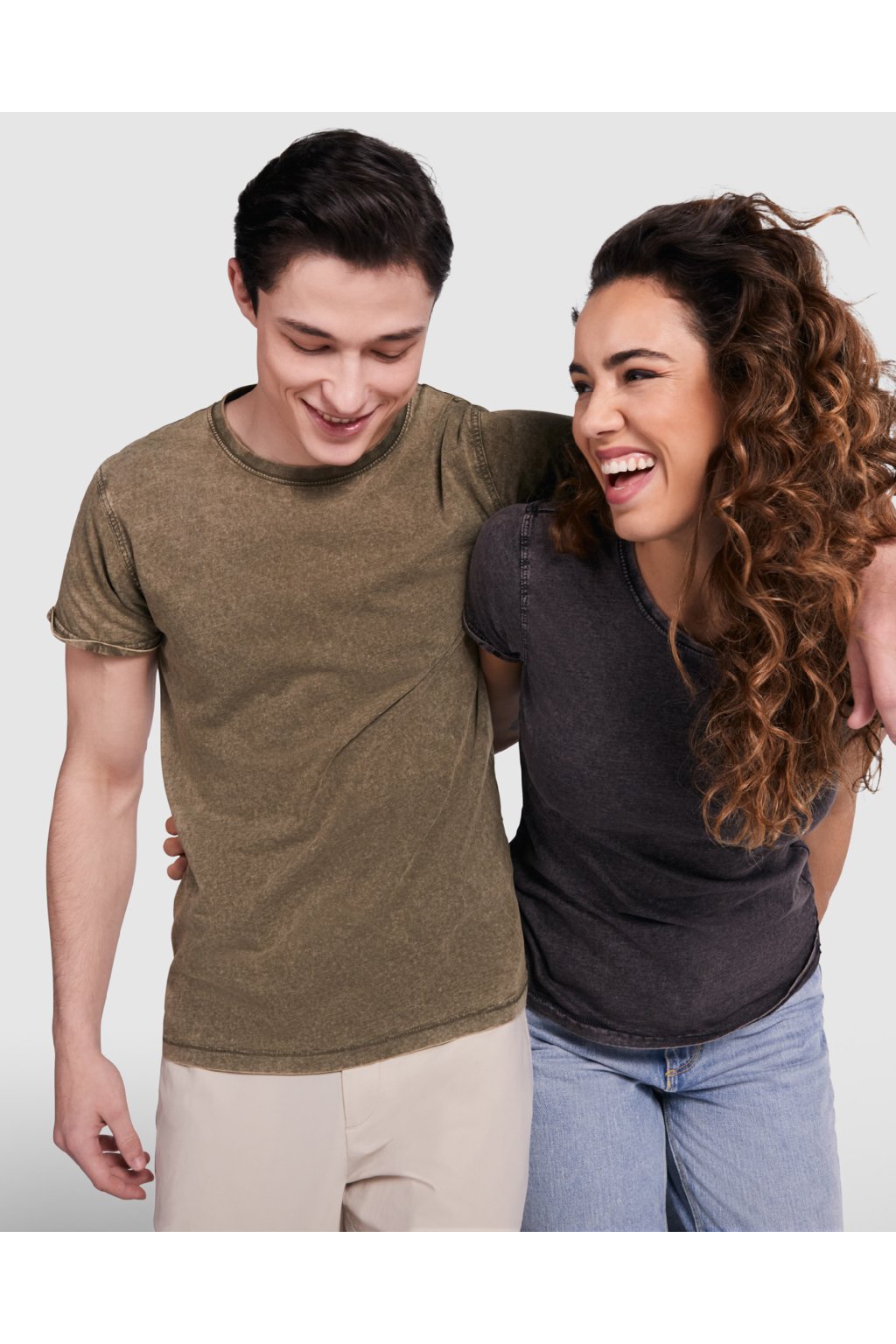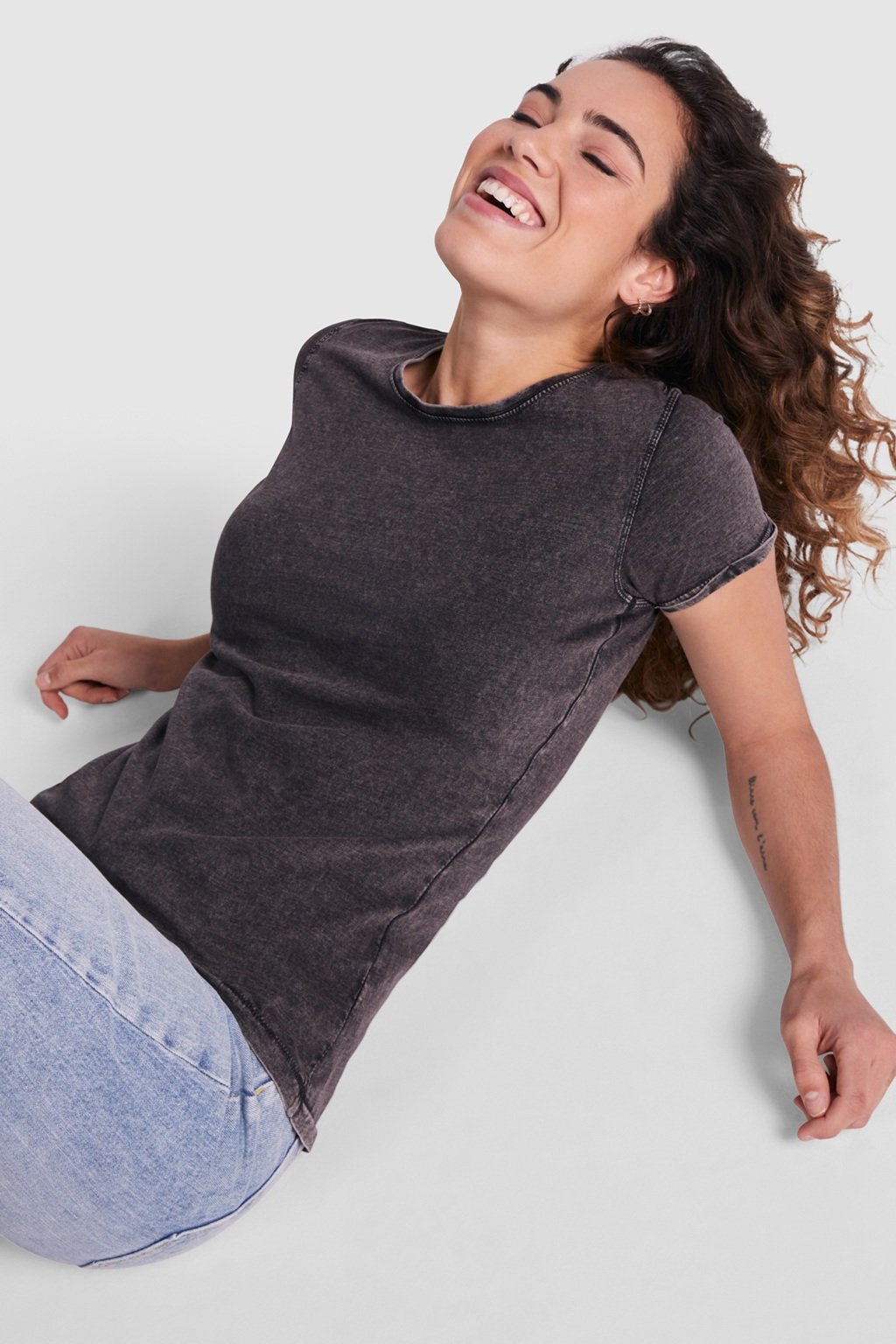 Tričko s krátkým rukávem džínového vzhledu. Kulatý výstřih s žebrovaným lemem 1x1 se zesíleným zakrytím švů na vnitřní straně od ramene k rameni. Dvojitý šev na průramcích. Otevření rukávu s ohrnutím.